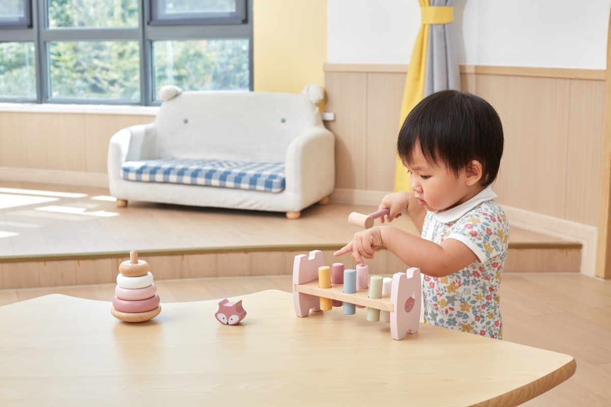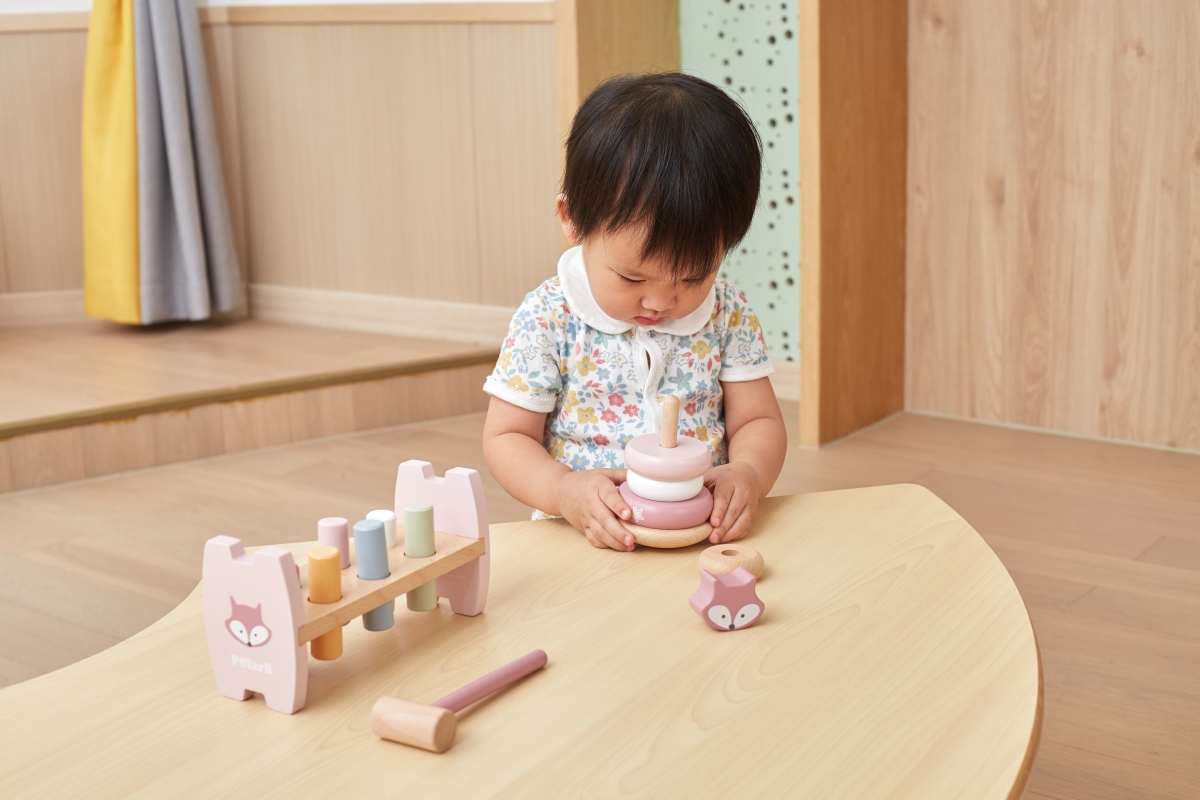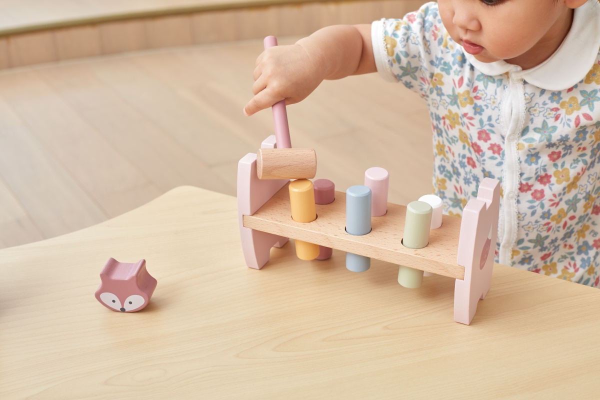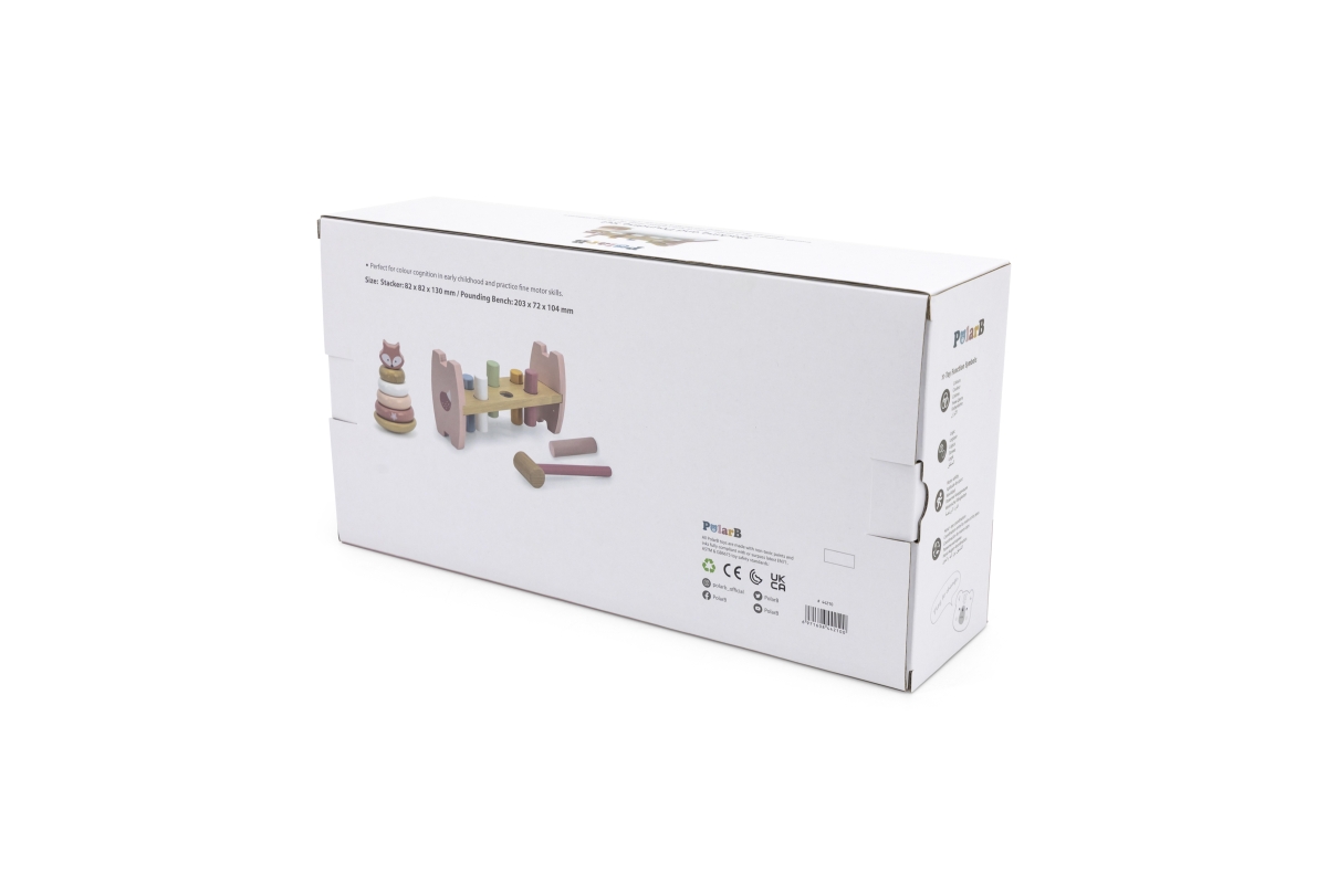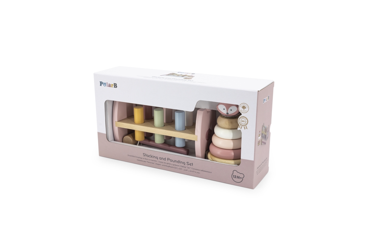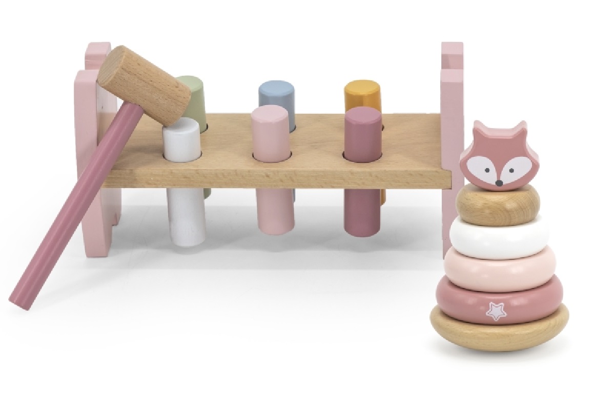 Dřevěná sada pro nejmenší obsahuje zatloukačku a skládací pyramidu s motivem lišky. Rozměry zatloukačky 20,3x7,2x10,4 cm, rozměry pyramidy 8,2x8,2x13 ..