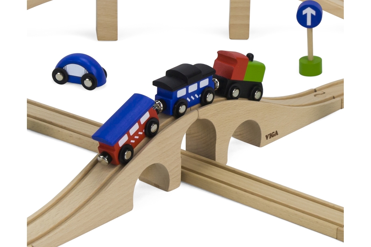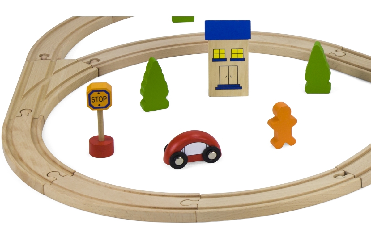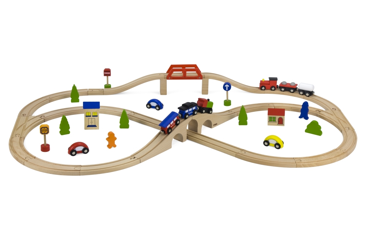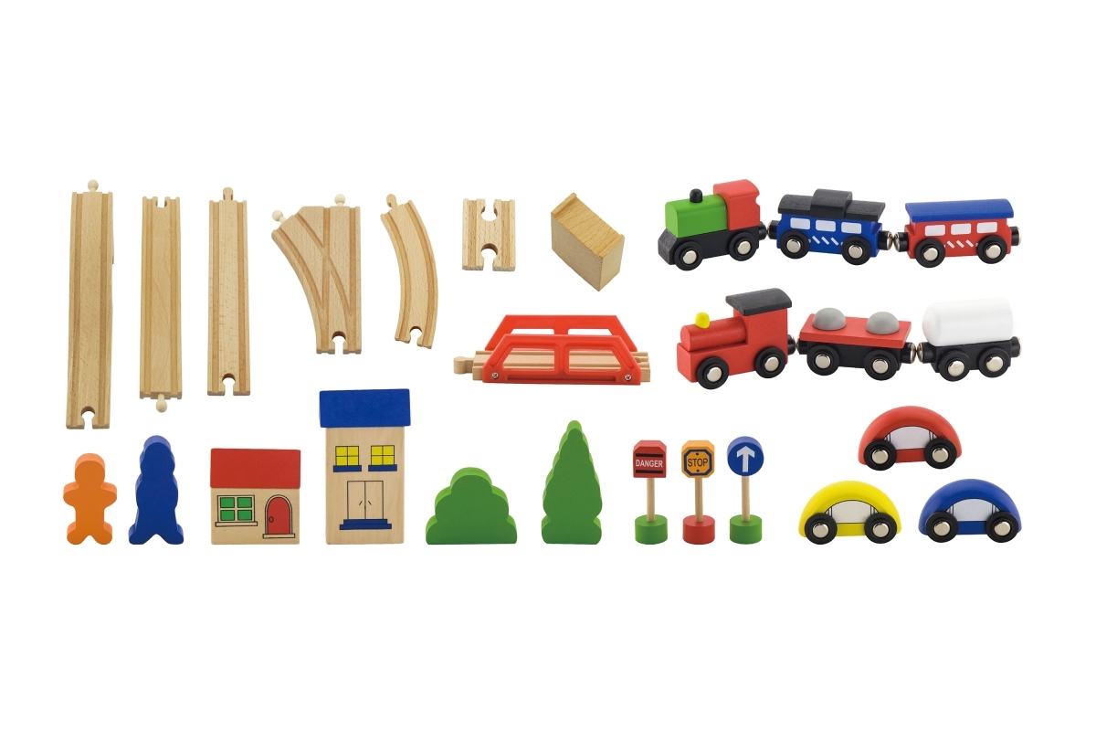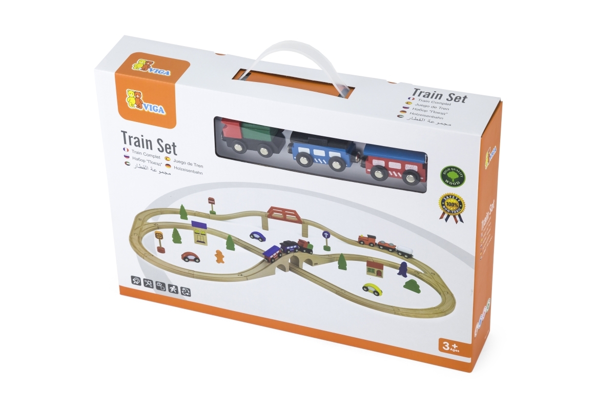 Dřevěná vláčkodráha o velikosti cca 105 x 64 x 11 cm. Balení obsahuje celkem 49 kusů - koleje, 2 lokomotivy, 4 vagóny, 3 autíčka a další doplňky. Rozm..