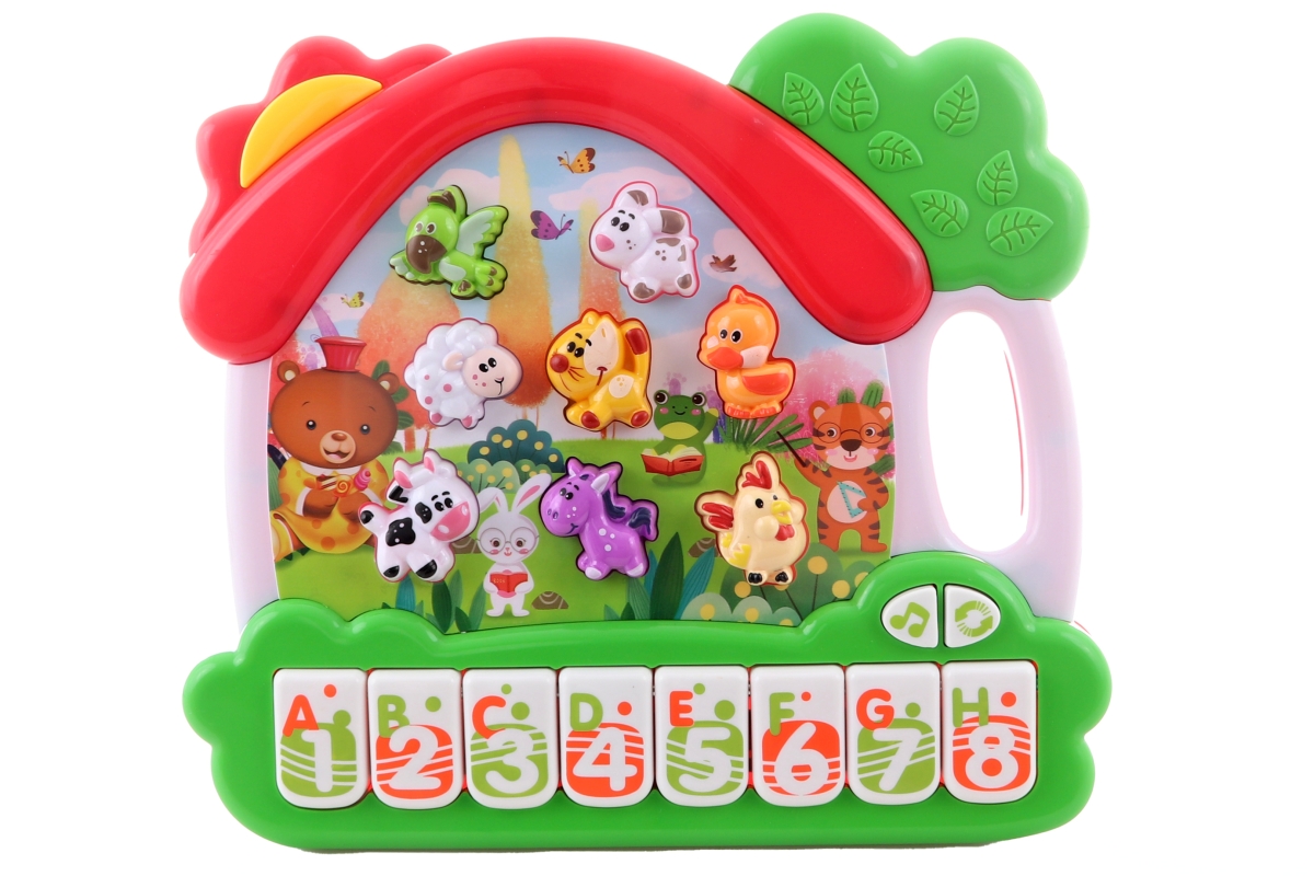 Piánko domeček se zvířátky. Materiál plast. Piánko má 8 tlačítek se zvuky zvířátek a 8 tlačítek s čísly (mluví anglicky). Napájení na 3xAA baterie, kt..