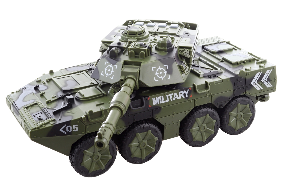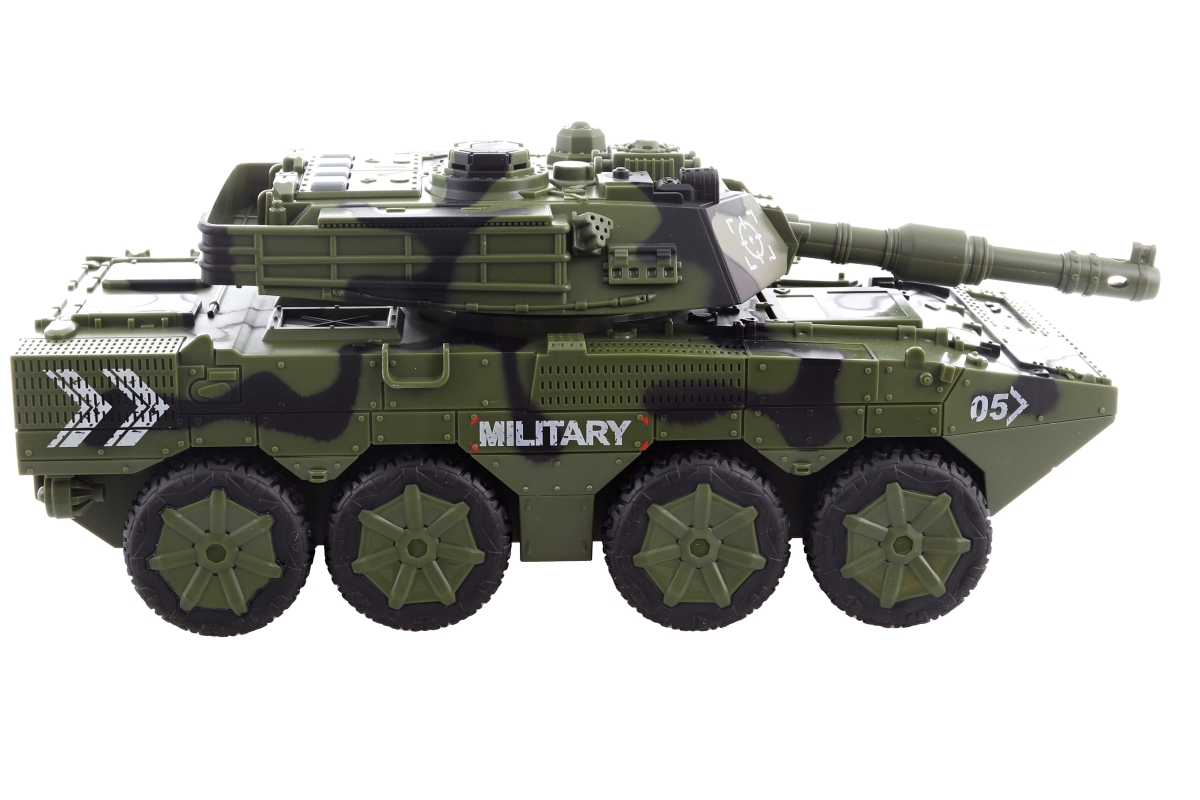 Tank na baterie. Napájení na 3xAG13 baterie, které jsou součástí balení. Tank je na setrvačník. Materiál plast. Na střeše 4 tlačítka se zvuky. Baleno ..