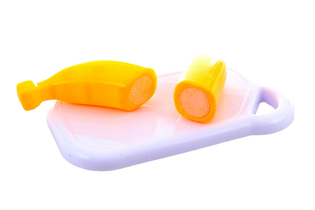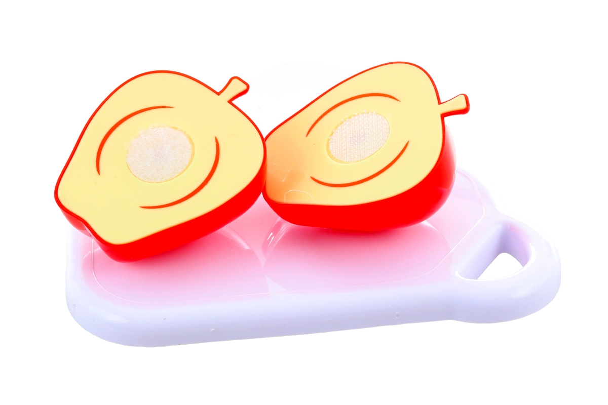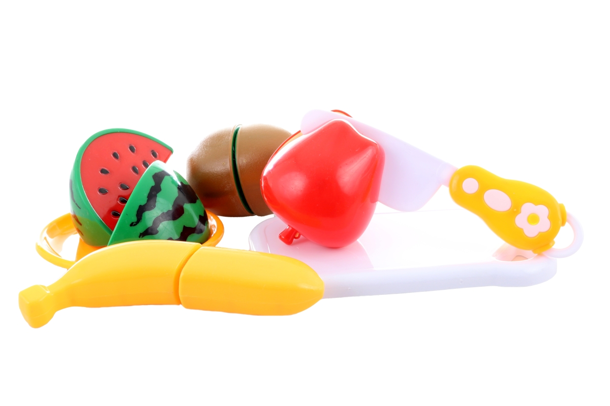 Plastová sada krájení ovoce. Balení obsahuje 4 druhy ovoce, talířek, prkénko a nožík. Ovoce je rozpůlené a poloviny k sobě spojené suchým zipem. Balen..