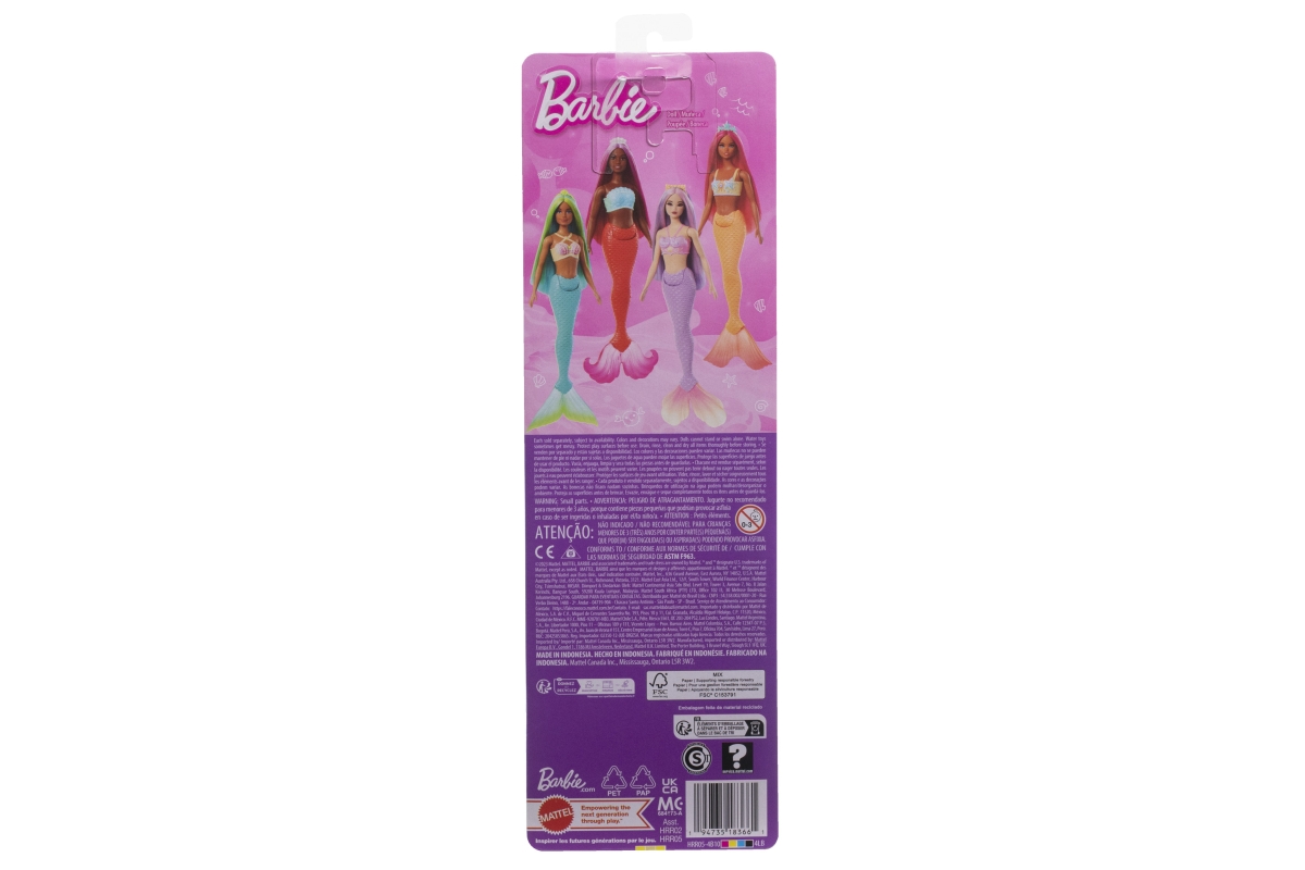Děti si zamilují snění o kouzelných podmořských příbězích s krásnými panenkami Barbie® mořskými pannami! Každá mořská panna má trup inspirovaný mušlemi, vytvarovaný ocas a vlasy v pohádkových barvách zdobené doplňky. Děti od 3 let mohou sbírat různé mořské panny a vydávat se na různá vodní dobrodružství! Každá se prodává samostatně v závislosti na dostupnosti. Panenky Barbie® nemohou plavat ani stát samostatně. Barvy a provedení dekorací se mohou lišit. Věk 3+