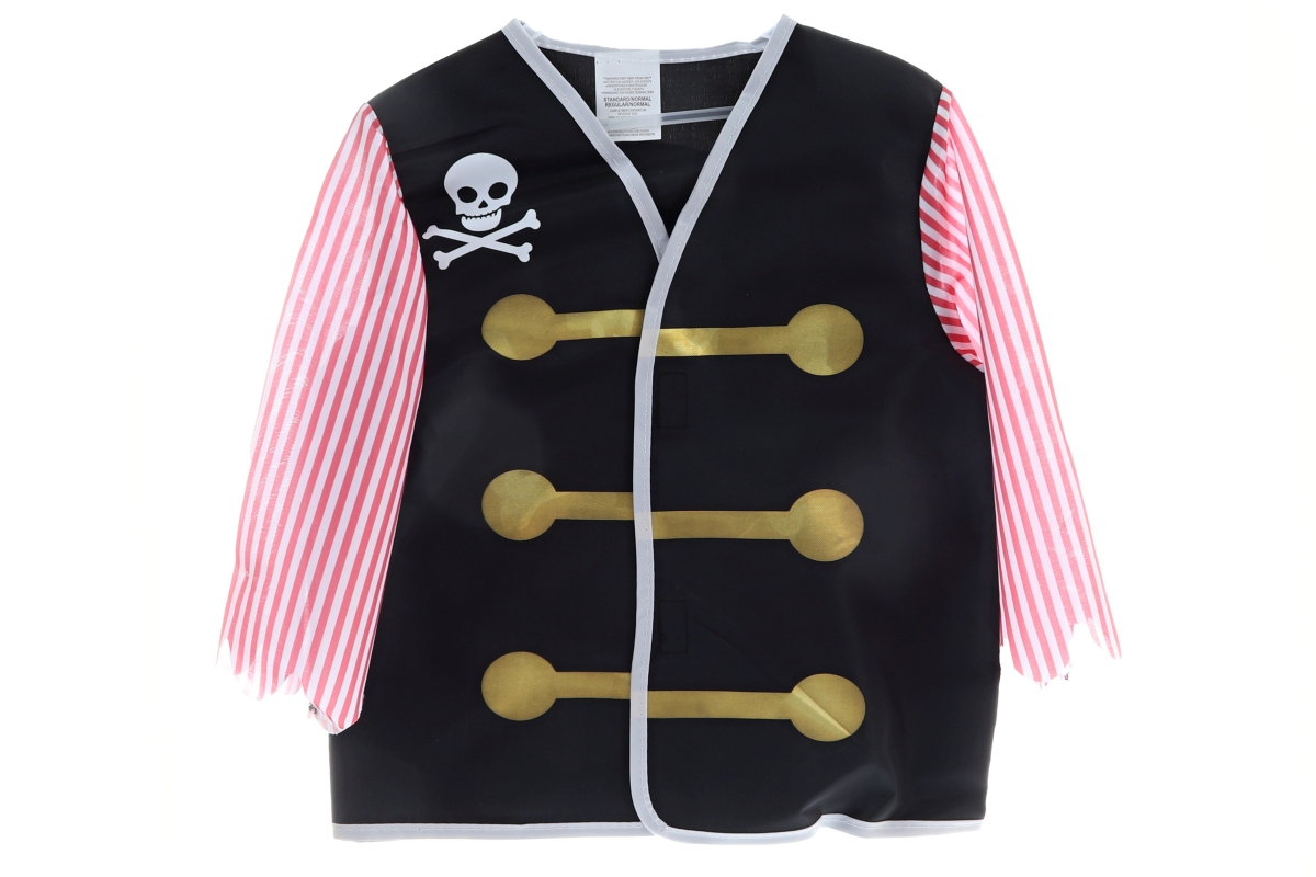 Kostým pirát. Sada obsahuje plášť, šavli, dalekohled, pásku přes oko a klobouk s lebkou. Rozměry plášťě cca 37x44 cm. Délka rukávu od ramene 31 cm. Da..