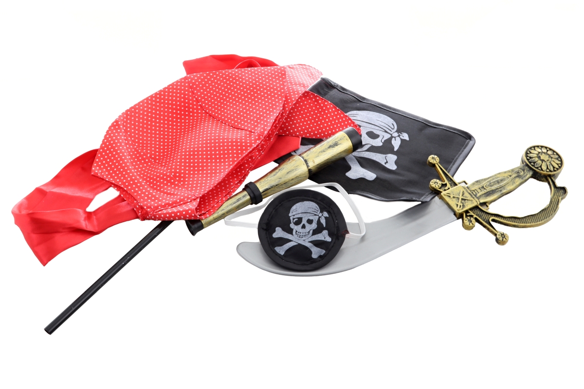 Kostým pirát. Balení obsahuje plášť+šortky, šavli, vlajku, šátek na hlavu, pásek a pásku na oko. Rozměry pláště cca 38x50 cm, délka rukávu od ramene 30 cm. Rozměry šortek - pas 23cm (lze natáhnout až na 36 cm), délka 47 cm. Materiál polyester+plast. Baleno v sáčku. Rozměry balení cca 37x52x4 cm. Věk 3+