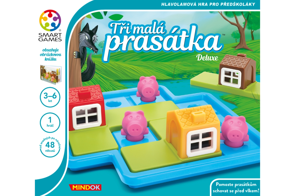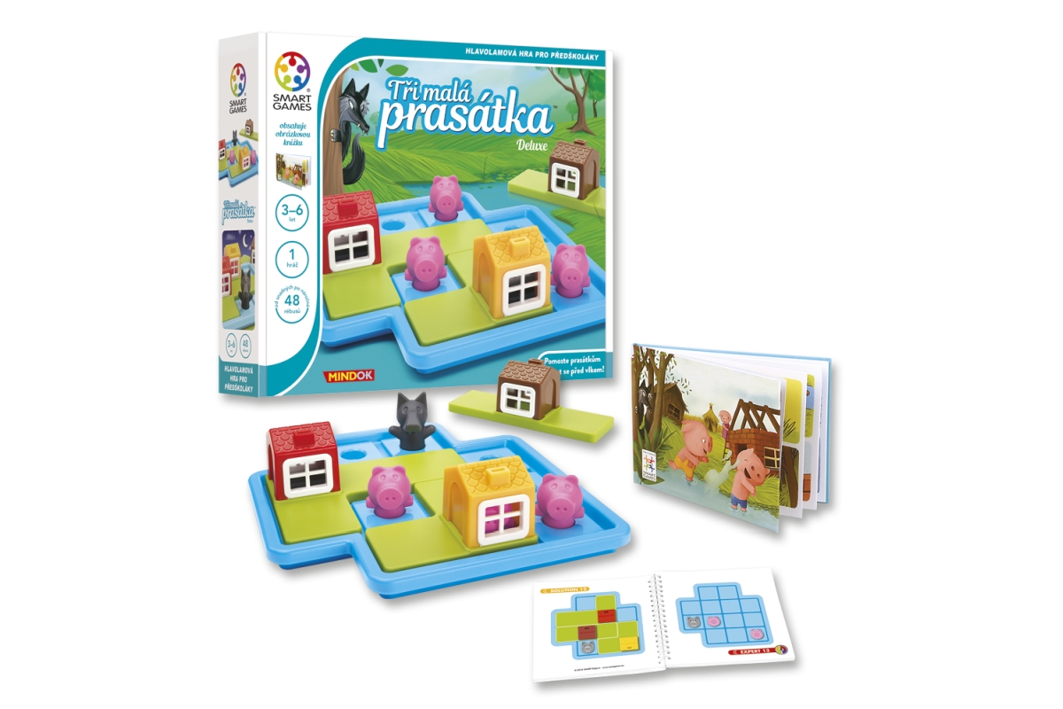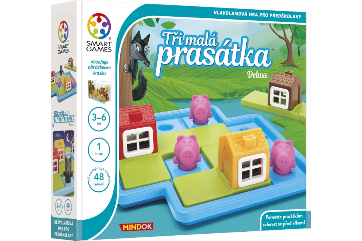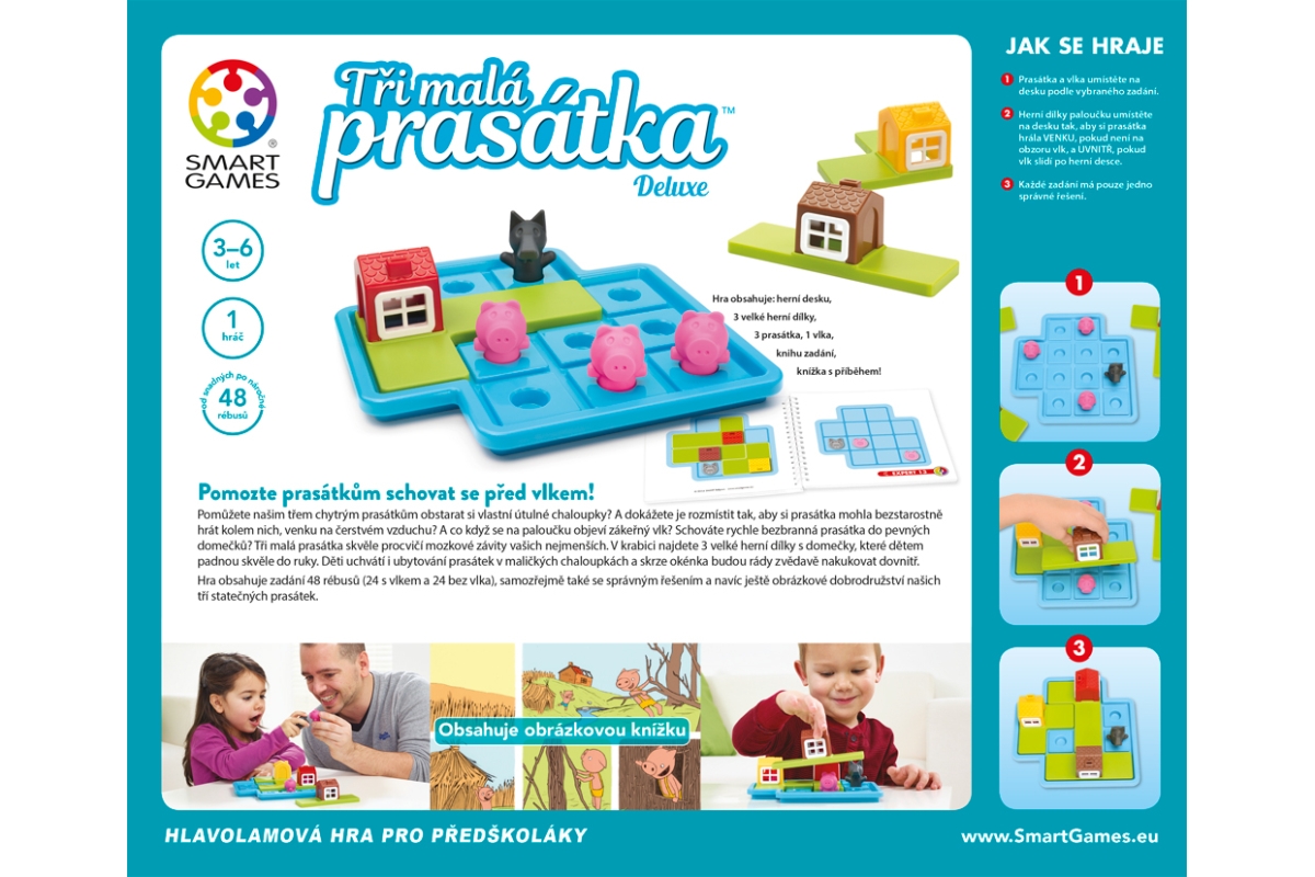 Pomůžete našim třem chytrým prasátkům obstarat si vlastní útulné chaloupky? A dokážete je rozmístit tak, aby si prasátka mohla bezstarostně hrát kolem nich, venku na čerstvém vzduchu? A co když se na paloučku objeví zákeřný vlk? Schováte rychle bezbranná prasátka do pevných domečků? Tři malá prasátka skvěle procvičí mozkové závity vašich nejmenších. V krabici najdete 3 velké puzzle dílky s domečky, které dětem padnou skvěle do ruky. Děti uchvátí i ubytování prasátek v maličkých chaloupkách a skrze okénka budou rády zvědavě nakukovat dovnitř. Hra obsahuje zadání 48 rébusů (24 s vlkem a 24 bez vlka), samozřejmě také se správným řešením a navíc ještě obrázkové dobrodružství našich tří statečných prasátek. Hra pro 1 hráče. Věk 3+