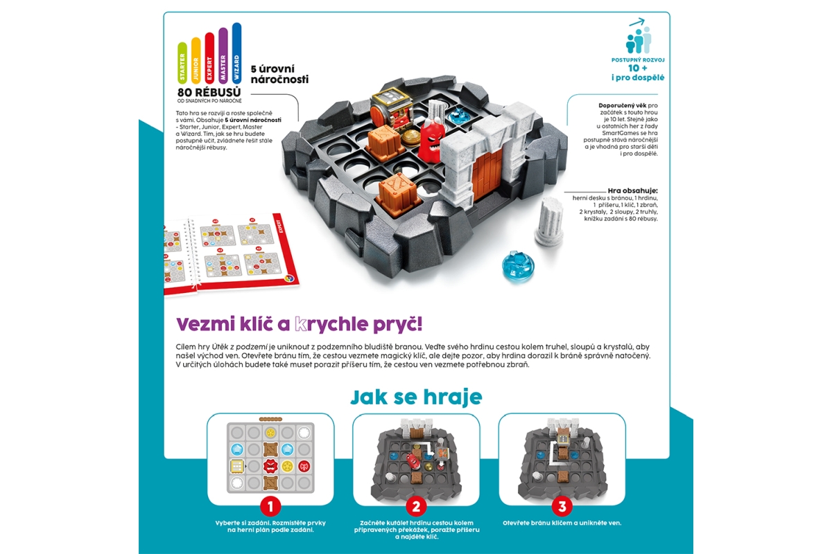 Vezmi klíč a (k)rychle pryč! Cílem hry Útěk z podzemí je uniknout z podzemního bludiště branou. Veďte svého hrdinu cestou kolem truhel, sloupů a krystalů, aby našel východ ven. Otevřete bránu tím, že cestou vezmete magický klíč, ale dejte pozor, aby hrdina dorazil k bráně správně natočený. V určitých úlohách budete také muset porazit příšeru tím, že cestou ven vezmete potřebnou zbraň. Určeno pro 1 hráče. Věk 10+