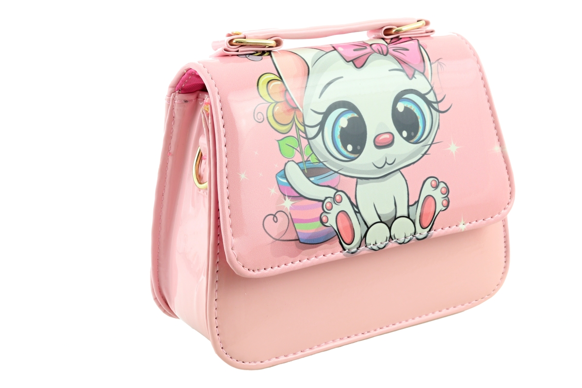 Kabelka s motivem roztomilé kočičky. Lesklý materiál. Uvtnitř kabelky 1 přihrádka, zapínání na druk. Rozměry kabelky 17x16x7 cm. Baleno v sáčku. Výrob..