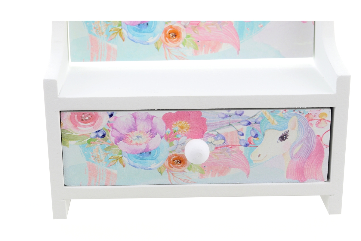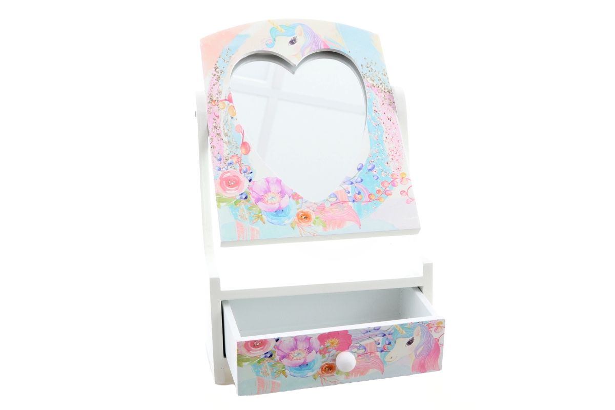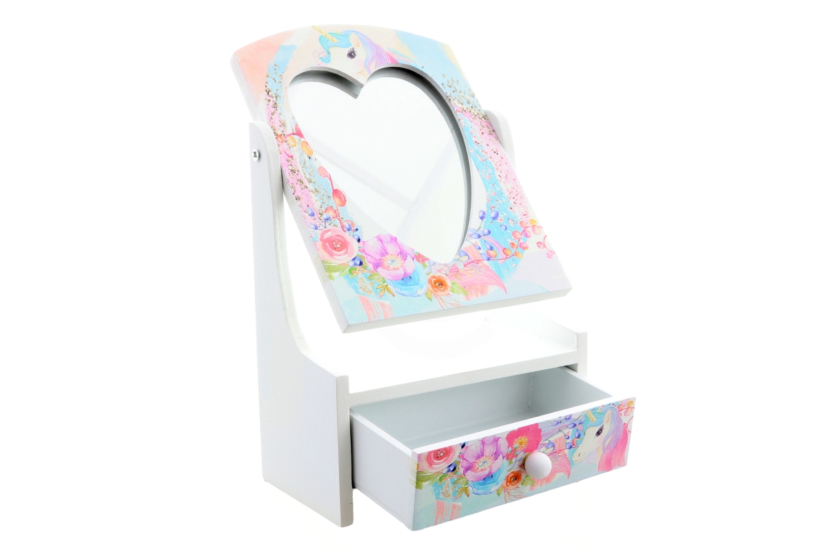 Dřevěná šperkovnice se zrcátkem ve tvaeu srdíčka. V dolní části šuplíček s motivem jednorožce. Baleno v krabičce. Rozměry balení cca 15x23x10 cm. Rozm..