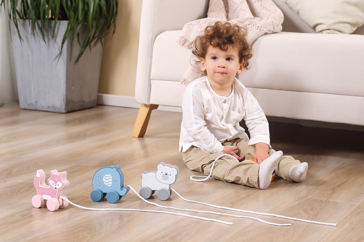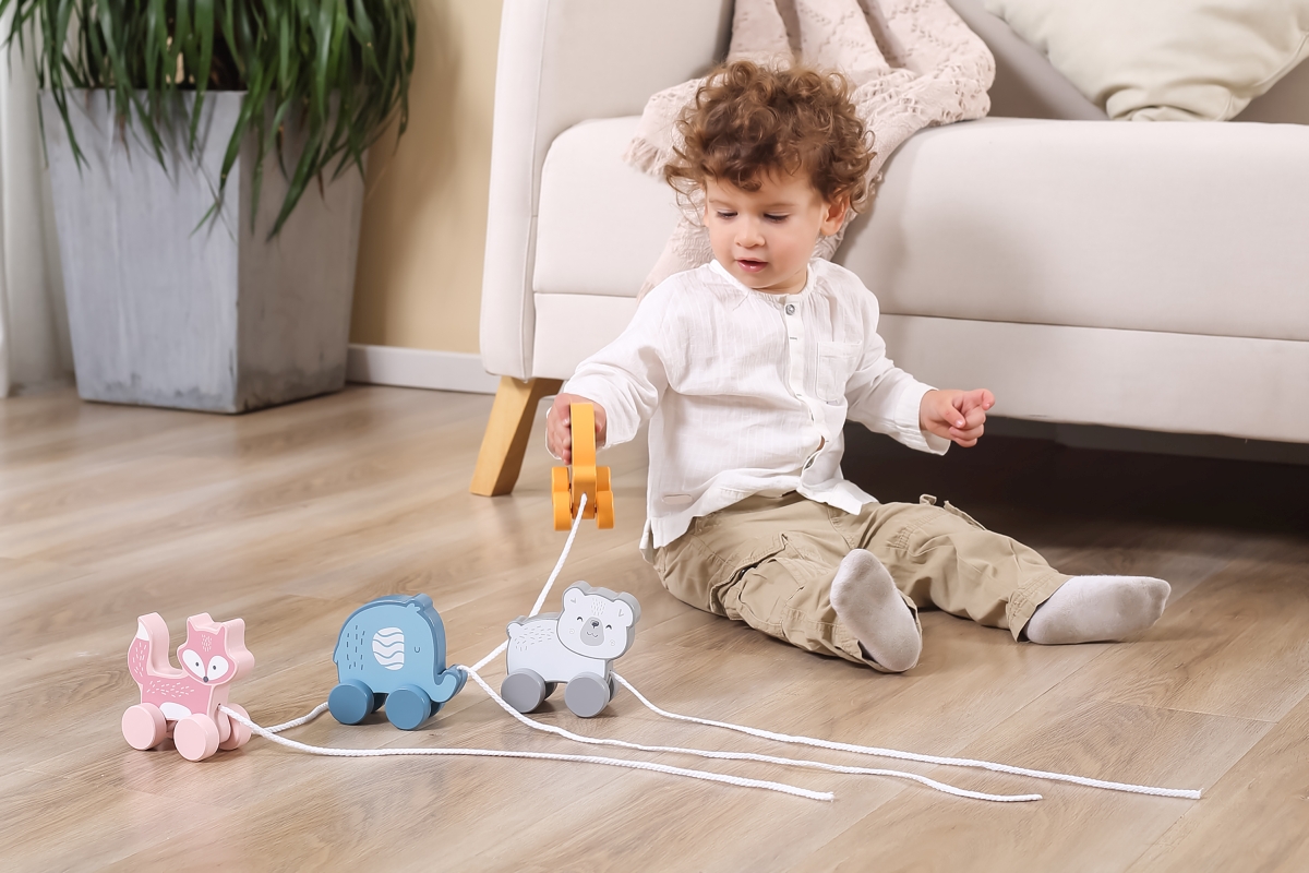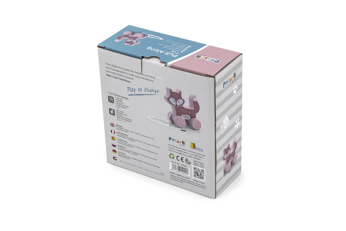 Dřevěná tahačka o rozměru cca 11,4 x 11 x 5,5 cm. Rozměry balení cca 15 x 15,5 x 6,5 cm. Věk 18m+..