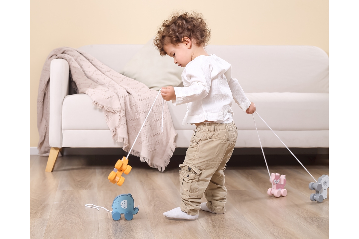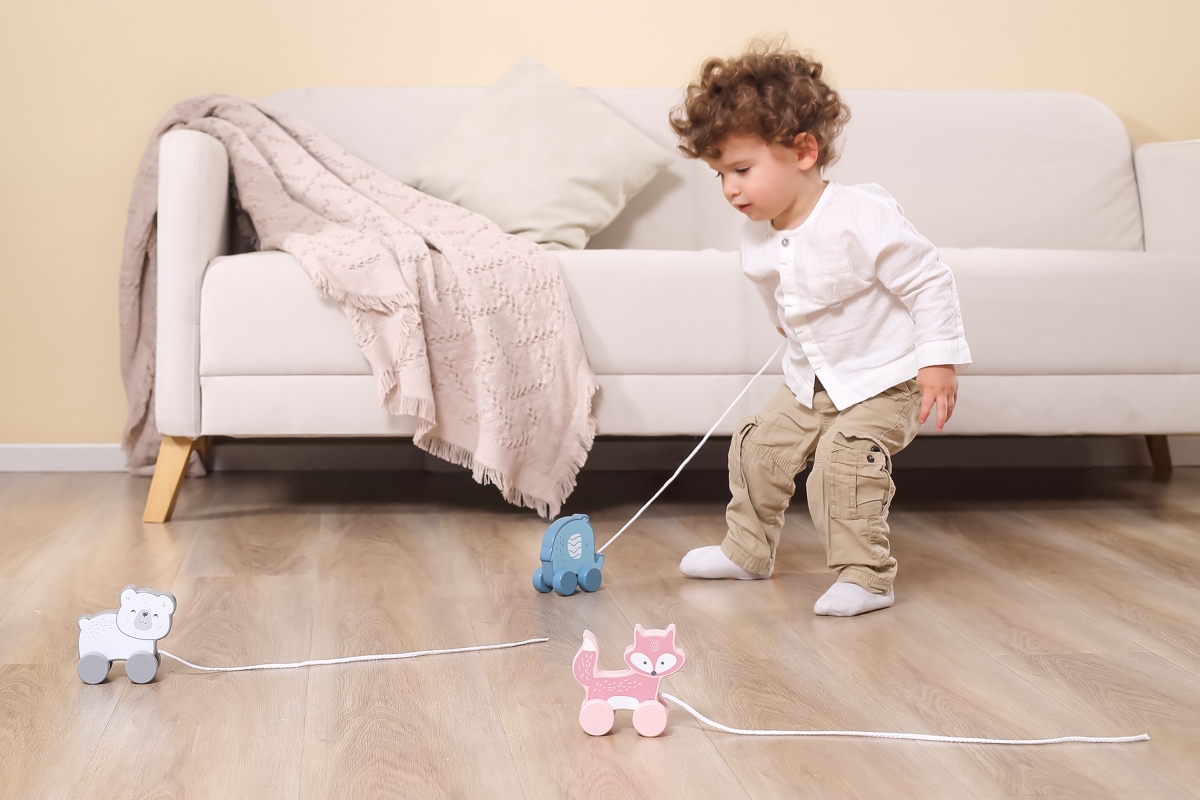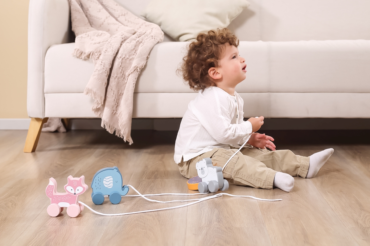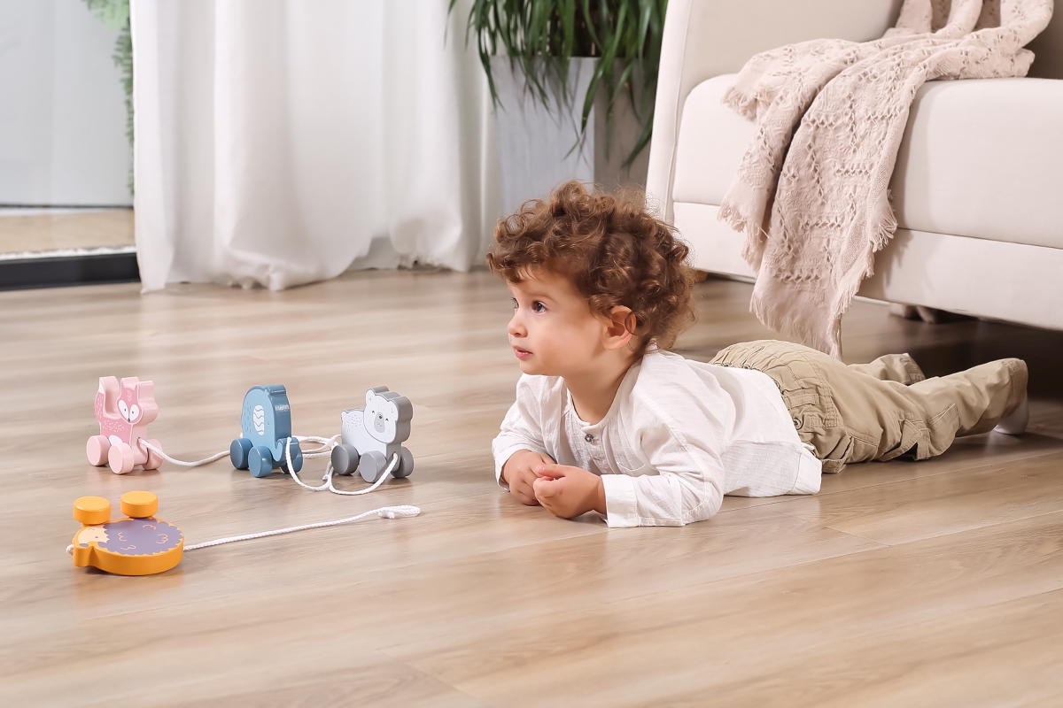 Dřevěná tahačka o rozměru cca 11,4 x 11 x 5,5 cm. Rozměry balení cca 15 x 15,5 x 6,5 cm. Věk 18m+..