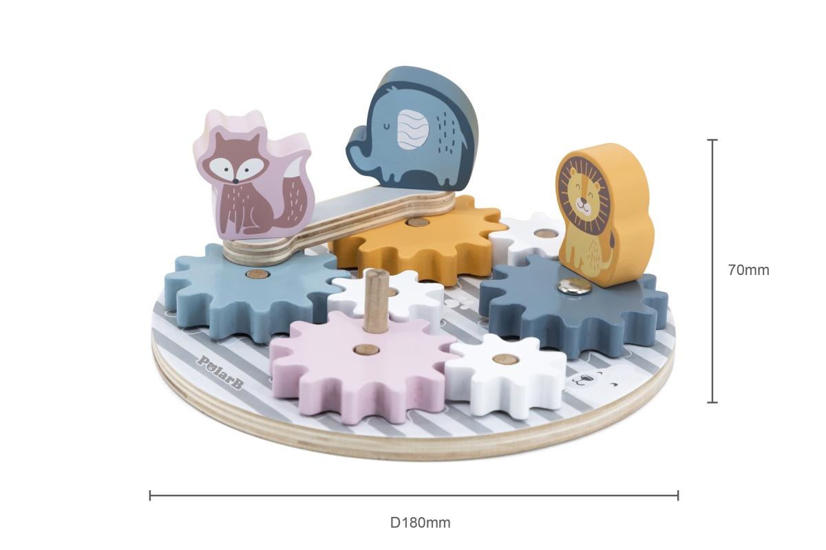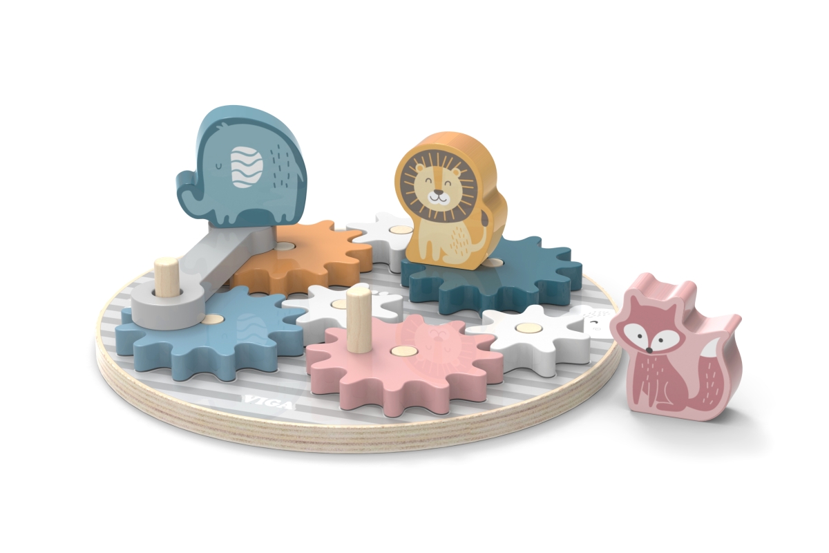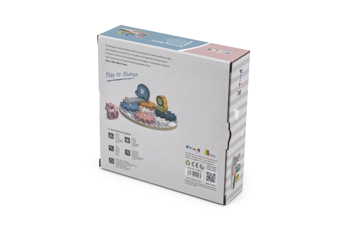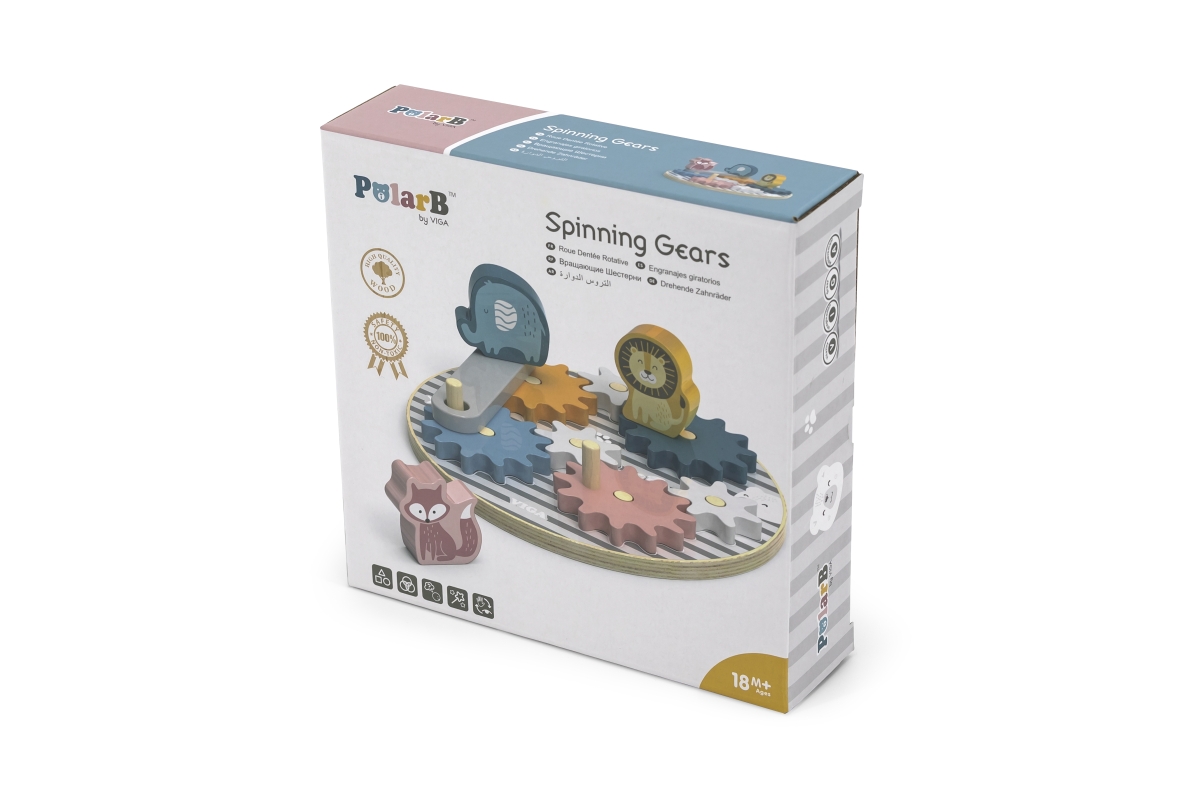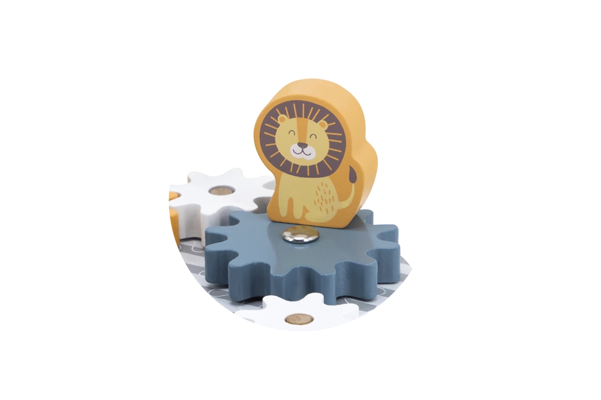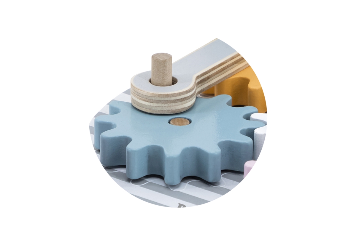 Dřevěná ozubená kolečka. Rozměry cca 18 x 18 x 7,2 cm. Rozměry balení cca 18,5 x 19 x 5,5 cm. Věk 18m+..