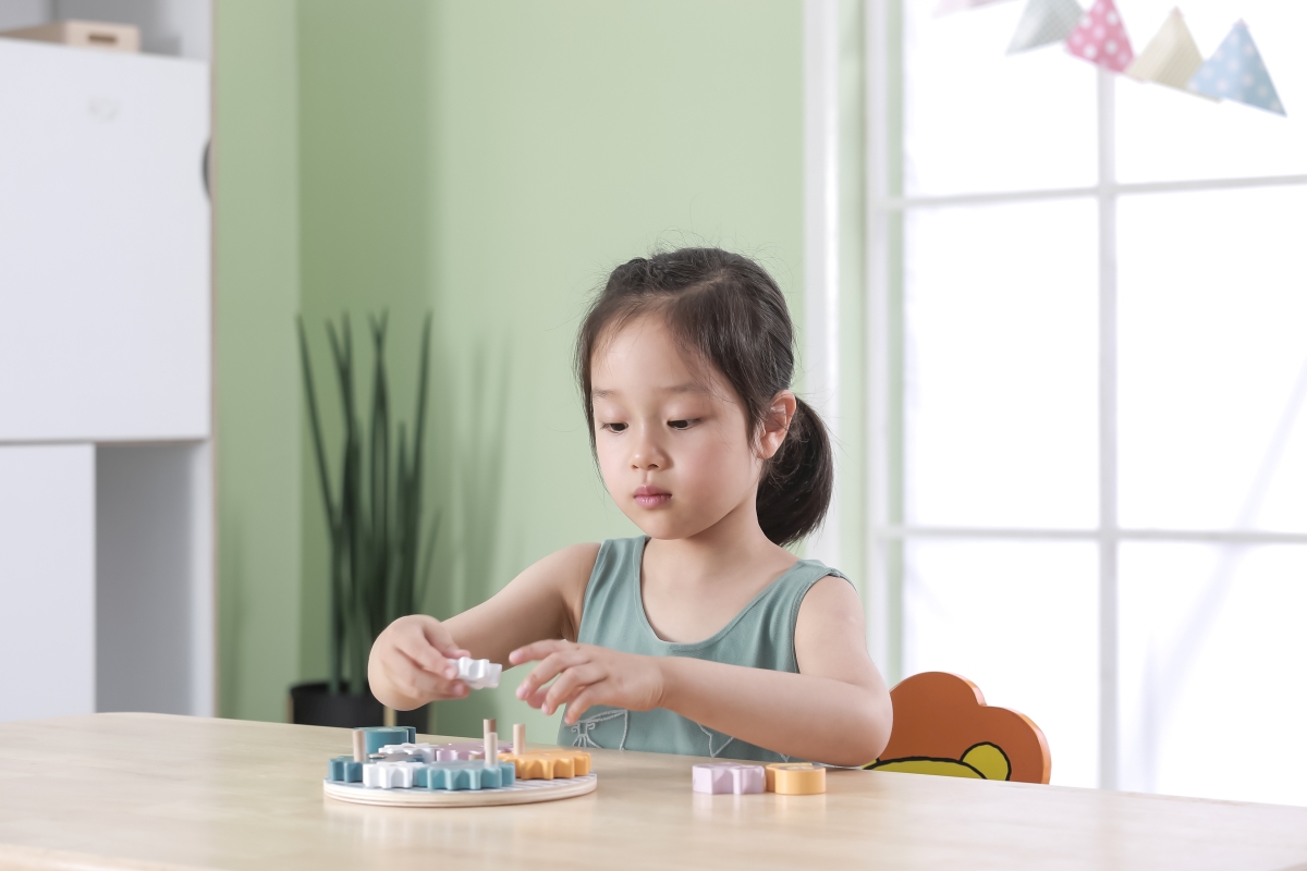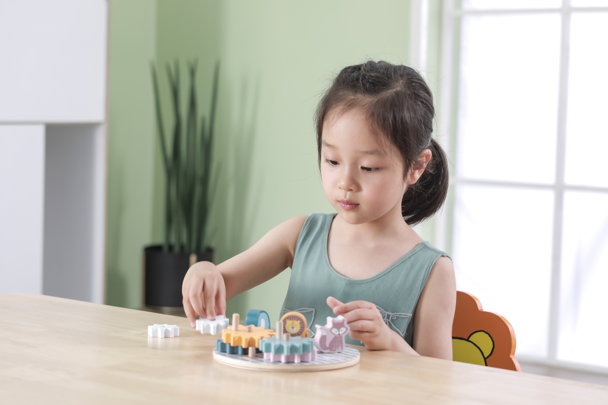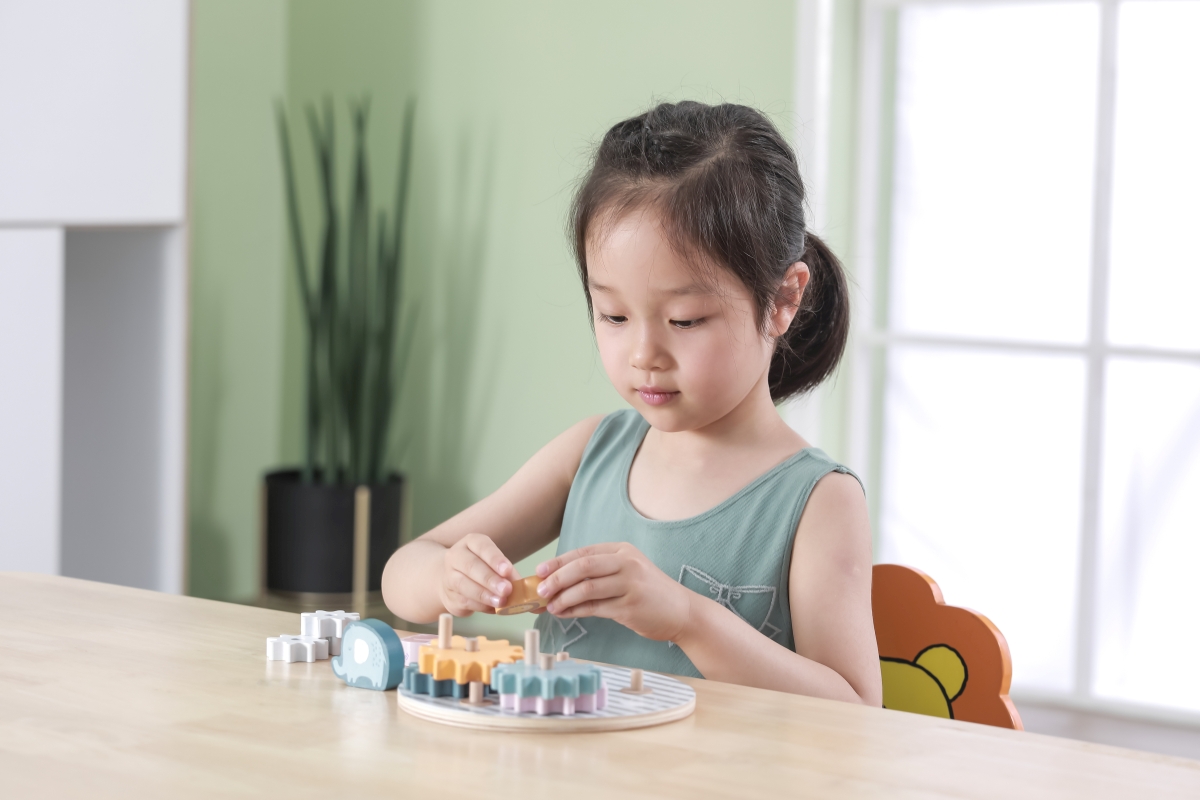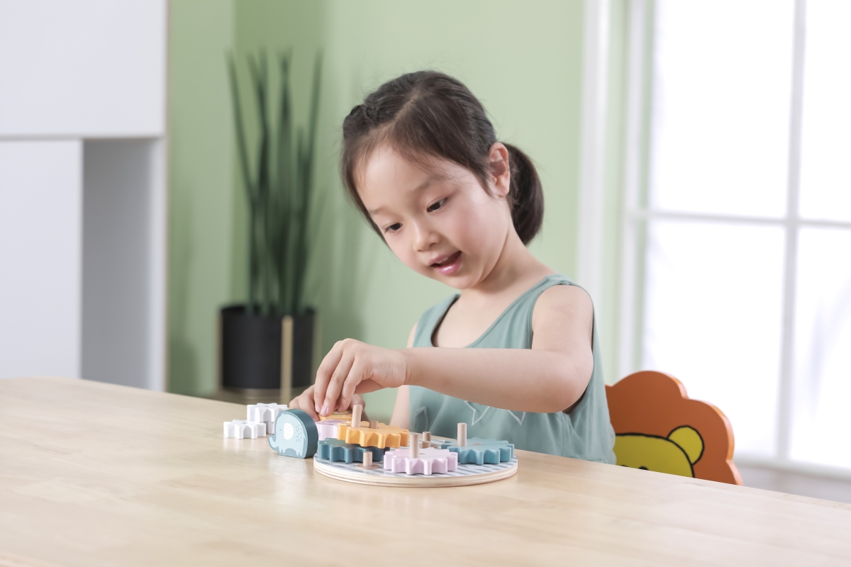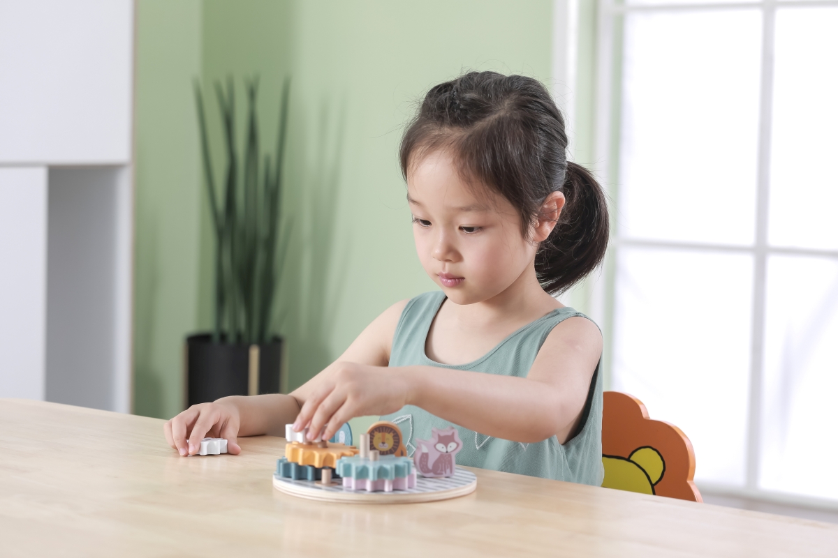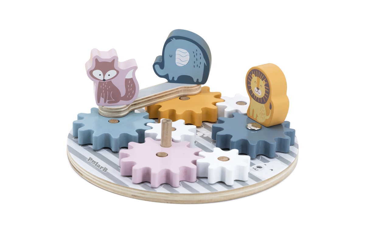 Dřevěná ozubená kolečka. Rozměry cca 18 x 18 x 7,2 cm. Rozměry balení cca 18,5 x 19 x 5,5 cm. Věk 18m+..