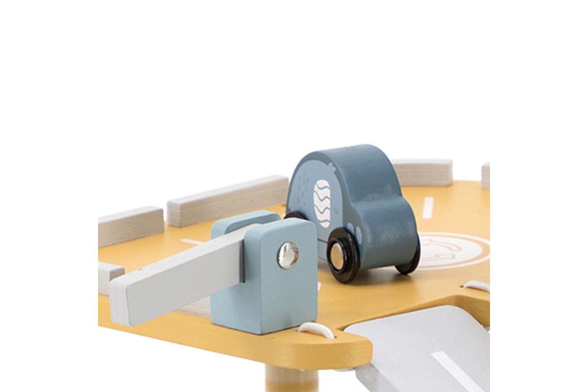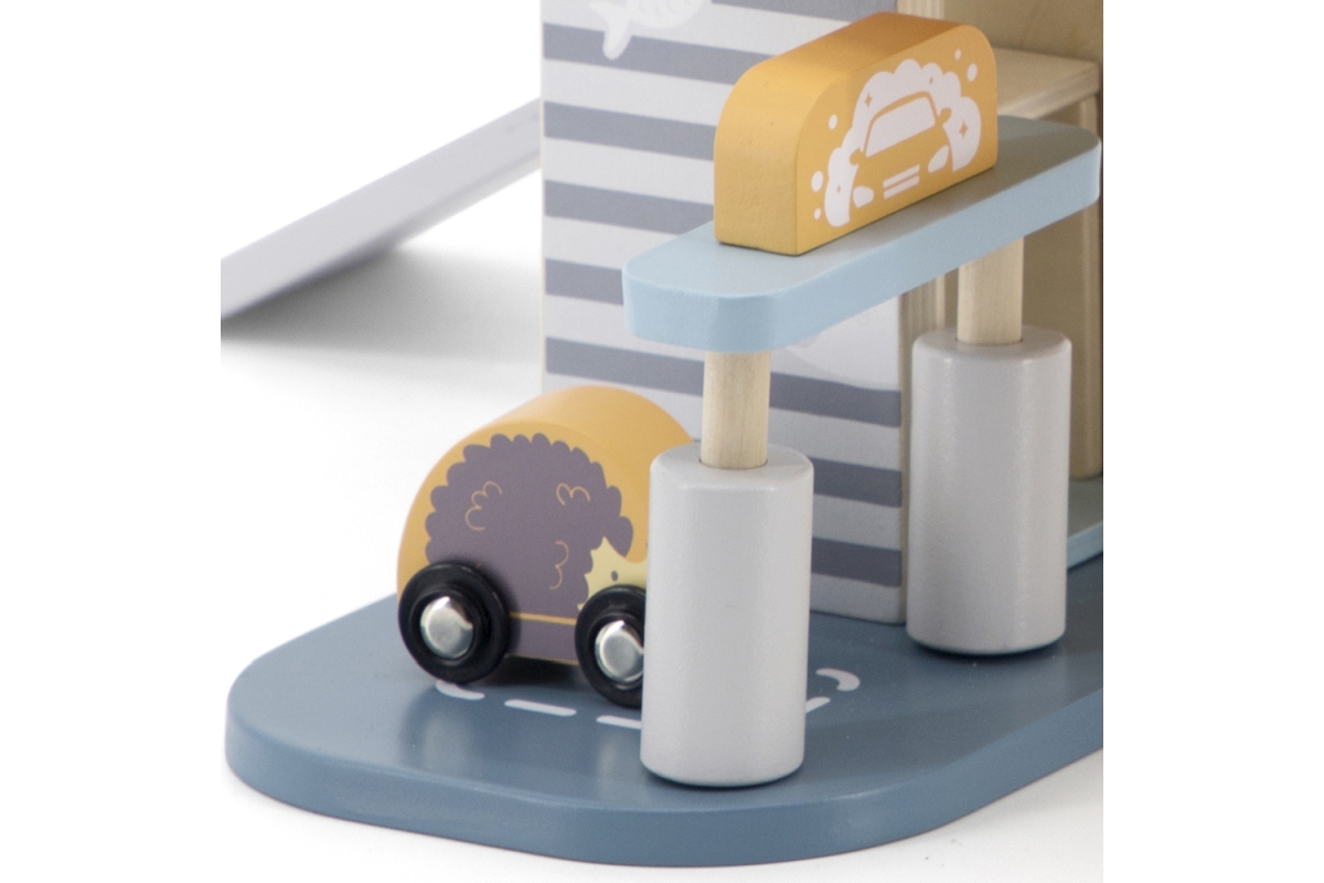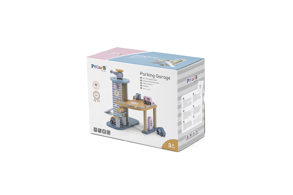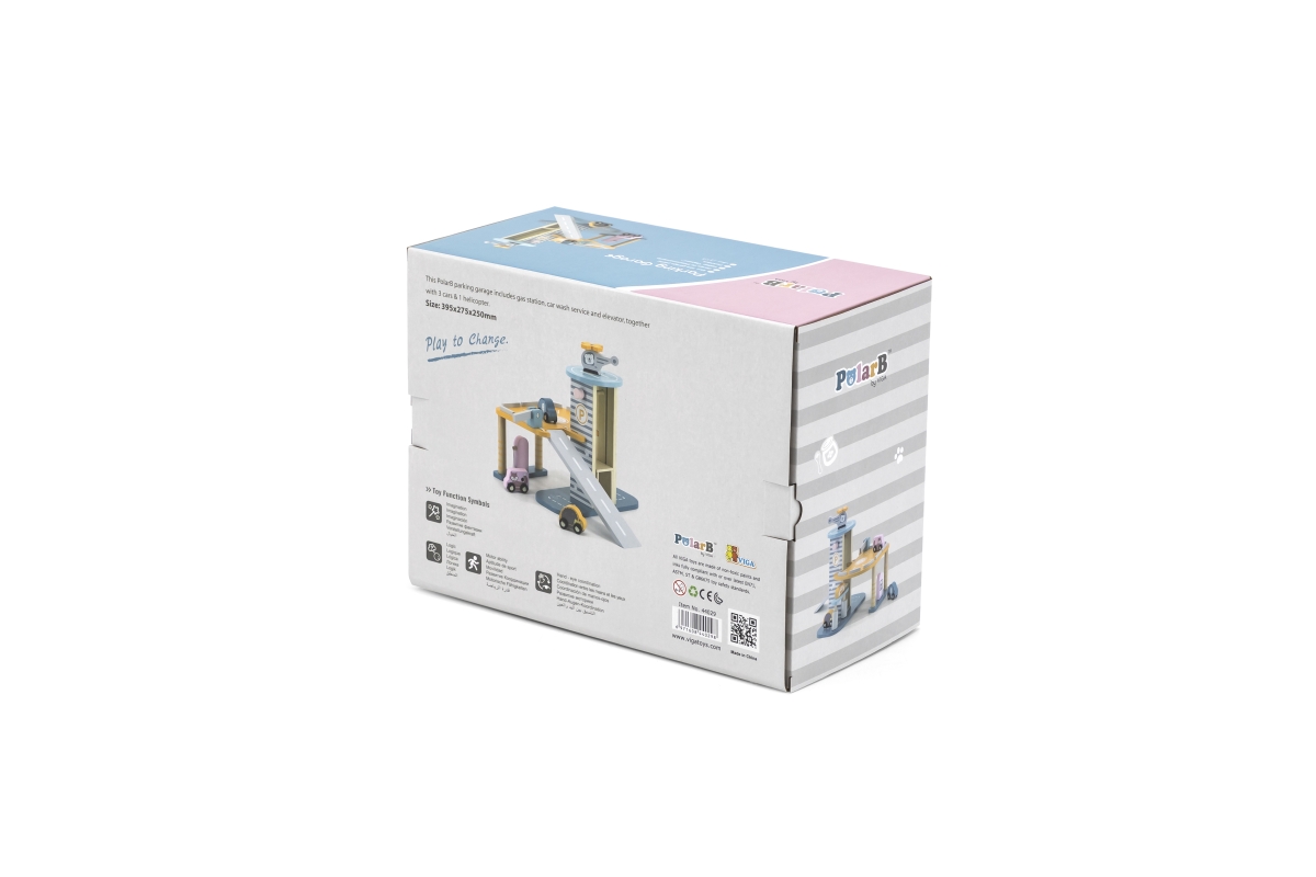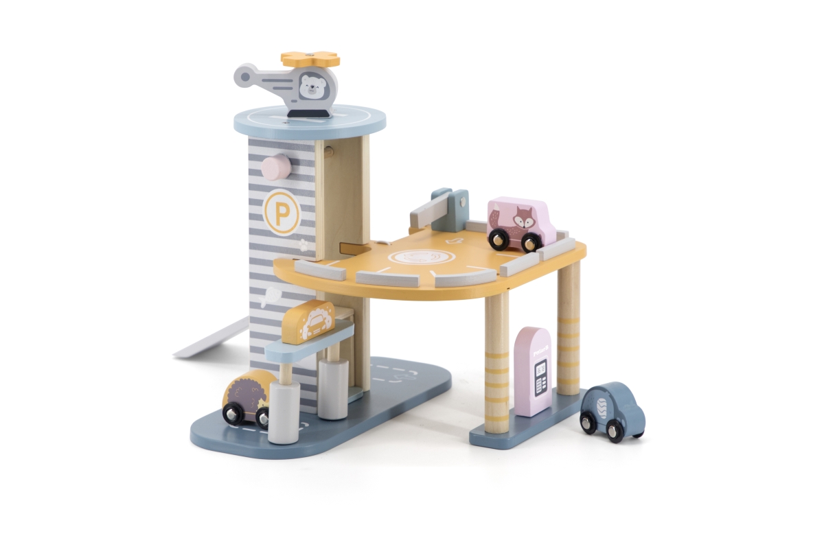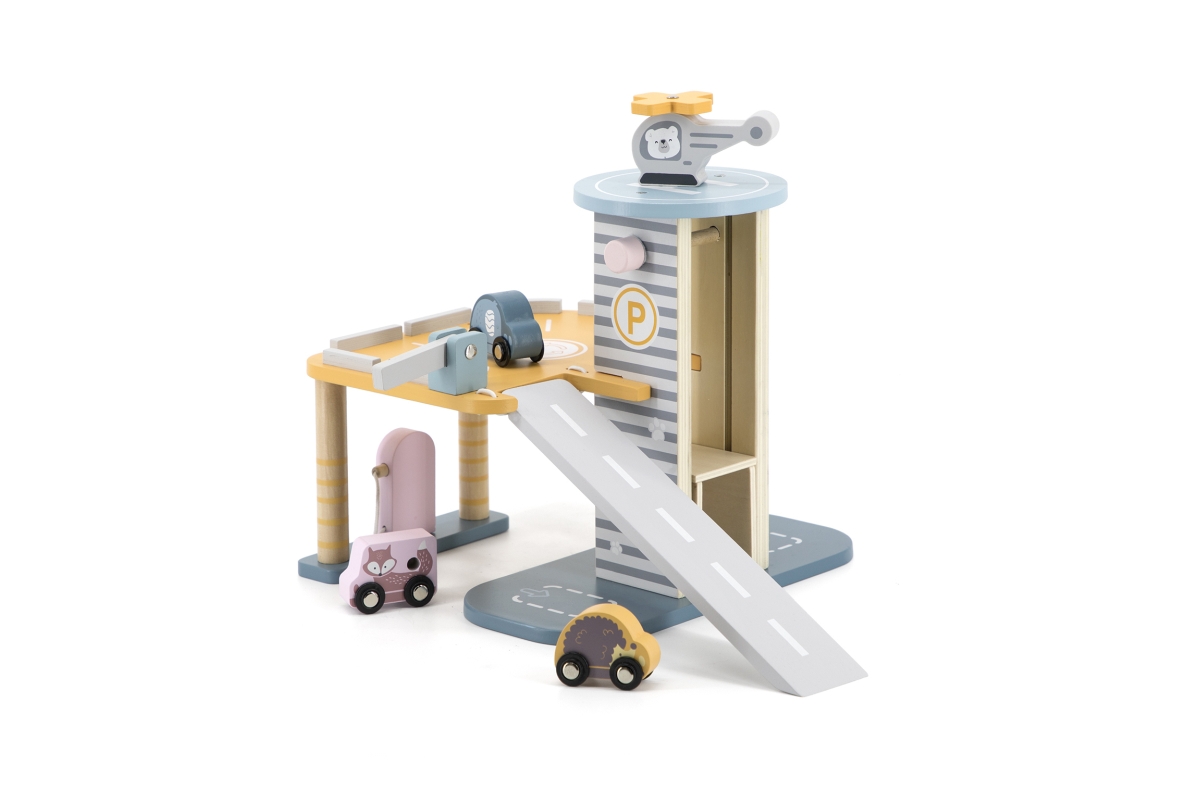 Dřevěná garáž o velikosti cca 39,5 x 27,5 x 25 cm. Balení obsahuje 3 dřevěná autíčka a helikoptéru. Rozměry balení cca 31 x 23,5 x 15 cm. Věk 3+..