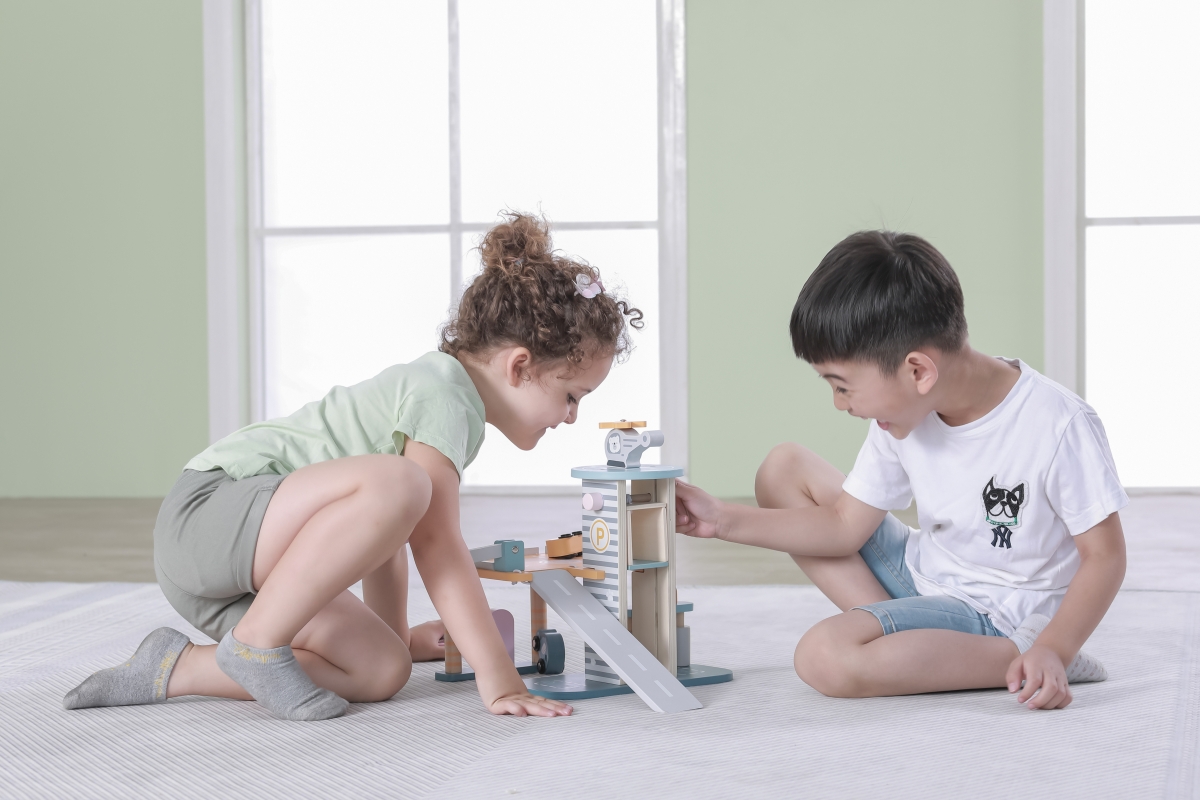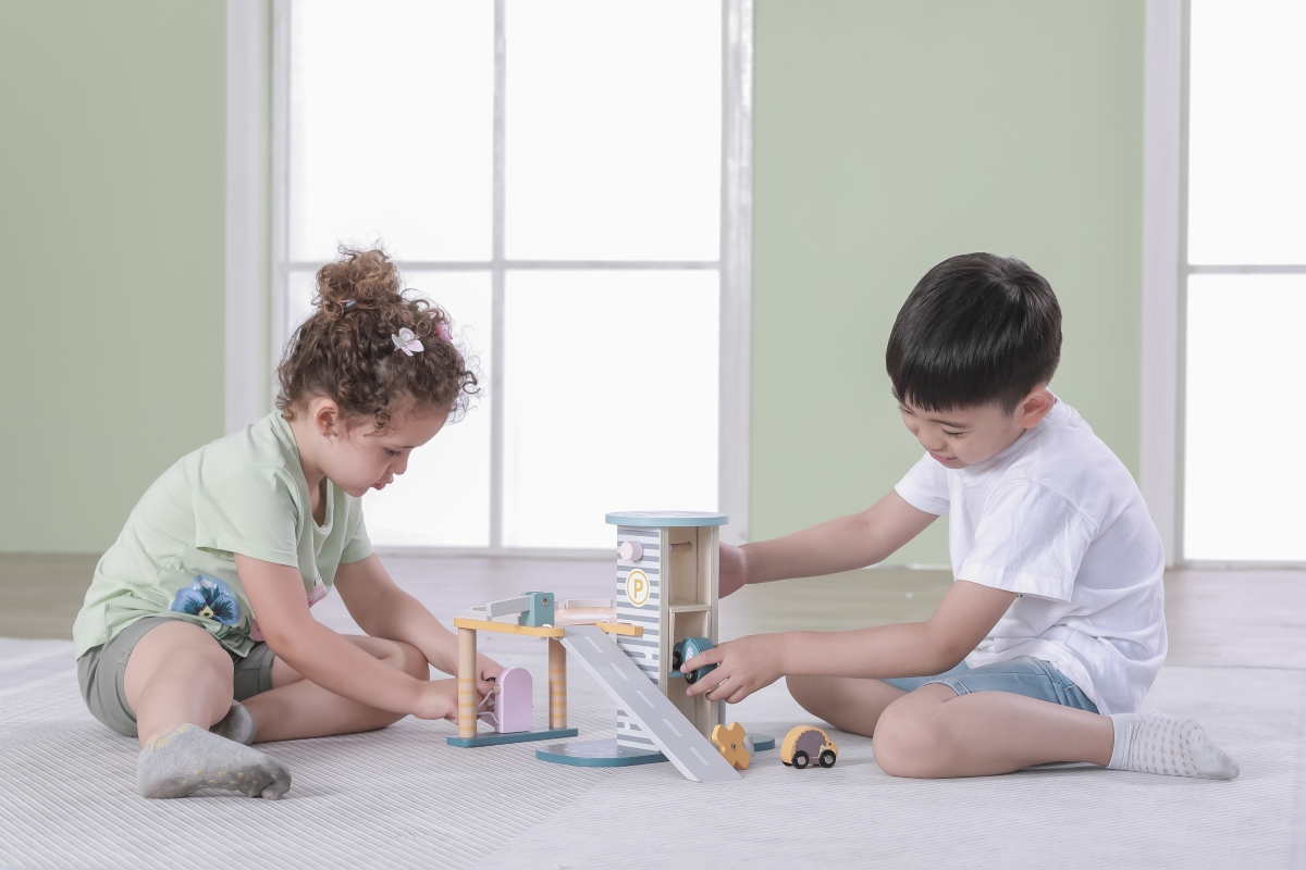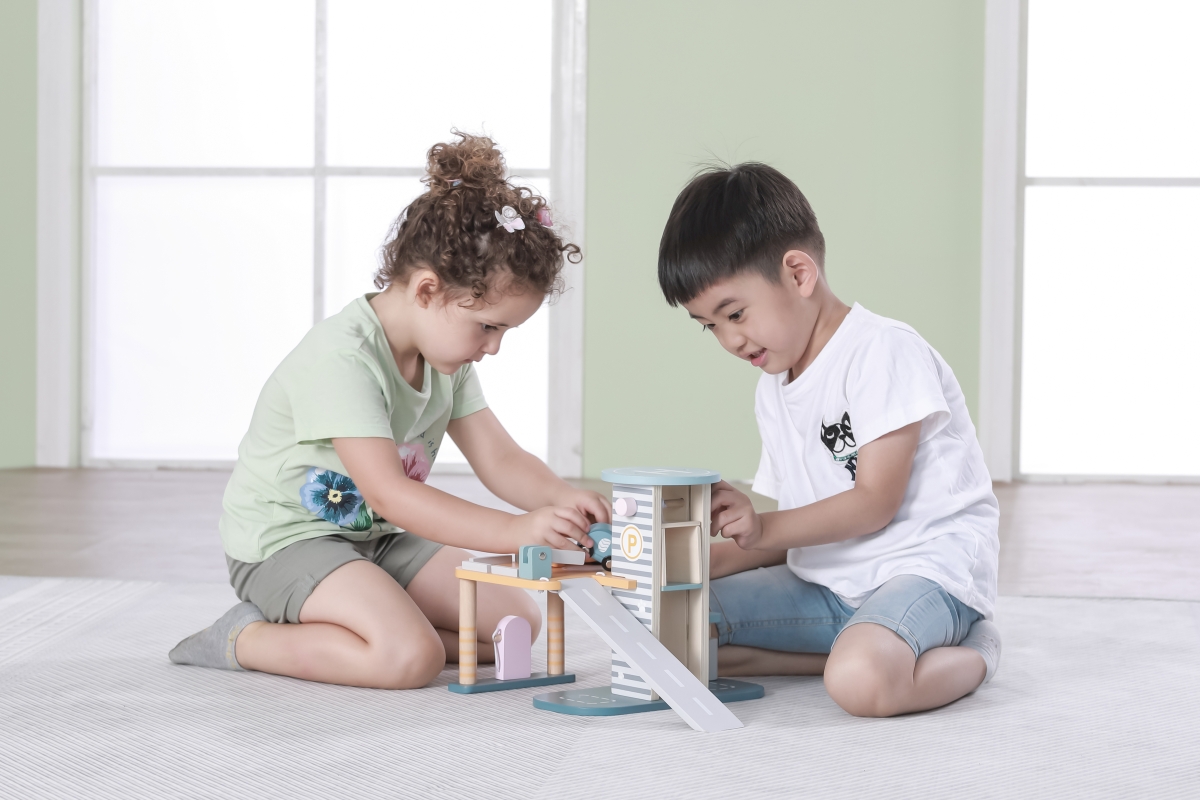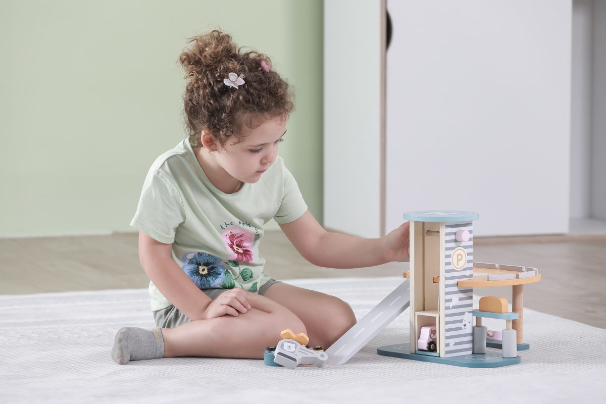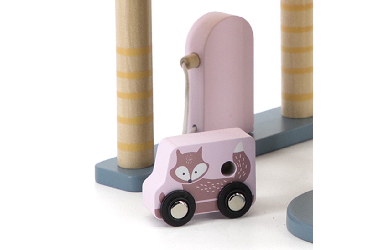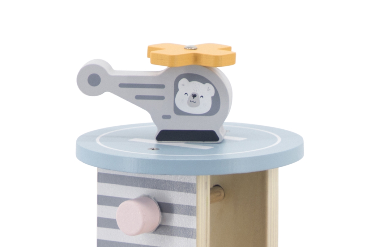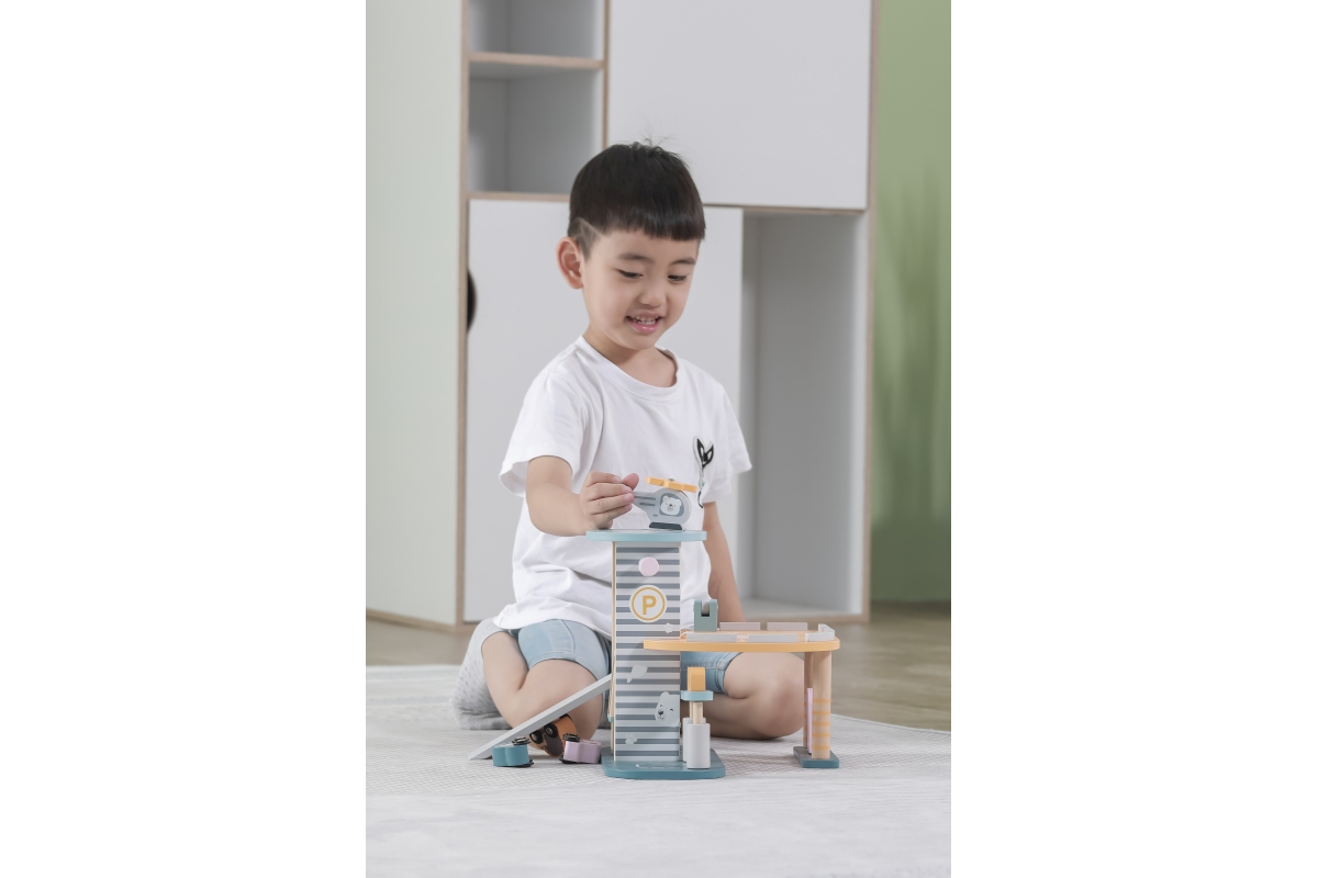 Dřevěná garáž o velikosti cca 39,5 x 27,5 x 25 cm. Balení obsahuje 3 dřevěná autíčka a helikoptéru. Rozměry balení cca 31 x 23,5 x 15 cm. Věk 3+..