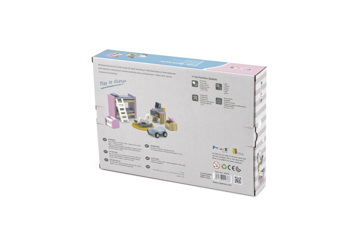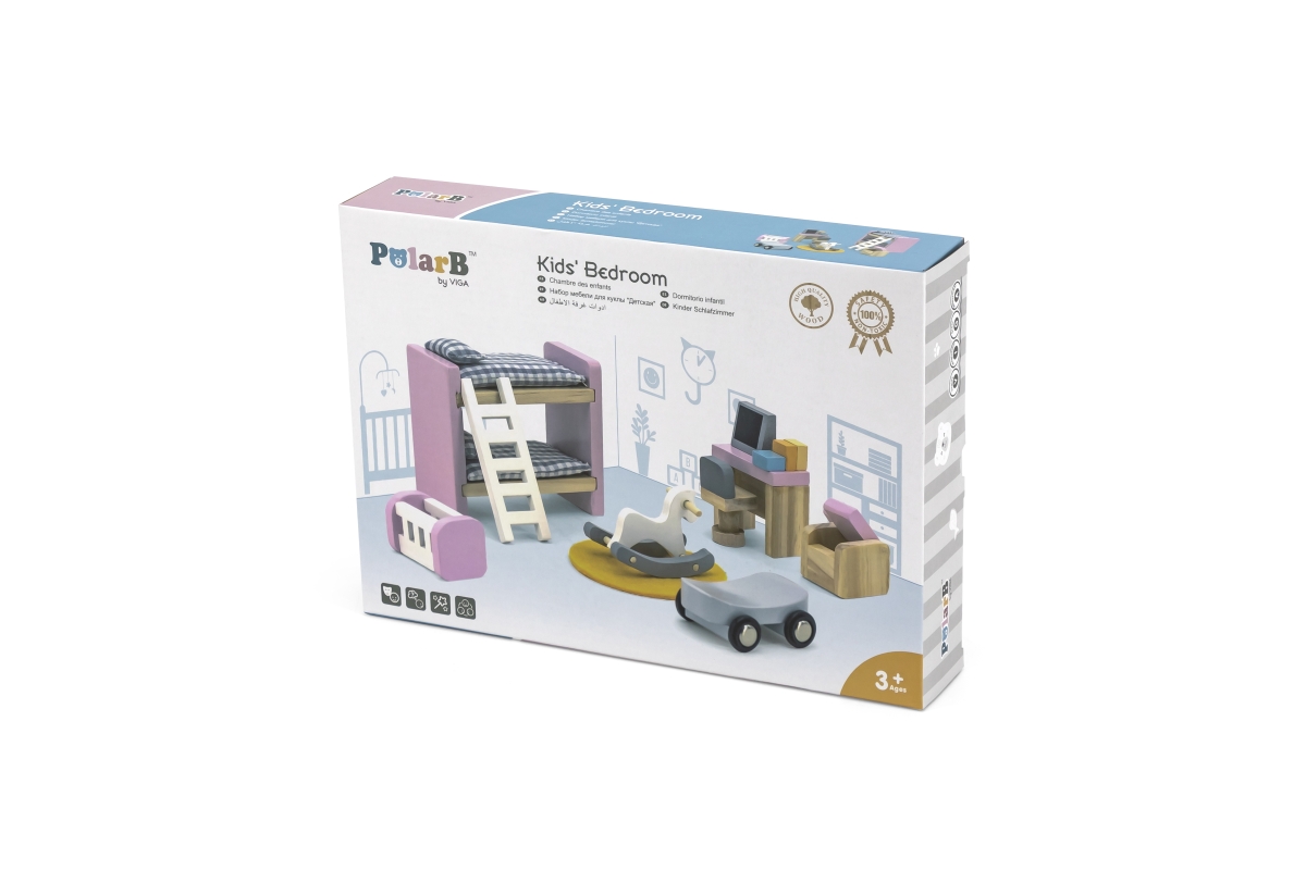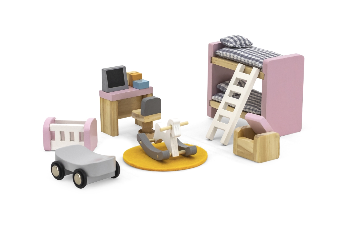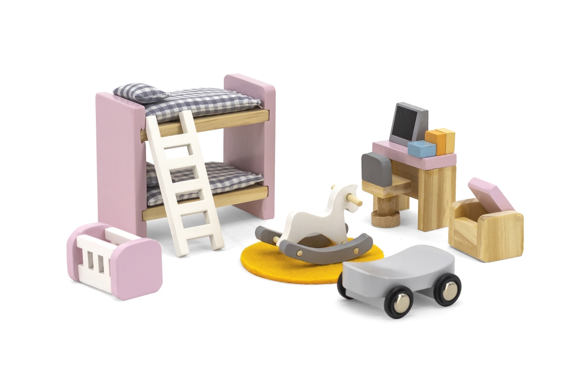 Dřevěný dětský pokoj pro panenky. Balení obsahuje dvoupatrovou postel, kolébku, stůl, počítač, houpacího koně a další doplňky. Rozměry balení cca 30 x..