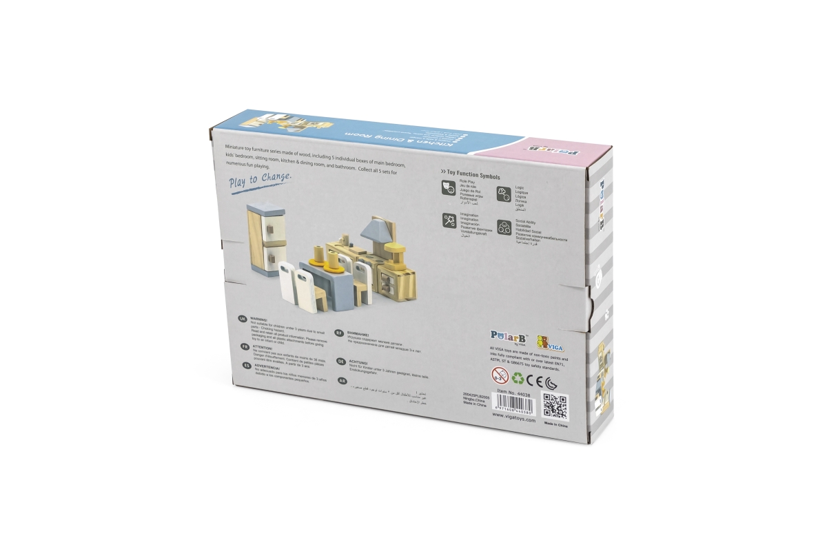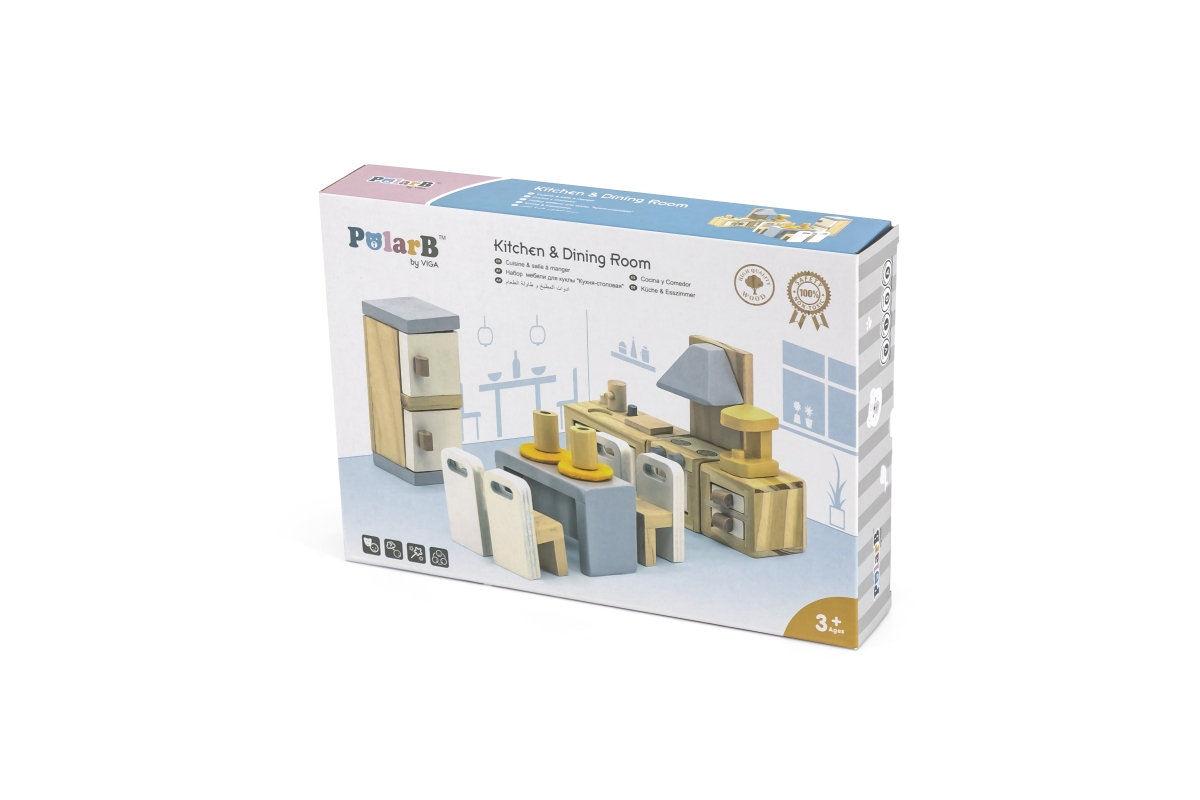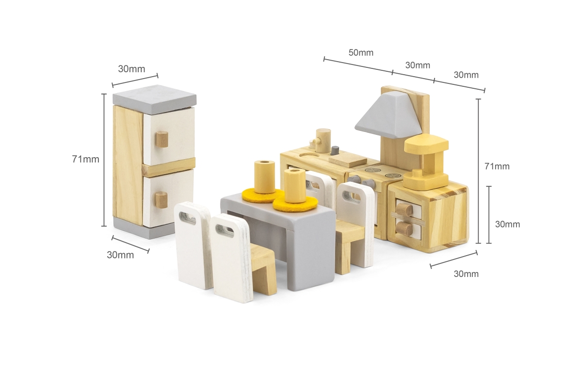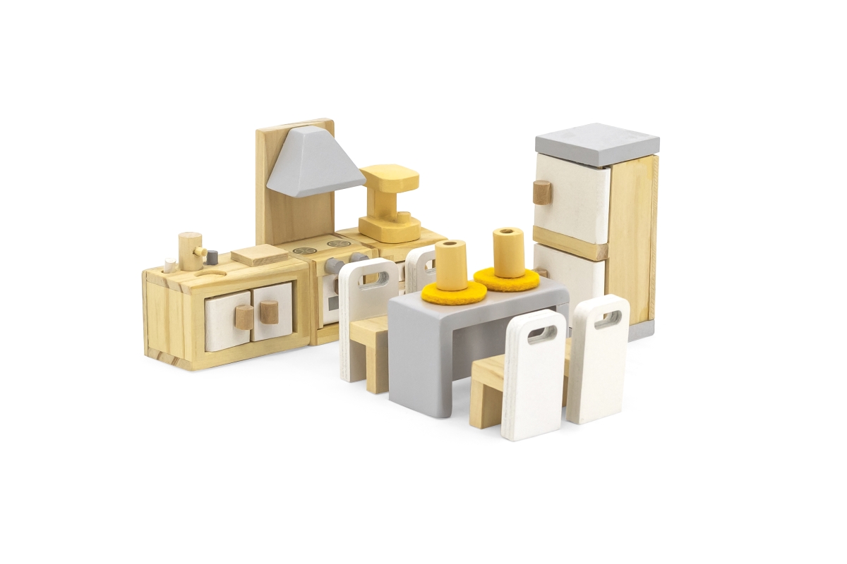 Dřevěná kuchyň a jídelna pro panenky. Balení obsahuje lednici, kuchyňskou linku, stůl, židle a další doplňky. Rozměry balení cca 30 x 21,5 x 5,5 cm. V..