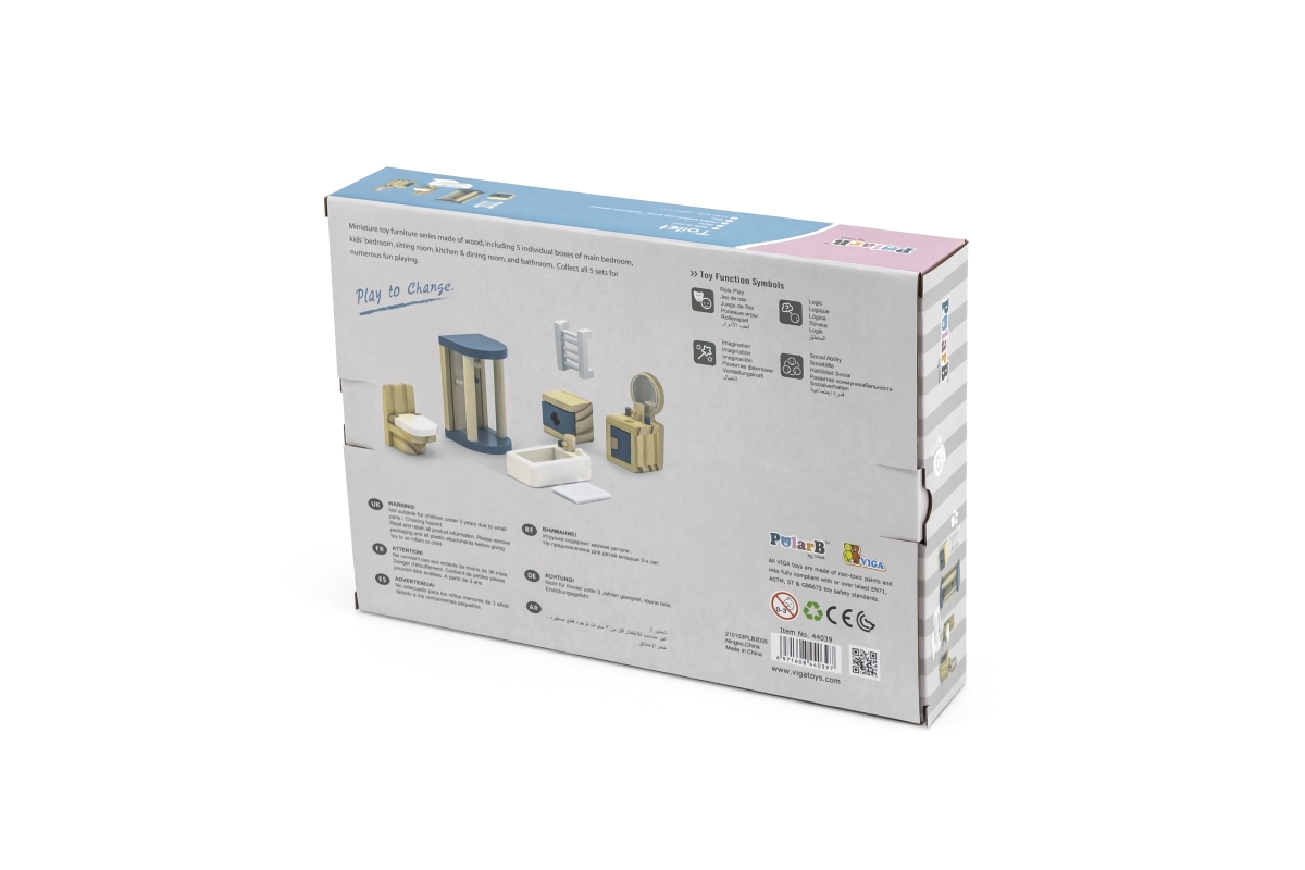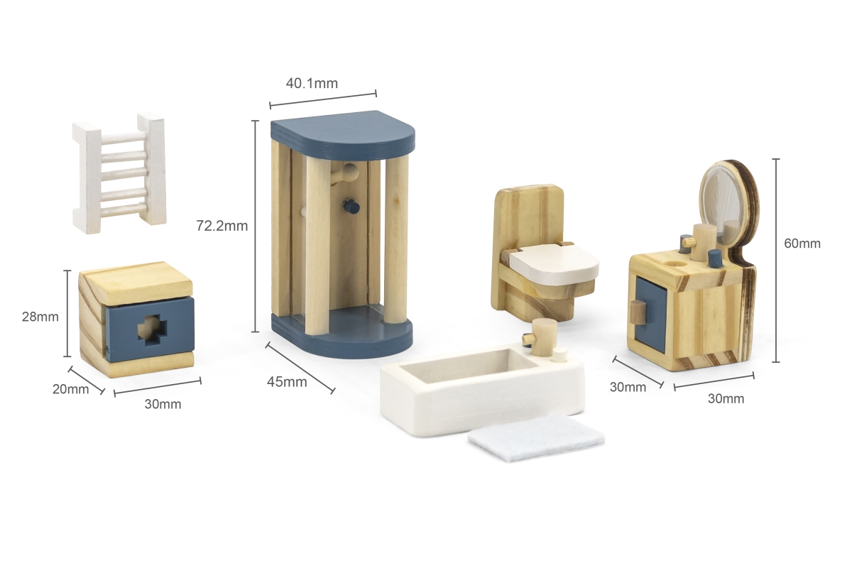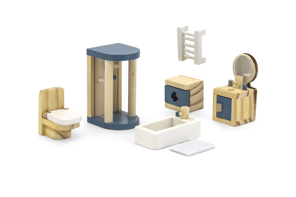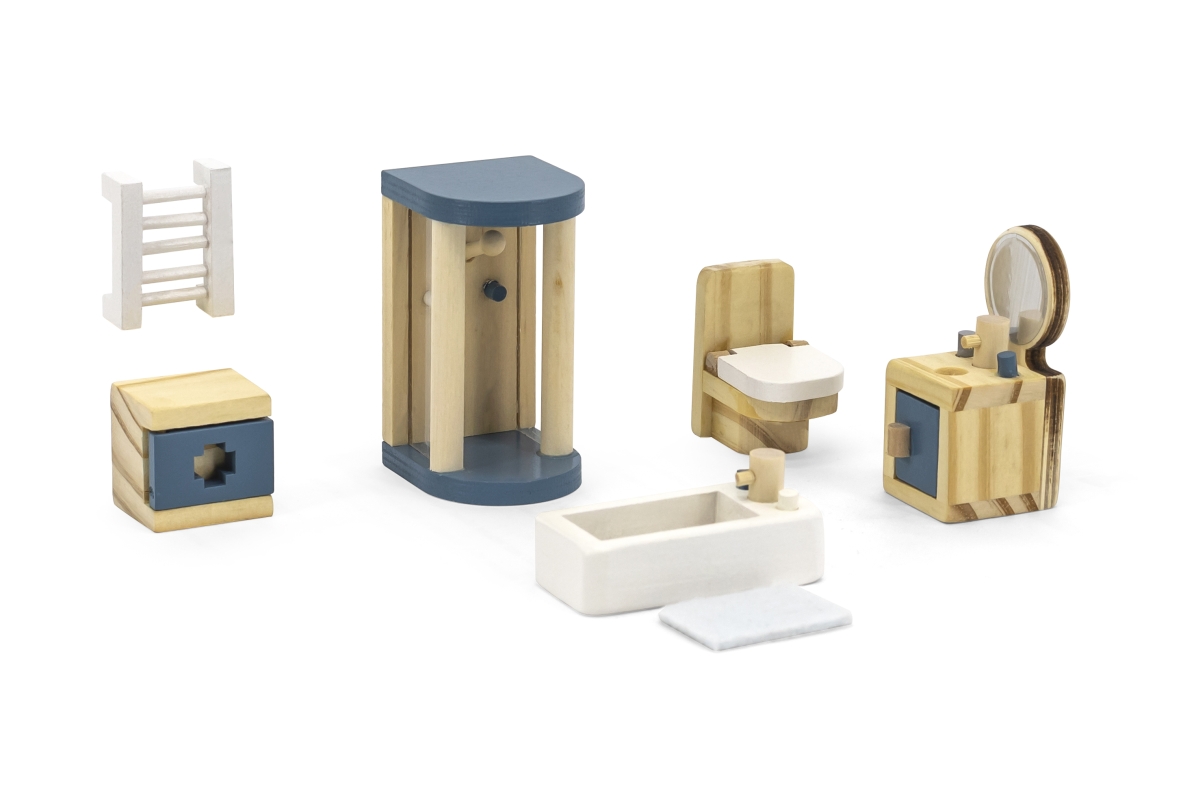 Dřevěná koupelna pro panenky. Balení obsahuje vanu, sprchový kout, záchod, umyvadlo, topení a další doplňky. Rozměry balení cca 30 x 21,5 x 5,5 cm. Vě..