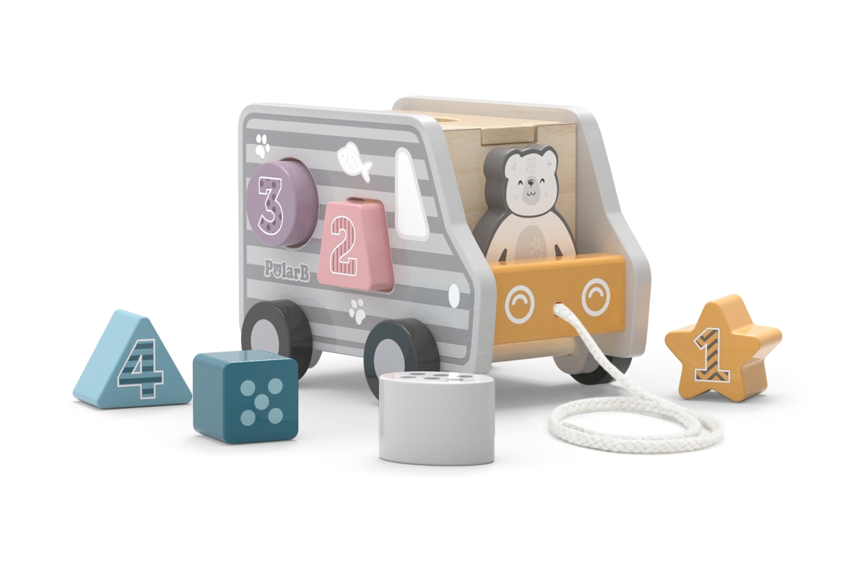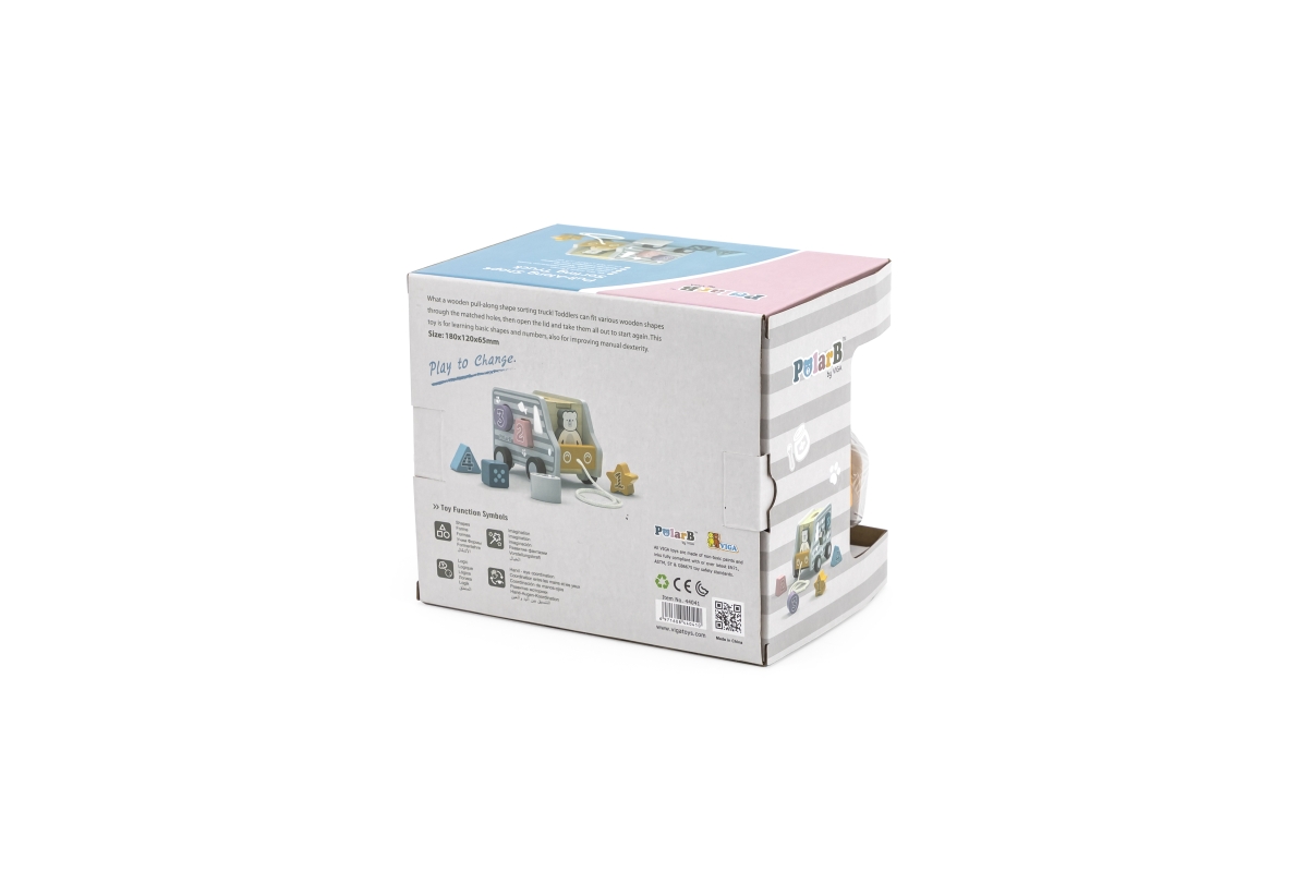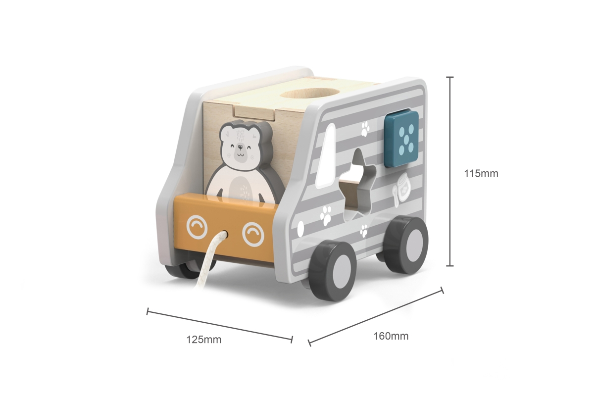 Dřevěná tahačka a vkládačka ve tvaru nákladního auta. Rozměry cca 18 x 12 x 6,5 cm. Rozměry balení cca 19 x 16,5 x 13,5 cm. Věk 18m+..