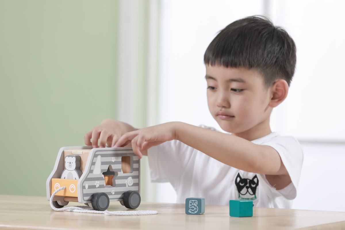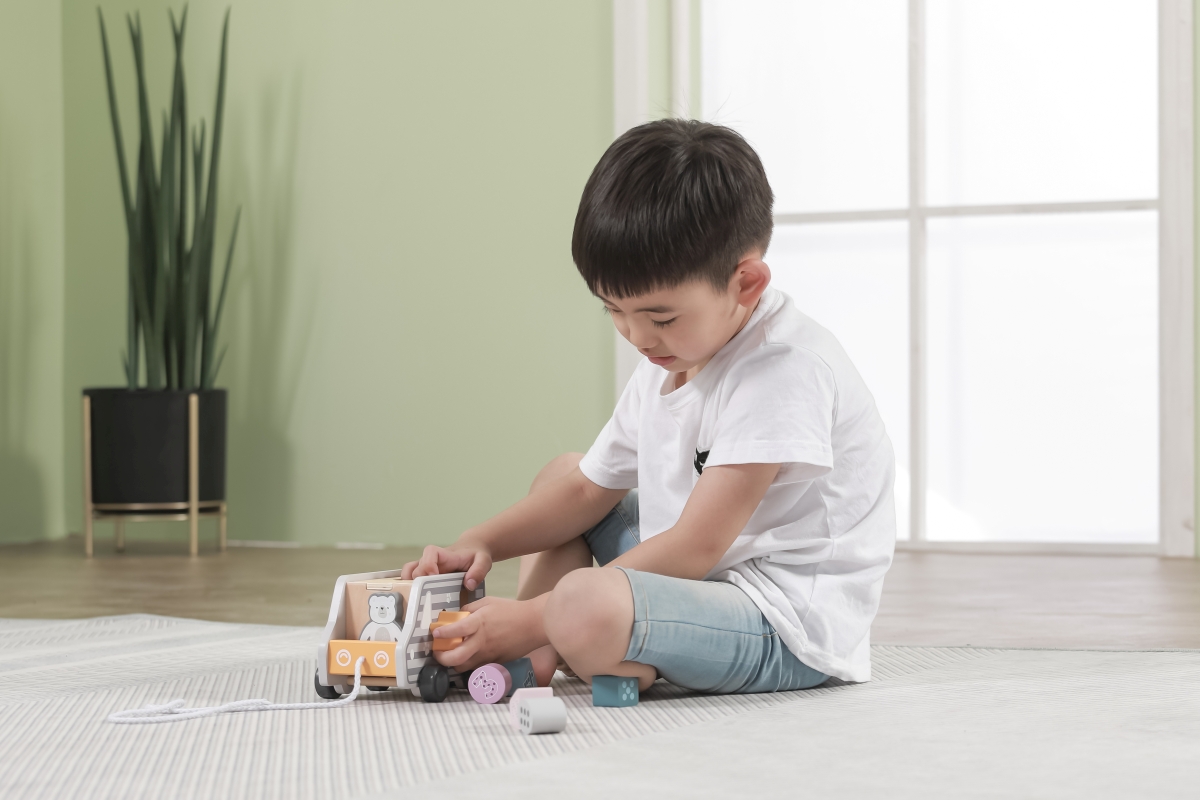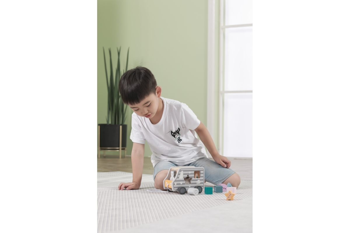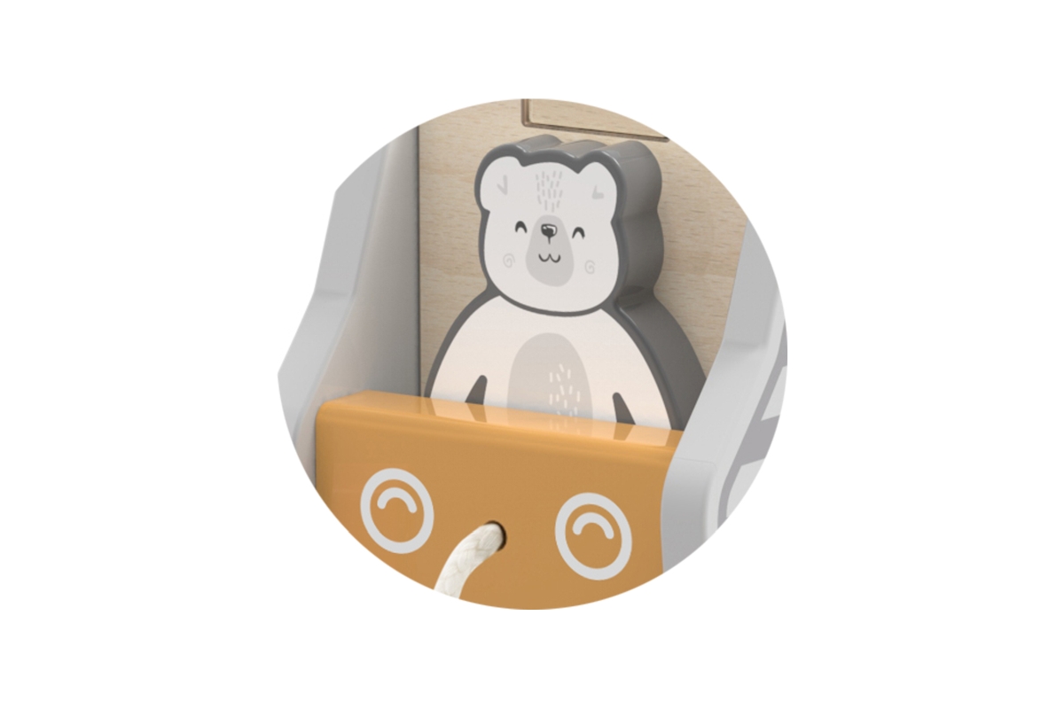 Dřevěná tahačka a vkládačka ve tvaru nákladního auta. Rozměry cca 18 x 12 x 6,5 cm. Rozměry balení cca 19 x 16,5 x 13,5 cm. Věk 18m+..