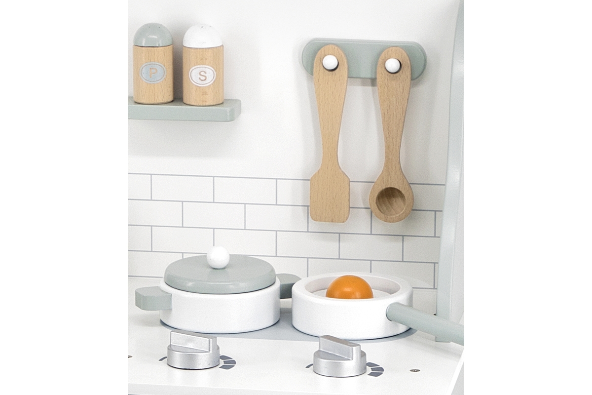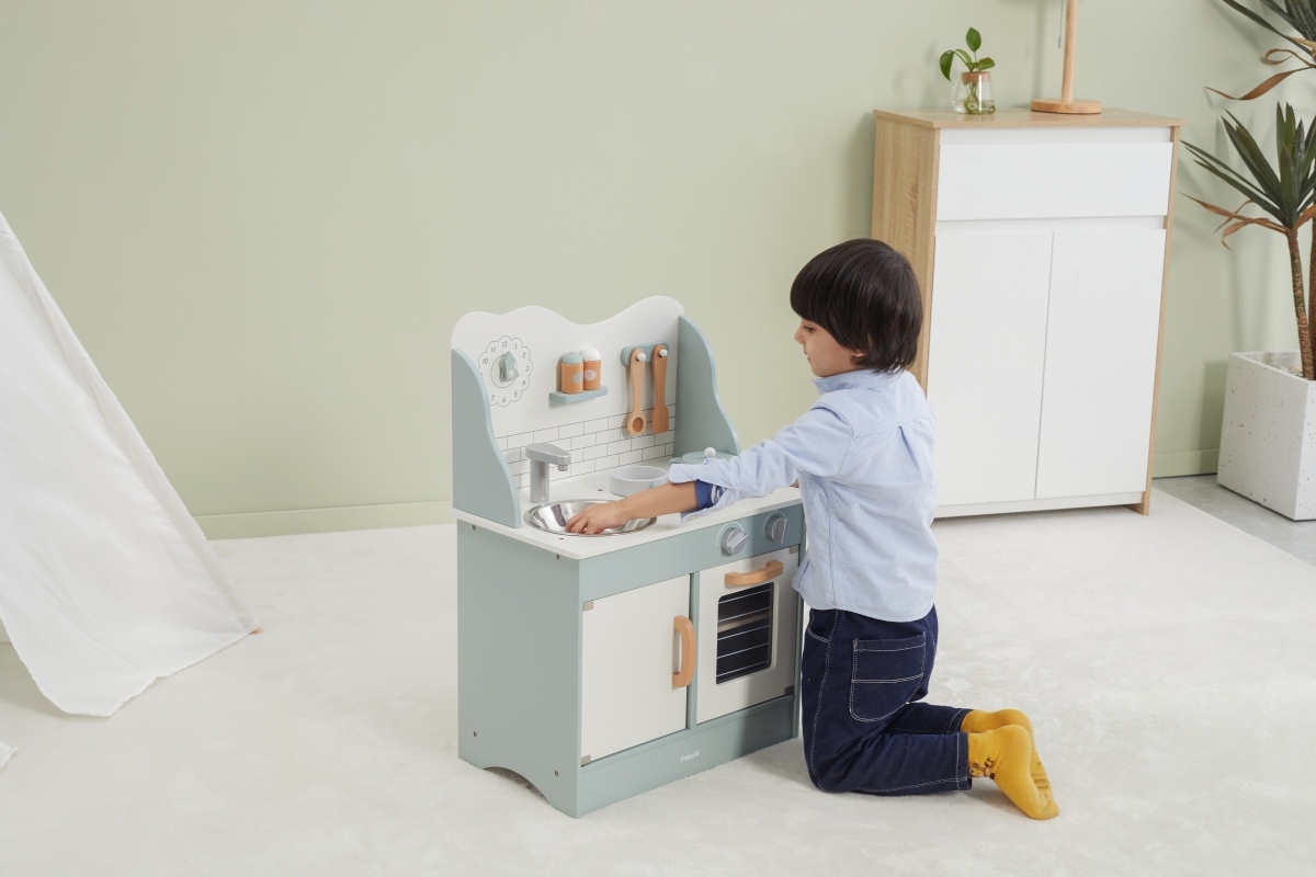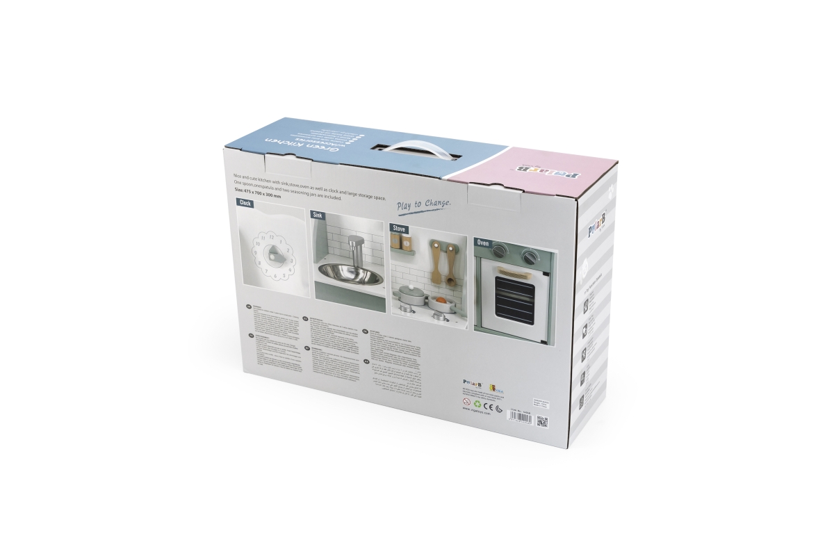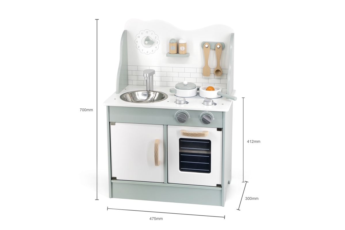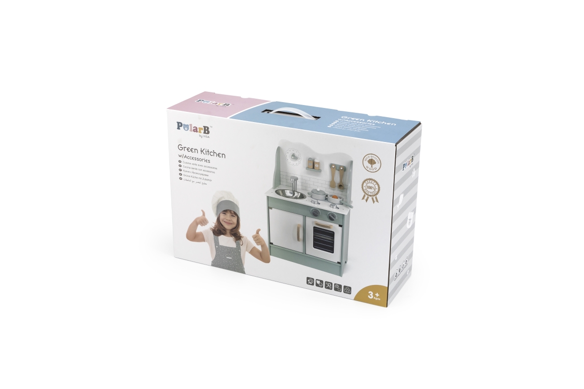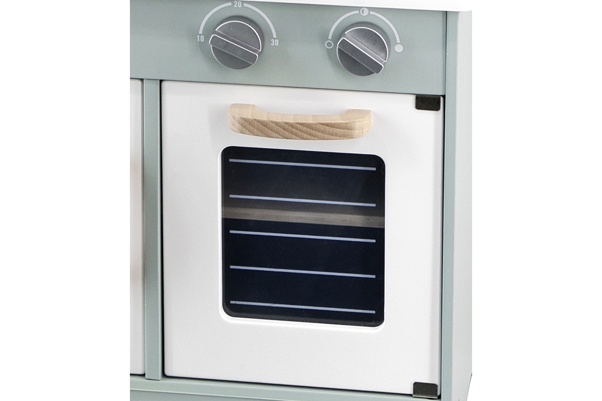 Tato velmi milá dětská kuchyňka v pastelově-zelené barvě jistě potěší všechny malé „kuchaře“. Společná příprava jídel se pro děti stane zábavnou, přičemž se naučí mnohé věci ze světa dospělých zábavnou formou hry. Kuchyňka pro děti je vyrobena ze dřeva, má zabudovaný dřez, pečící troubu a sporák s varnými plotnami. Rozměr balení cca 52,5 x 35,5 x 16,5 cm. Věk 3+