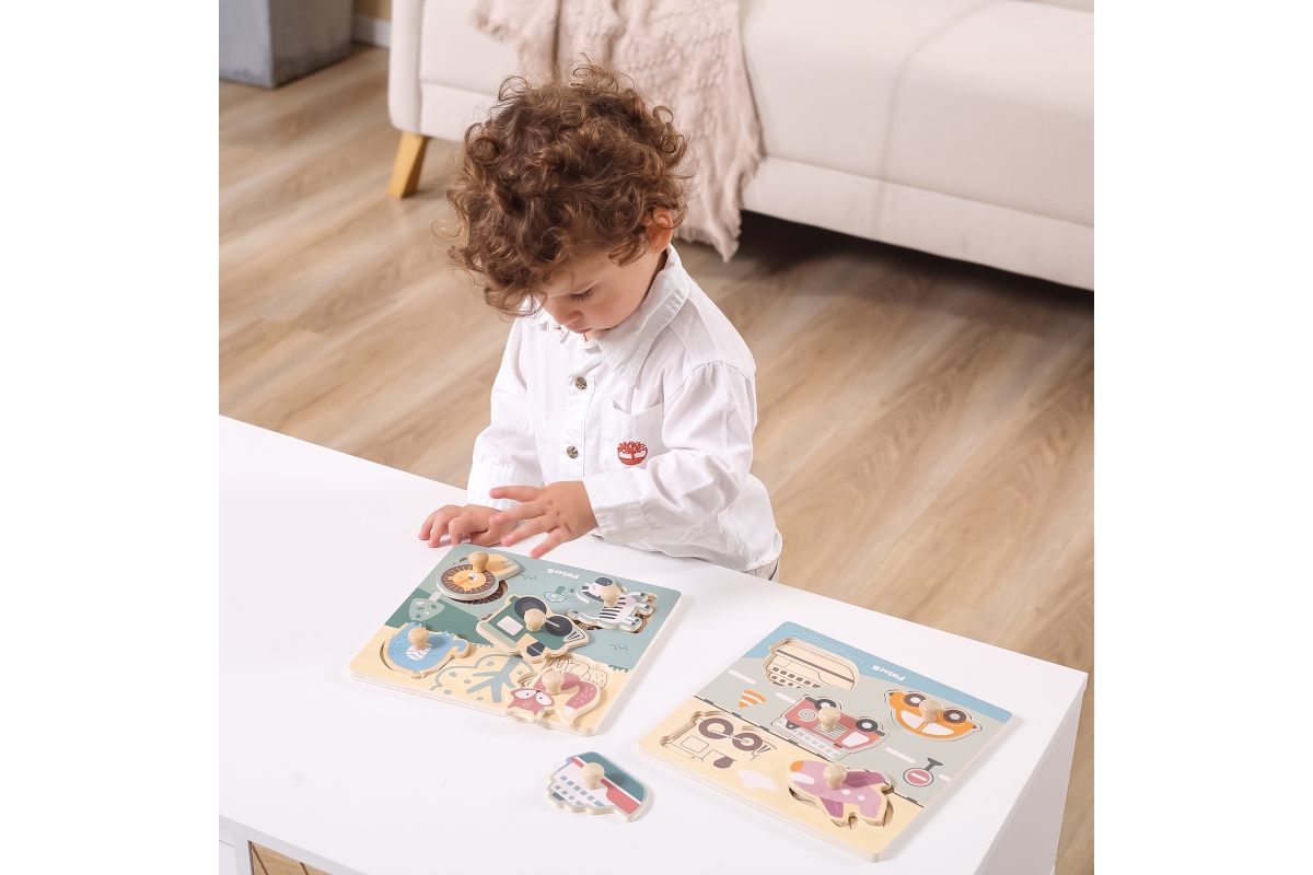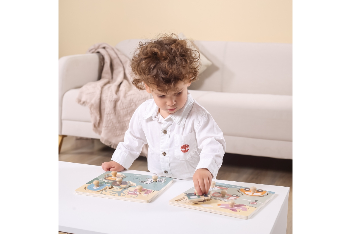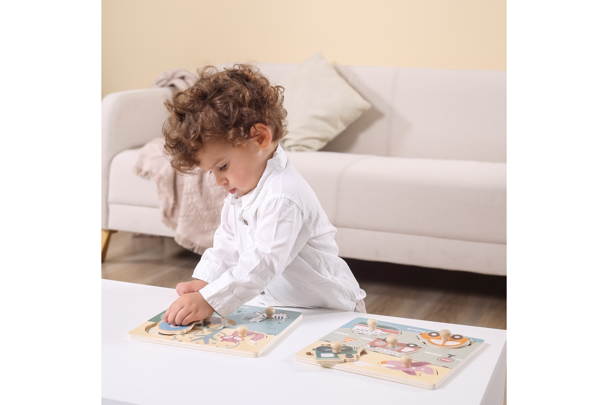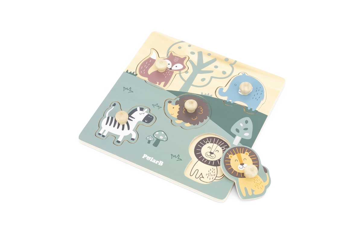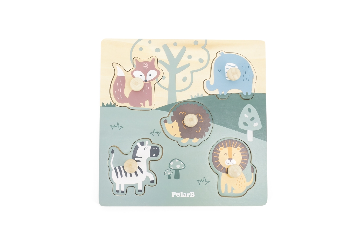 Dřevěná vkládačka s motivem zvířátek. Rozměr dřevěné desky cca 22 x 22 cm. Rozměr balení cca 22 x 22 x 2,5 cm. Věk 18m+..
