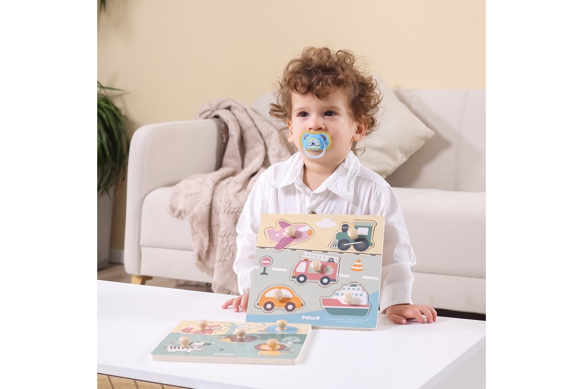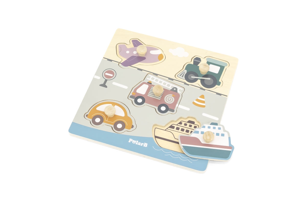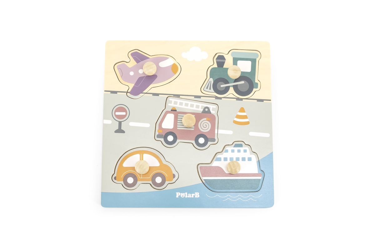 Dřevěná vkládačka s motivem dopravních prostředků. Rozměr dřevěné desky cca 22 x 22 cm. Rozměr balení cca 22 x 22 x 2,5 cm. Věk 18m+..