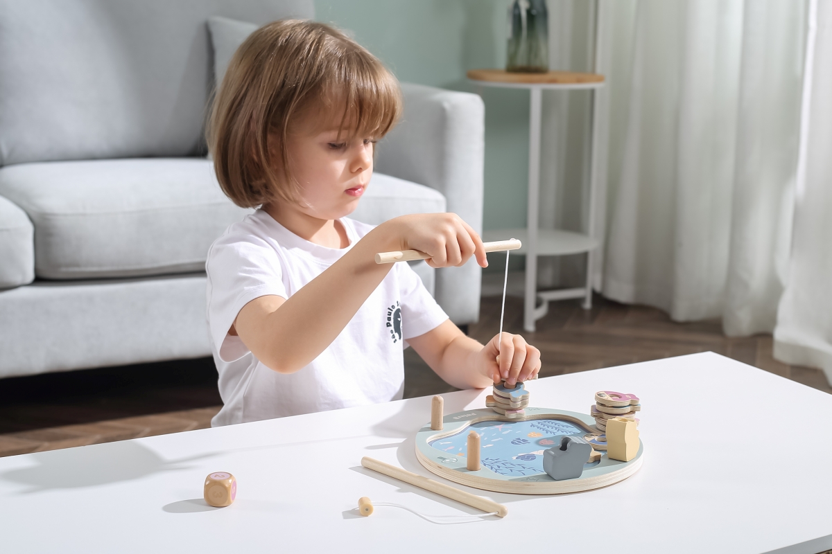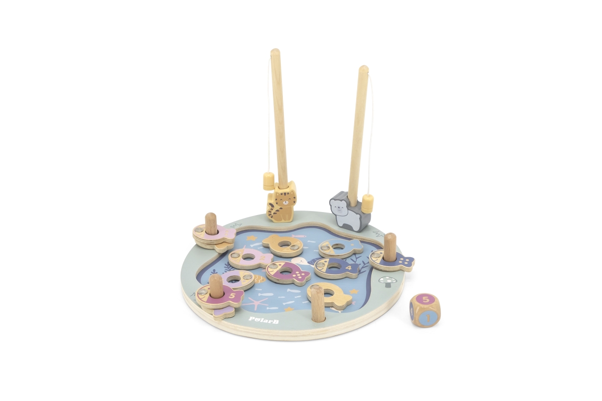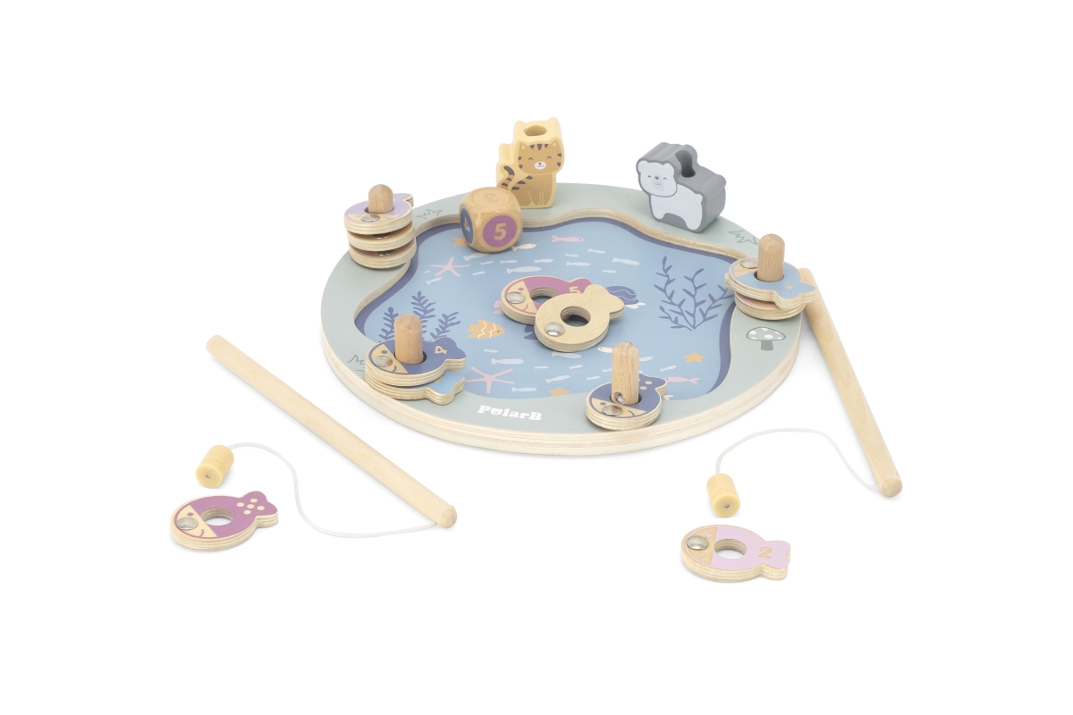 Tato magnetická rybářská hra se skládá z rybníka, 12 ryb, kostky a dvou rybářských prutů. Pomocí magnetických tyčí chyťte ryby a položte je na dřevěný..