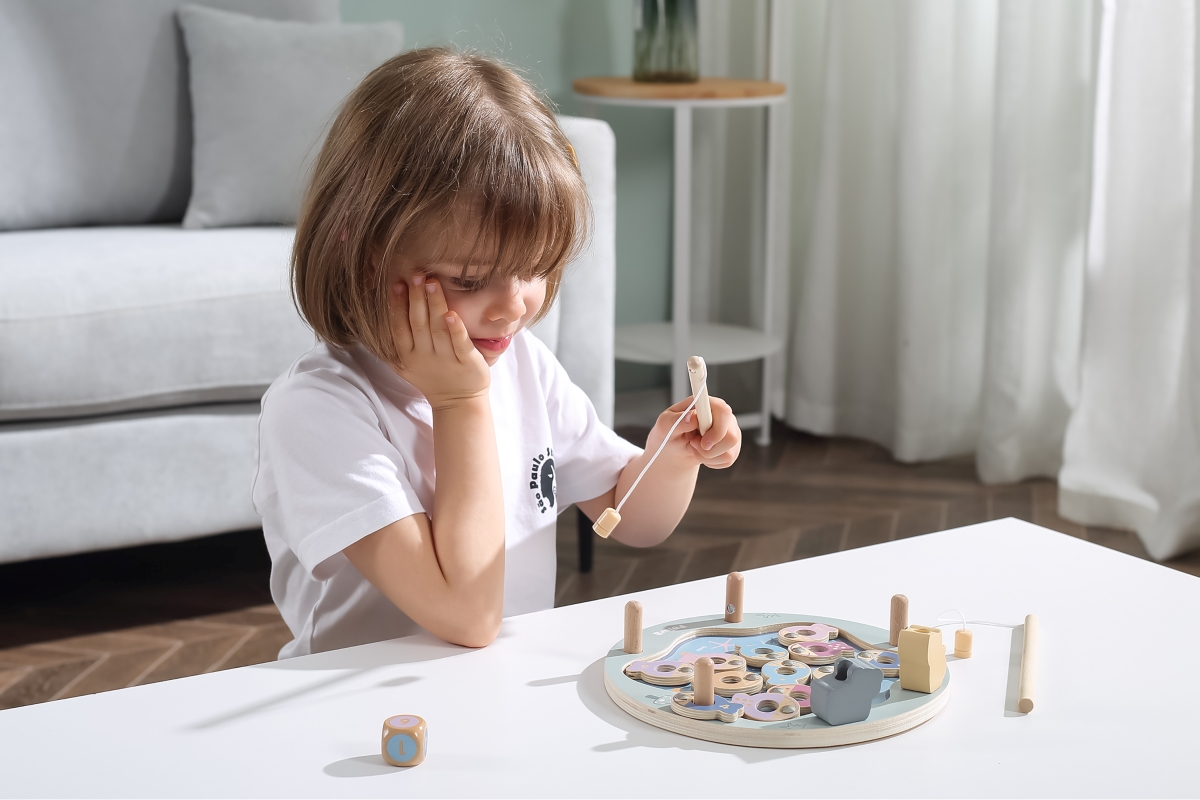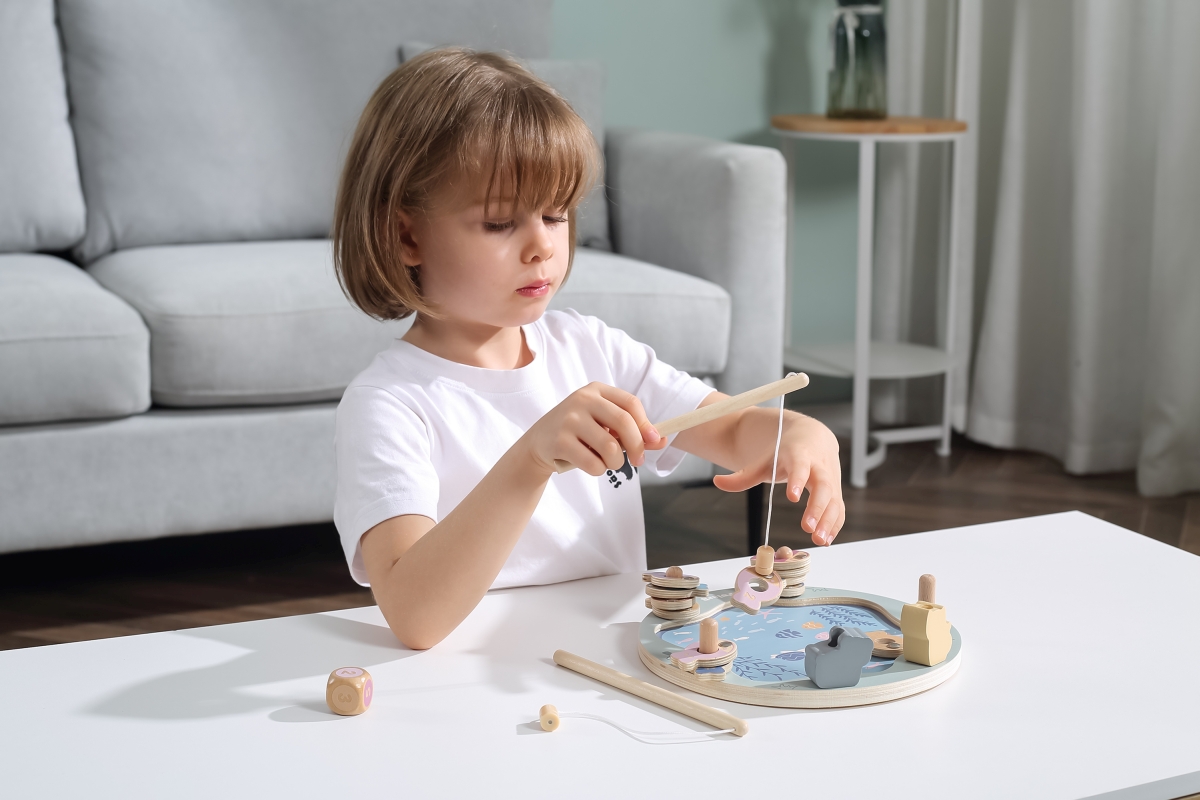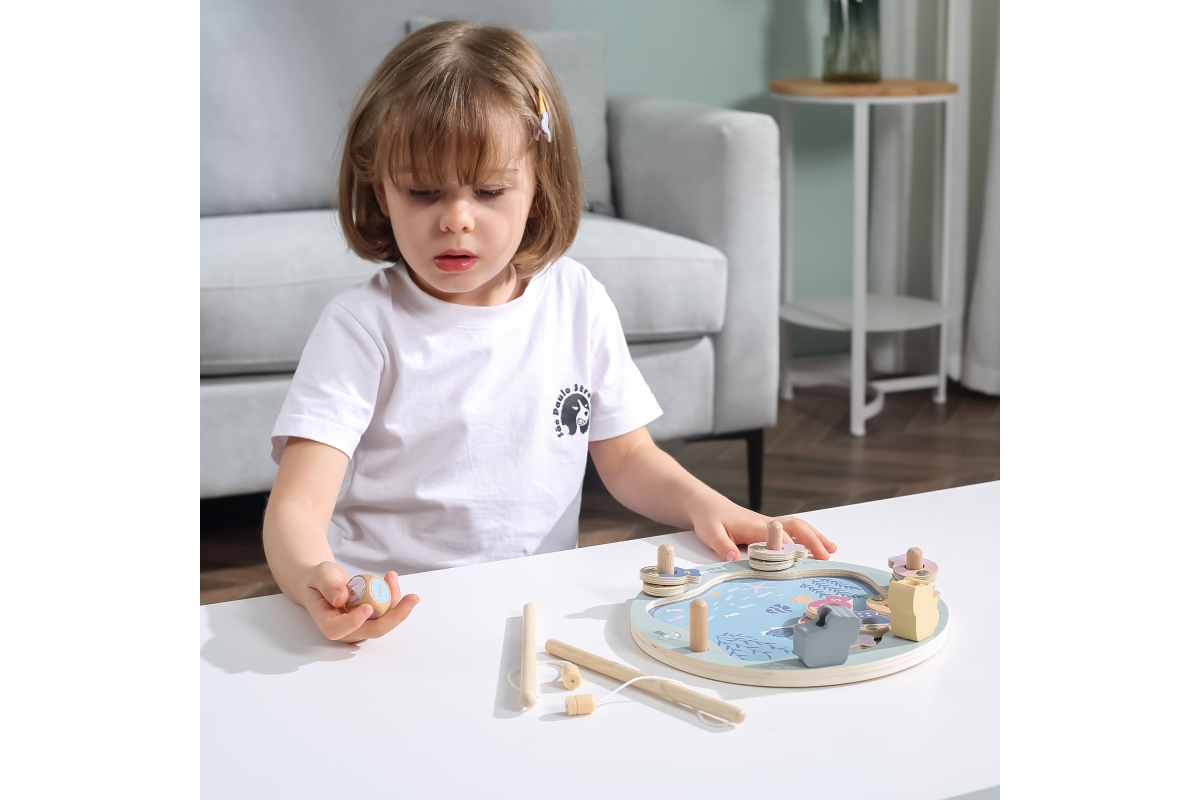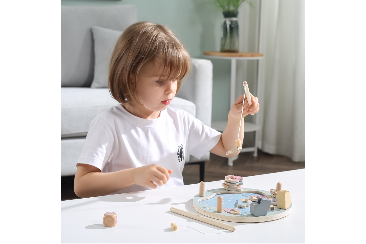 Tato magnetická rybářská hra se skládá z rybníka, 12 ryb, kostky a dvou rybářských prutů. Pomocí magnetických tyčí chyťte ryby a položte je na dřevěný kus. Ryby lze rozlišit buď podle barvy, nebo podle čísla na zadní straně, takže je to skvělý nástroj pro představení pojmů barva a číslo. Pomáhá pěstovat koordinaci ruka-oko a trpělivost a zvyšuje sebevědomí. Rozmer hrací desky cca 22,5 x 21,5 cm. Rozměr balení cca 23,5 x 23,5 x 6 cm. Věk 18m+