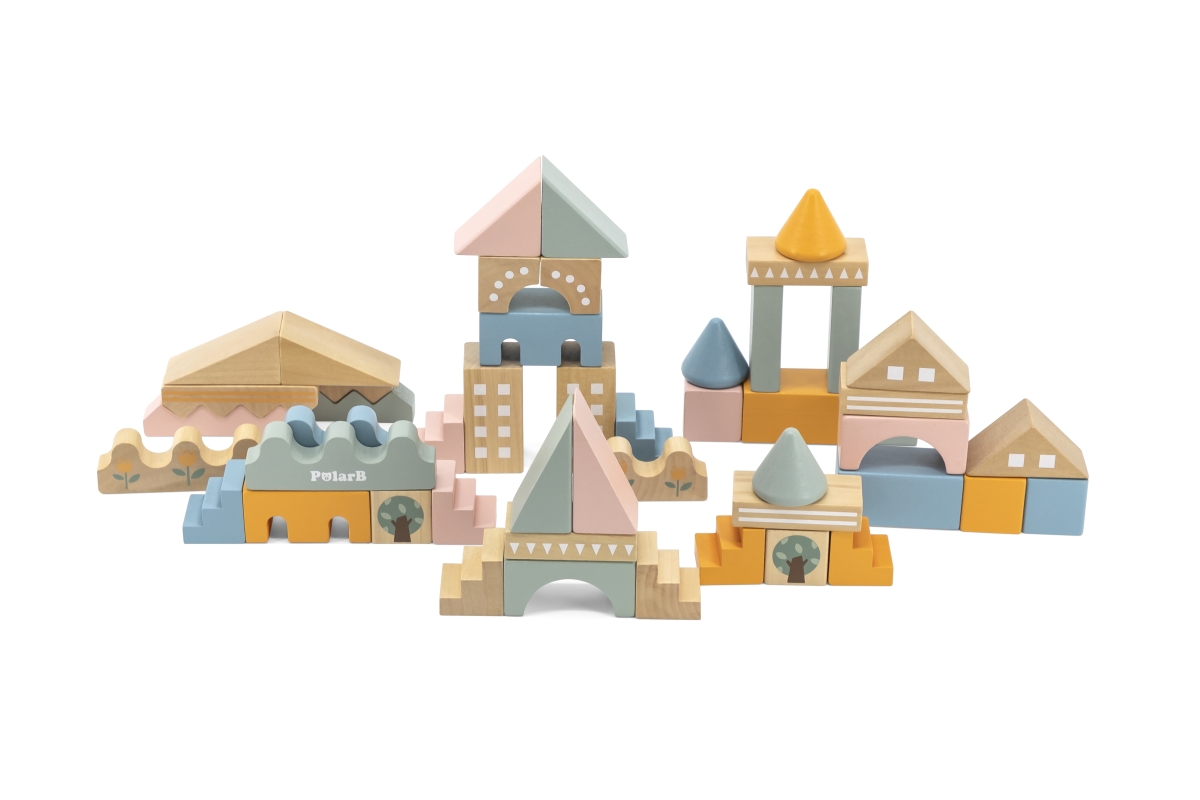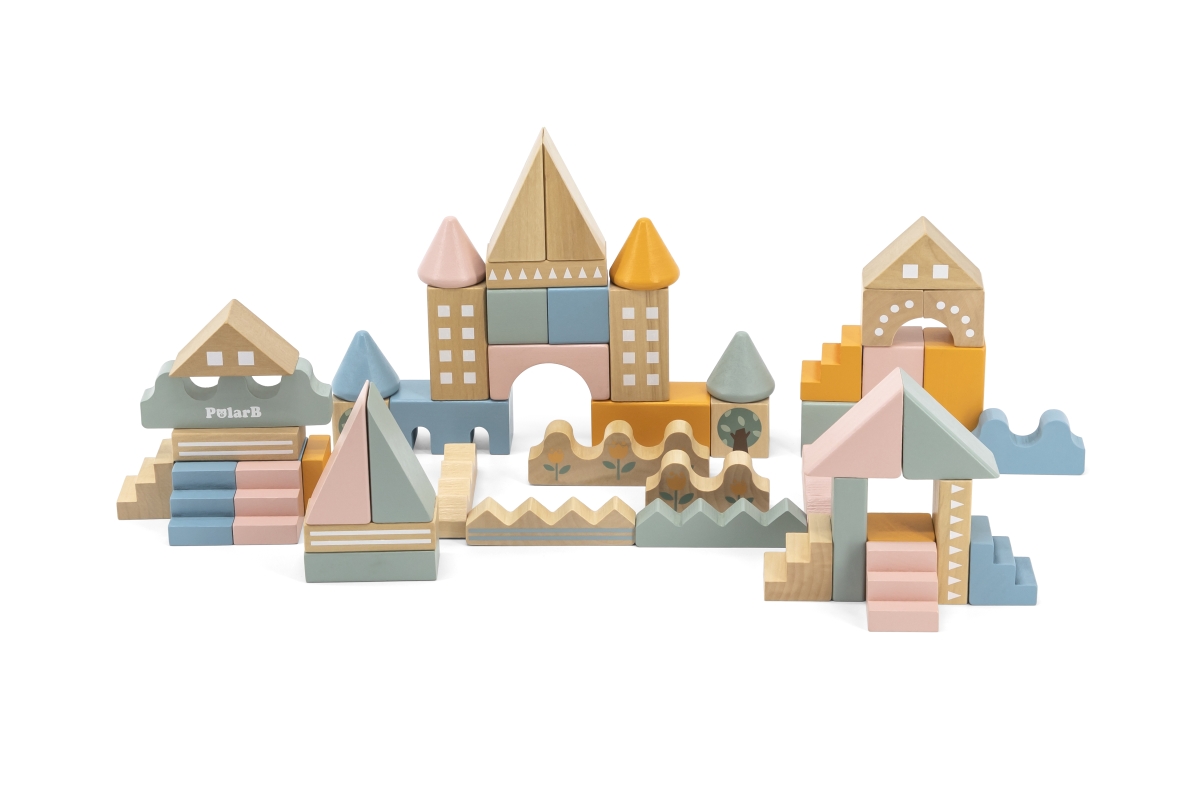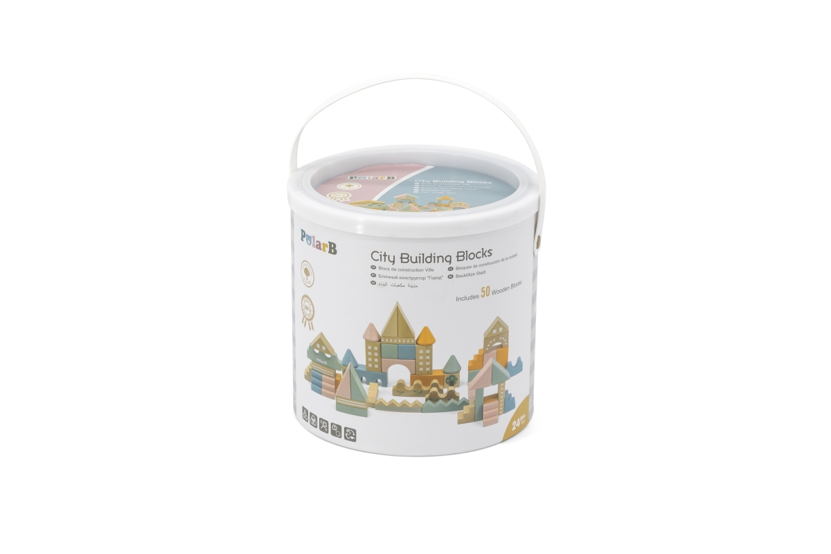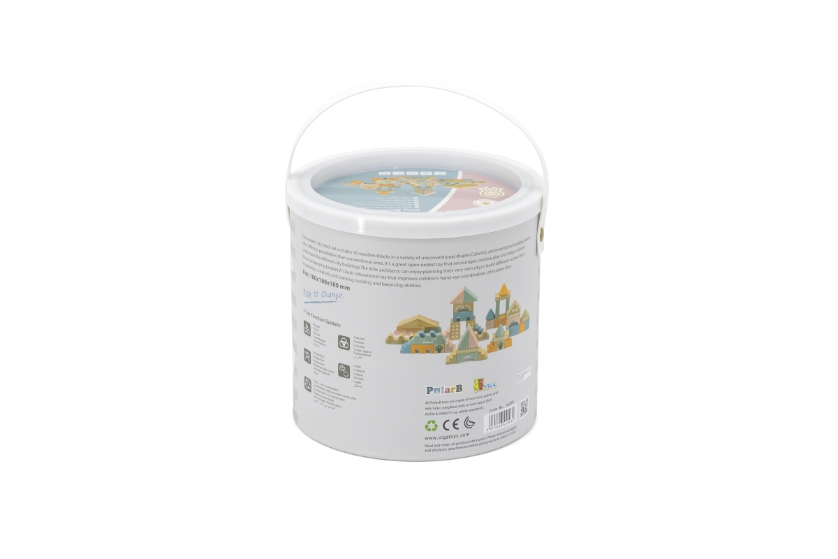 Dřevěná stavebnice v kyblíku. Obsahuje 50 dílků a obrázkovou brožuru s návody na stavění. Rozměry balení cca 18 x 18 cm. Velikost kostek 2,5 - 9 cm dl..