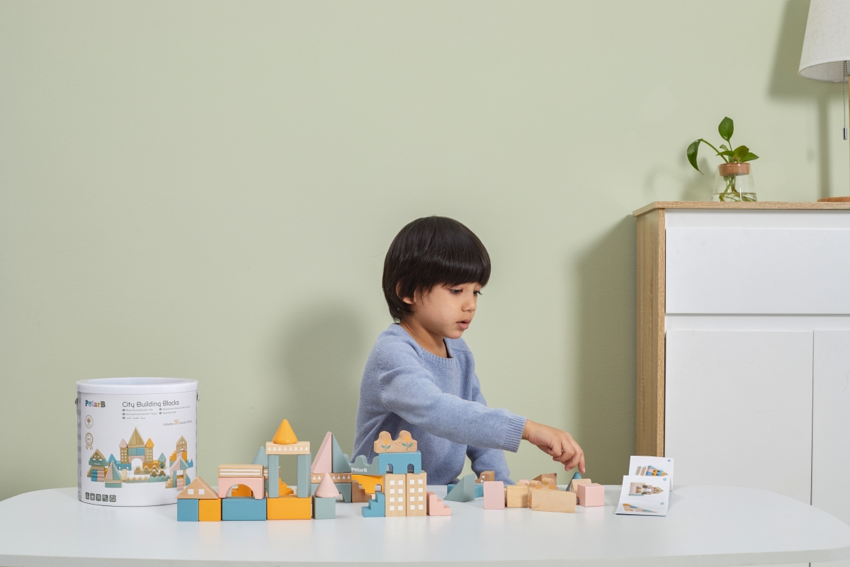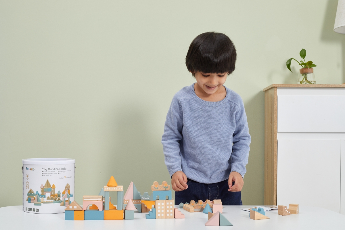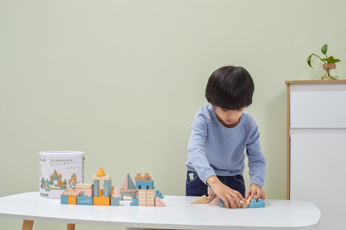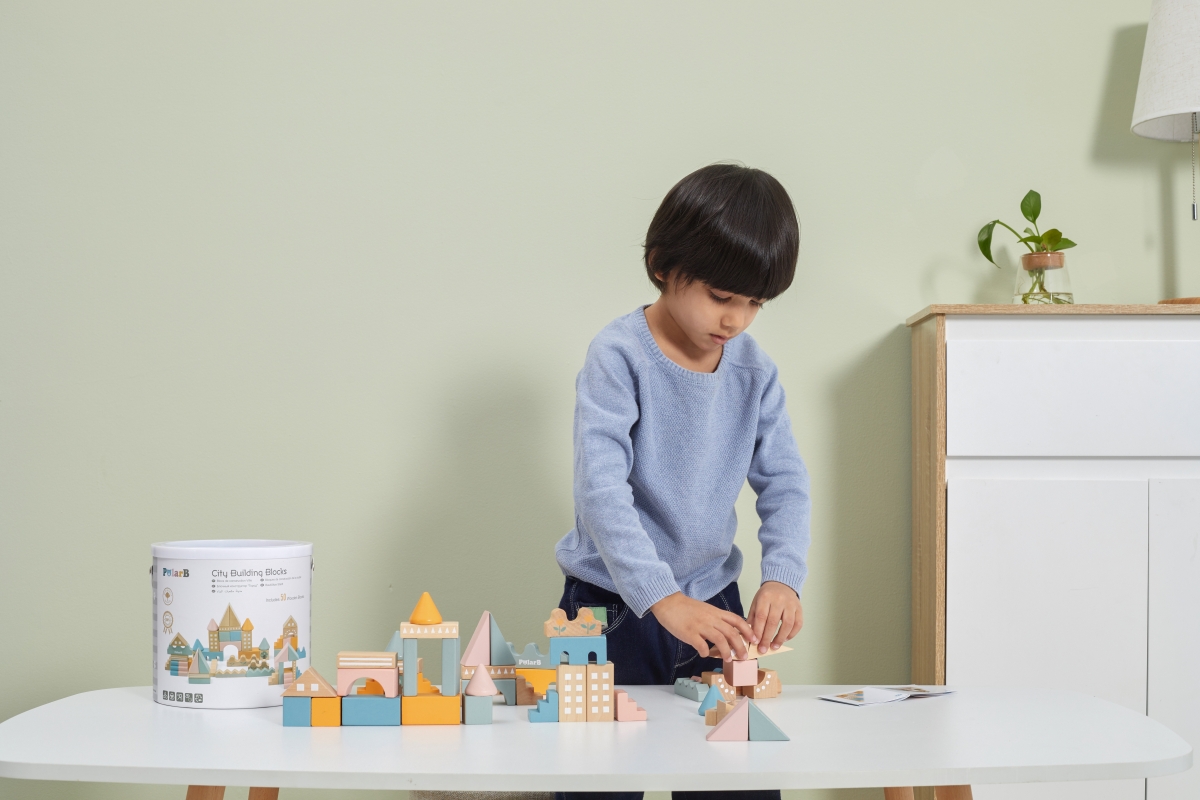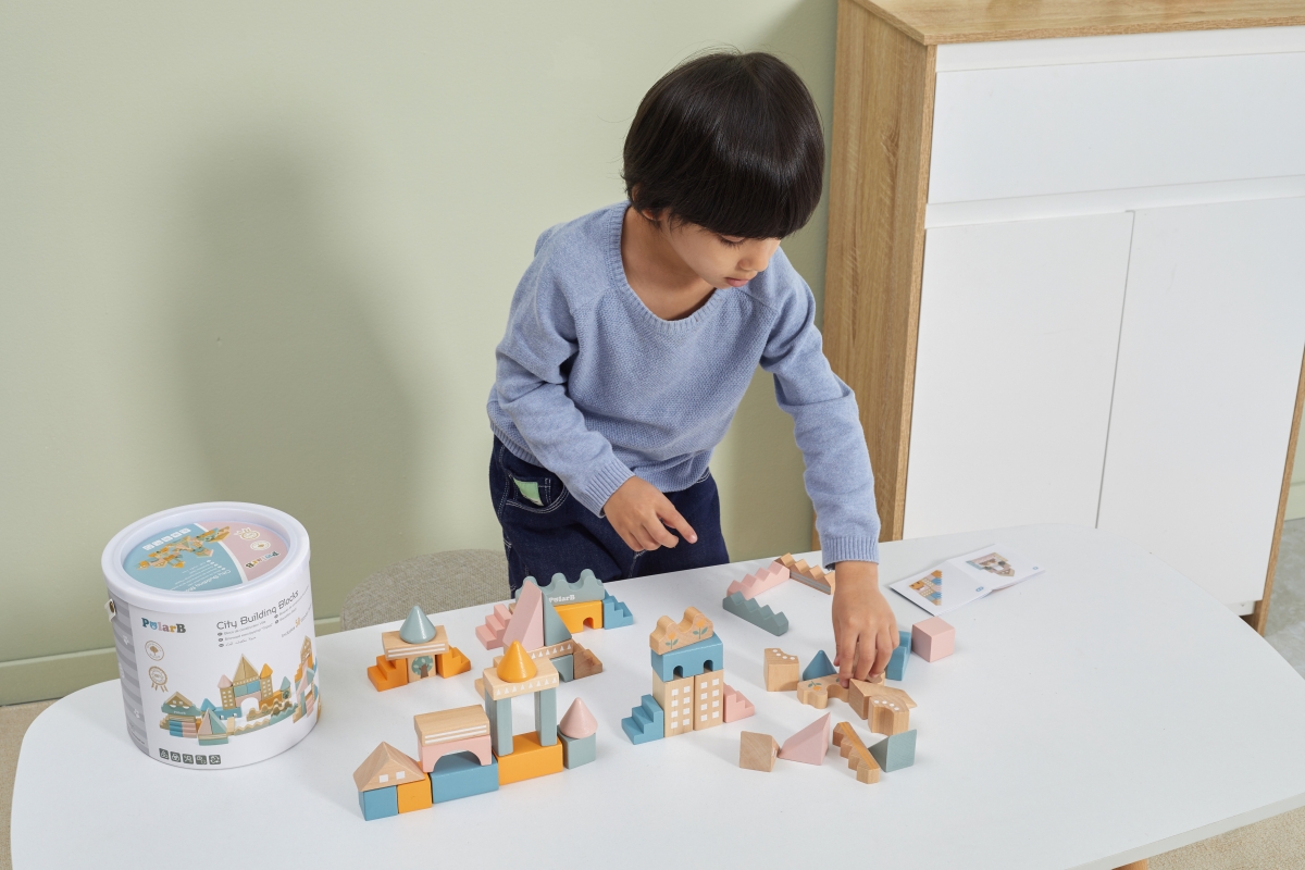 Dřevěná stavebnice v kyblíku. Obsahuje 50 dílků a obrázkovou brožuru s návody na stavění. Rozměry balení cca 18 x 18 cm. Velikost kostek 2,5 - 9 cm dl..