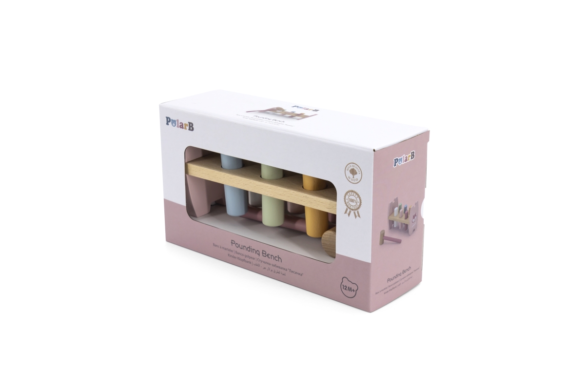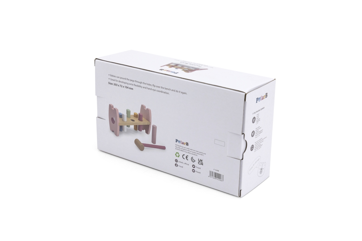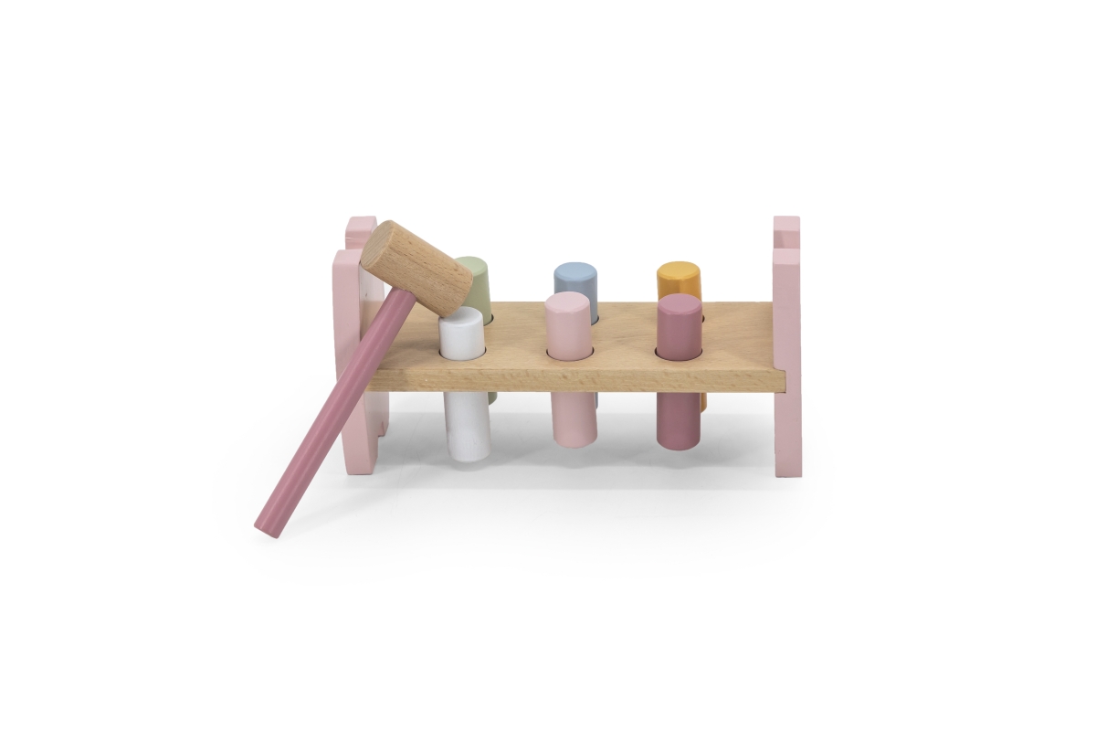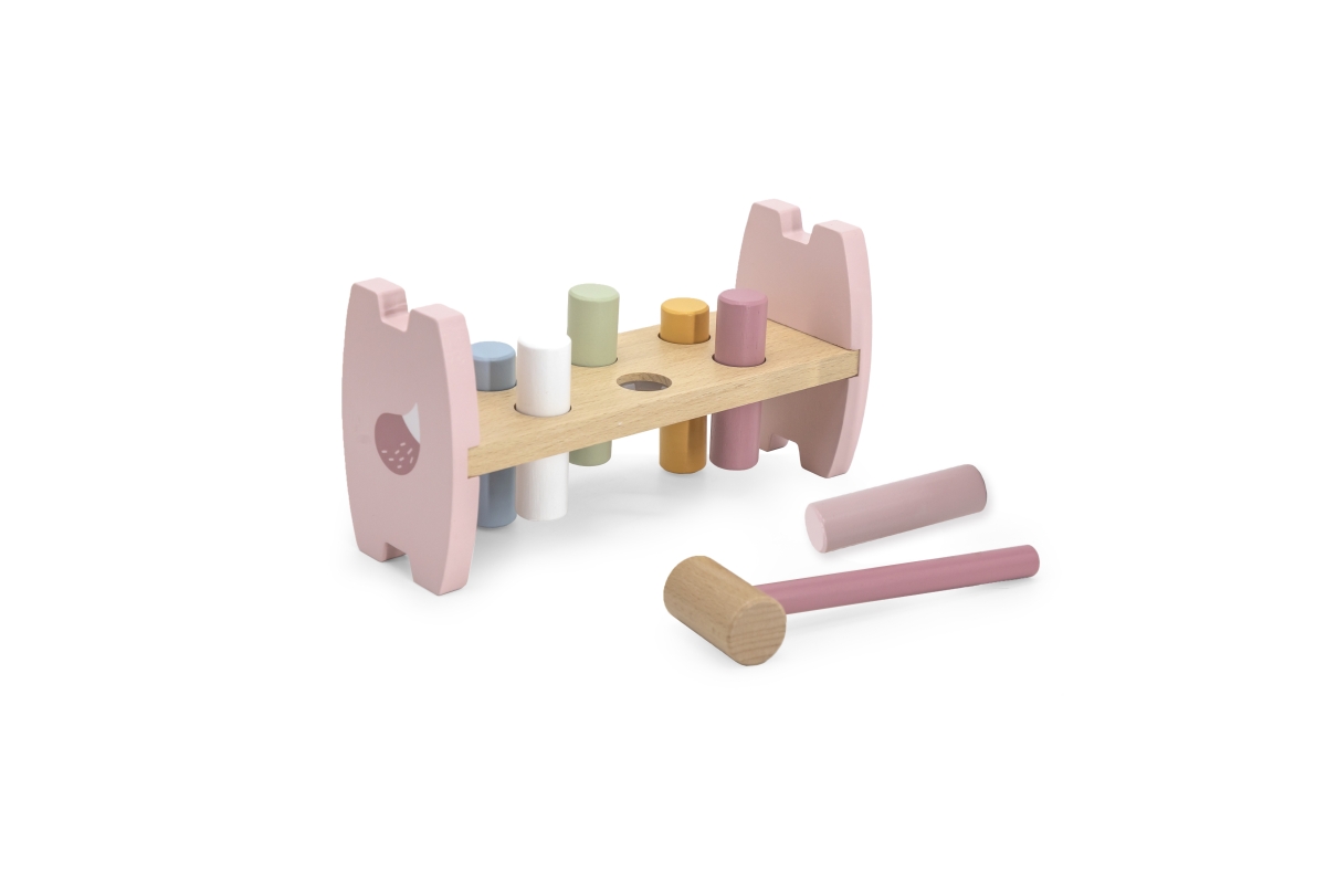 Dřevěná zatloukačka pro nejmenší děti o velikosti 20,3x7,2x10,4 cm. Rozměry balení cca 24x14x8 cm. Věk 12m+..