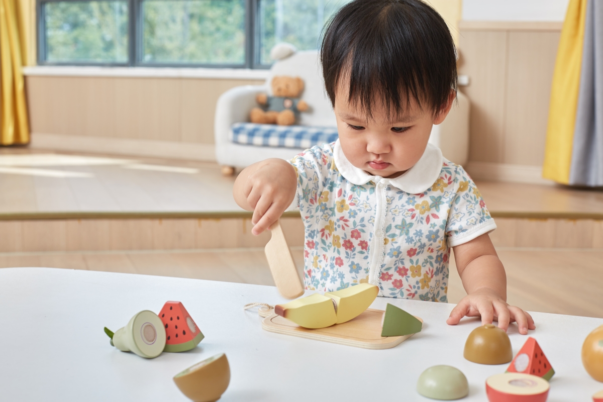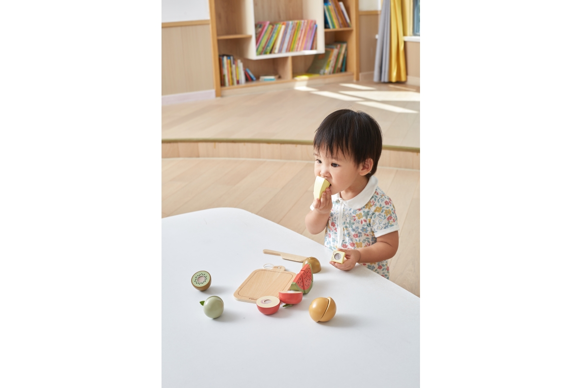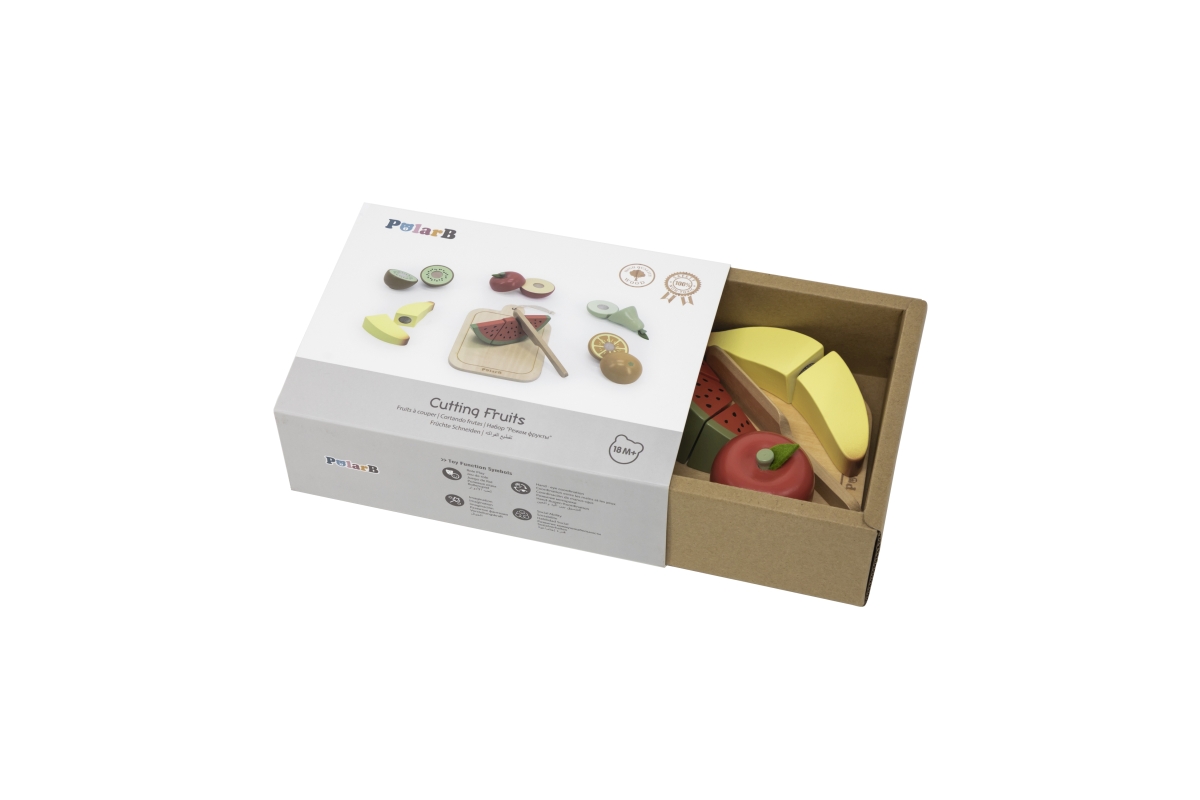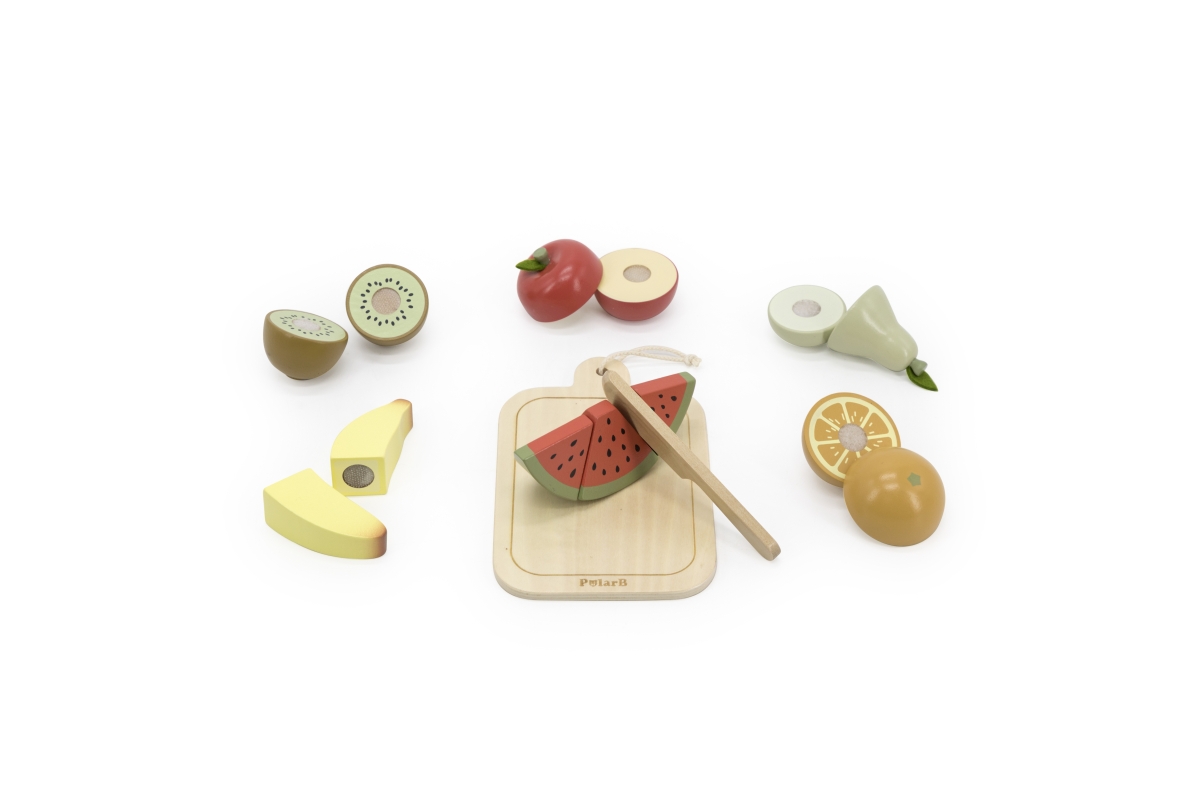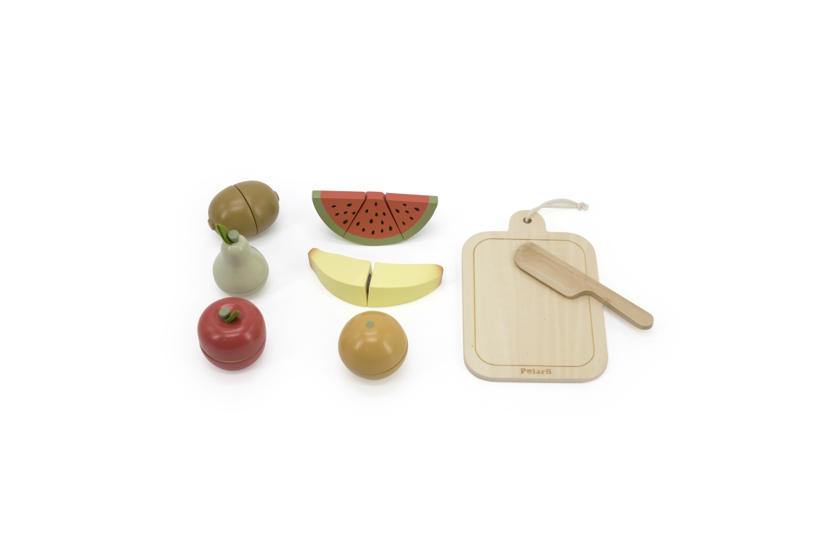 Dřevěné krájení ovoce. Balení obsahuje prkénko, nůž a 6 kusů různého ovoce. Ovoce je rozpůleno a spojeno suchým zipem. Rozměry prkénka 11x17x6 cm. Roz..