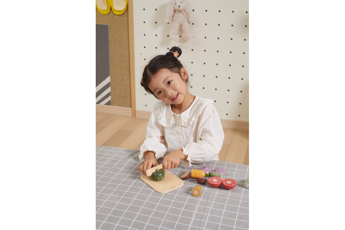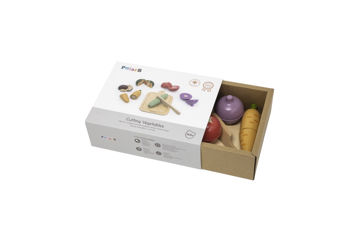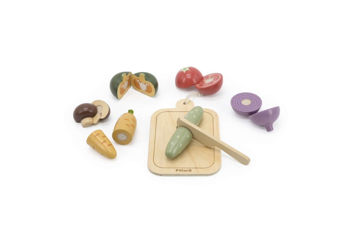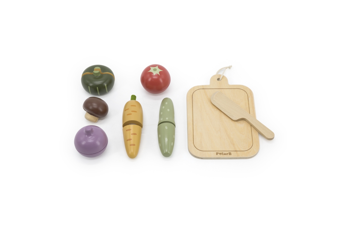 Dřevěné krájení zeleniny. Balení obsahuje prkénko, nůž a 6 kusů různých druhů zeleniny. Zelenina je rozpůlená a spojená suchým zipem. Rozměry prkénka ..