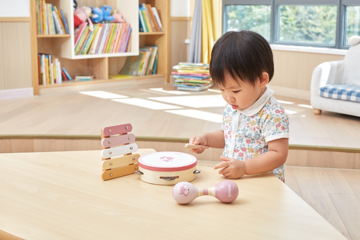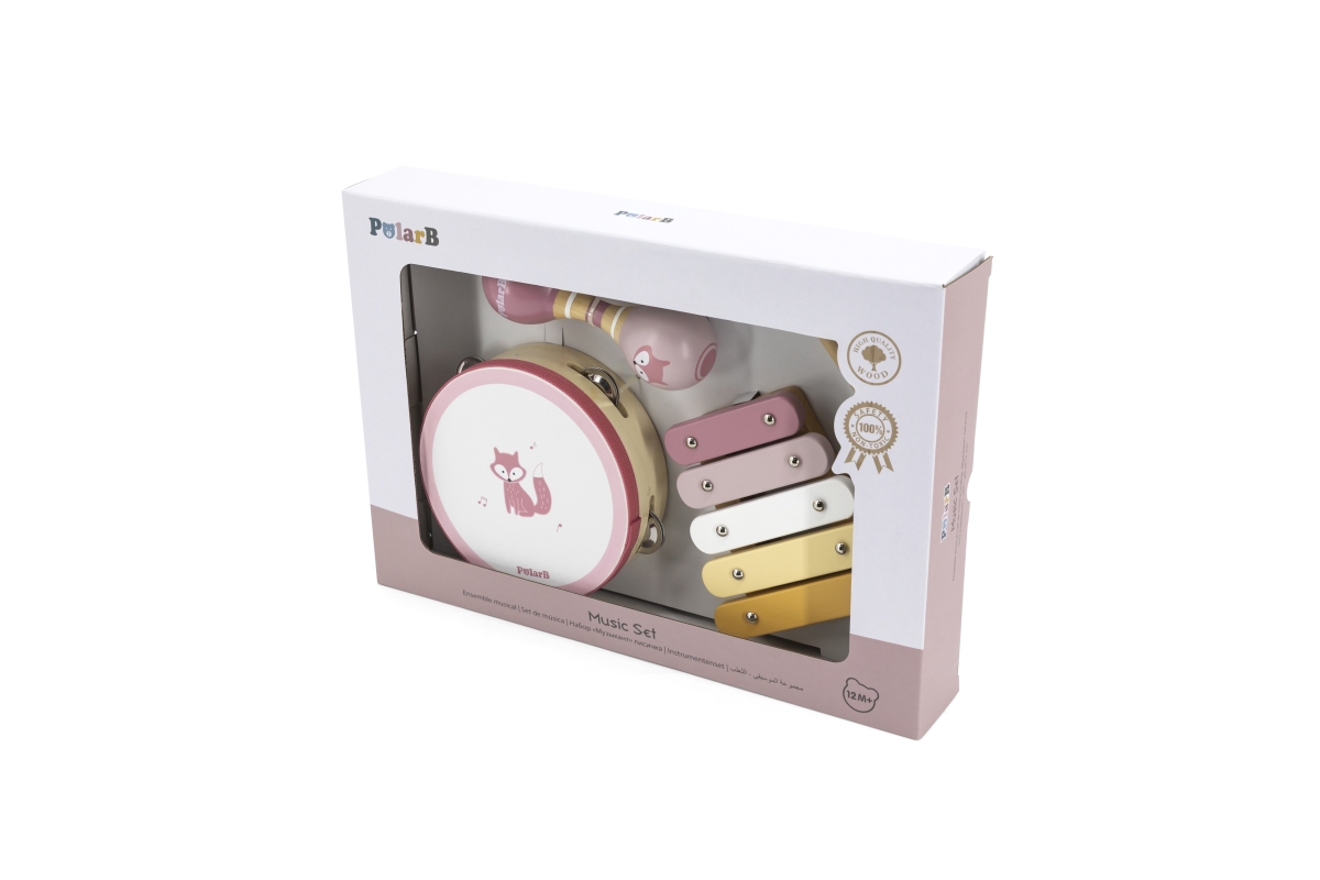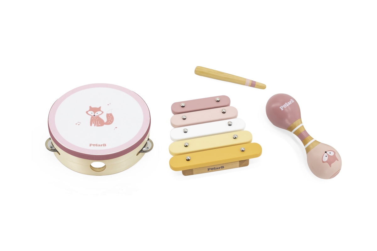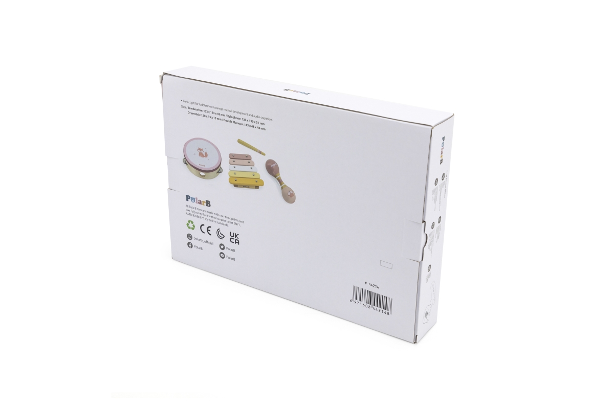 Sada dřevěných hudebních nástrojů. Balení obsahuje rumbakouli, xylofon s paličkou a bubínek. Rozměry balení cca 36x25x6 cm. Věk 12m+..