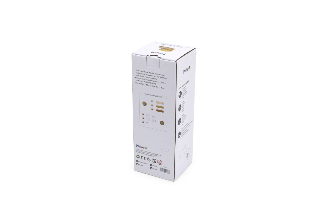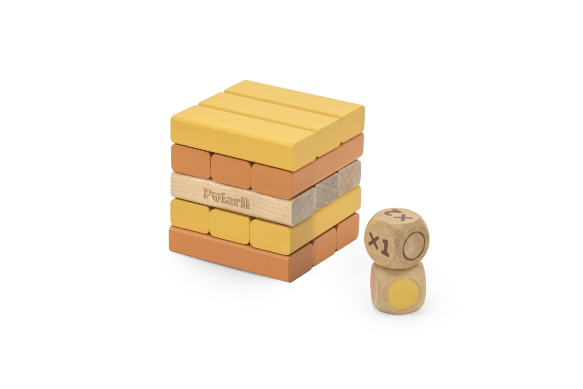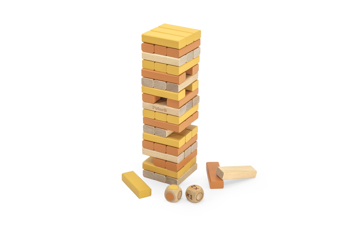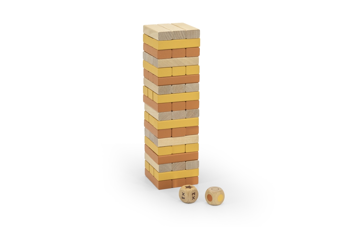 Dřevěná společenská hra věž. Balení obsahuje 54 kostiček o velikosti 6x2x1,2 cm a 2 hrací kostky. Cílem hry je odebírat jednotlivé kostičky dle barev ..