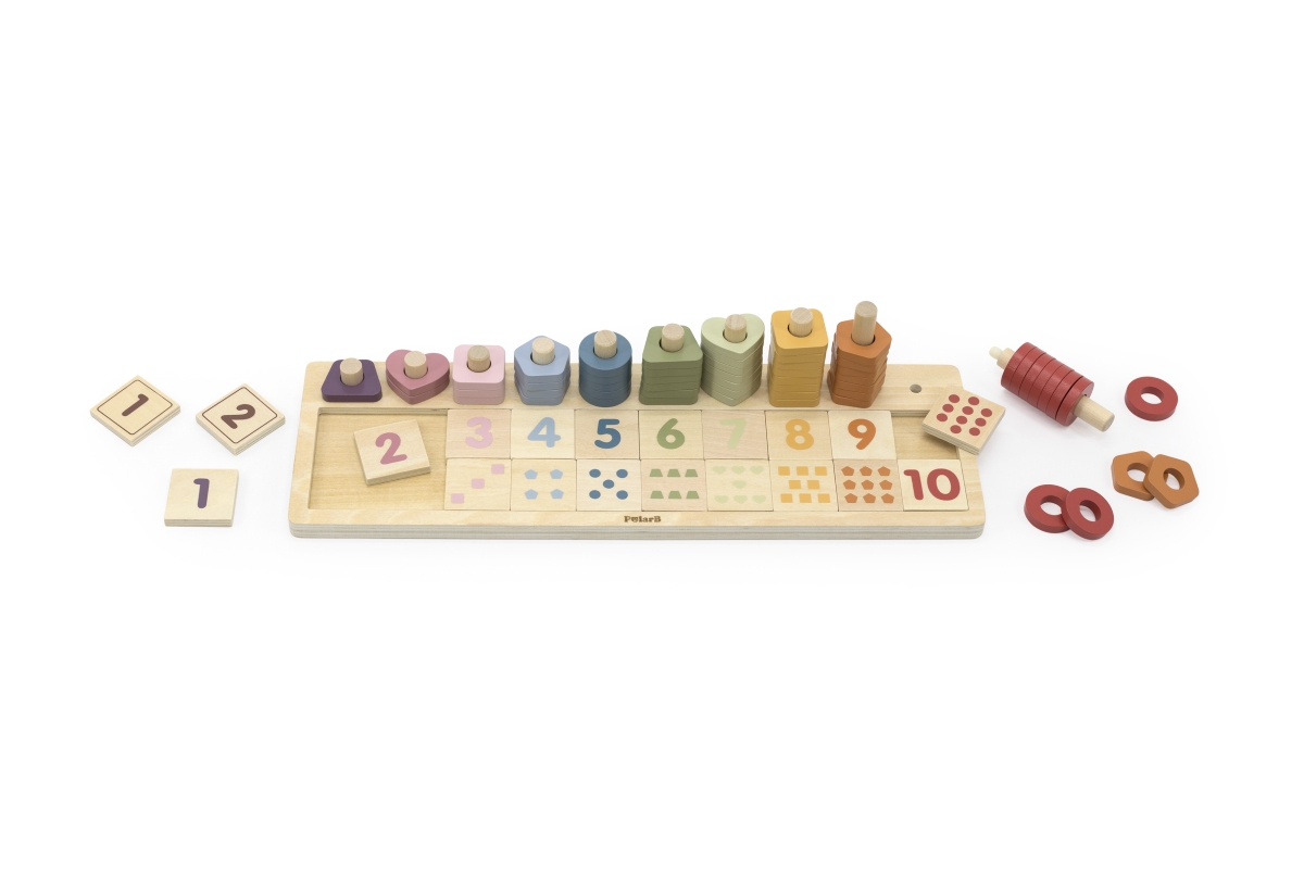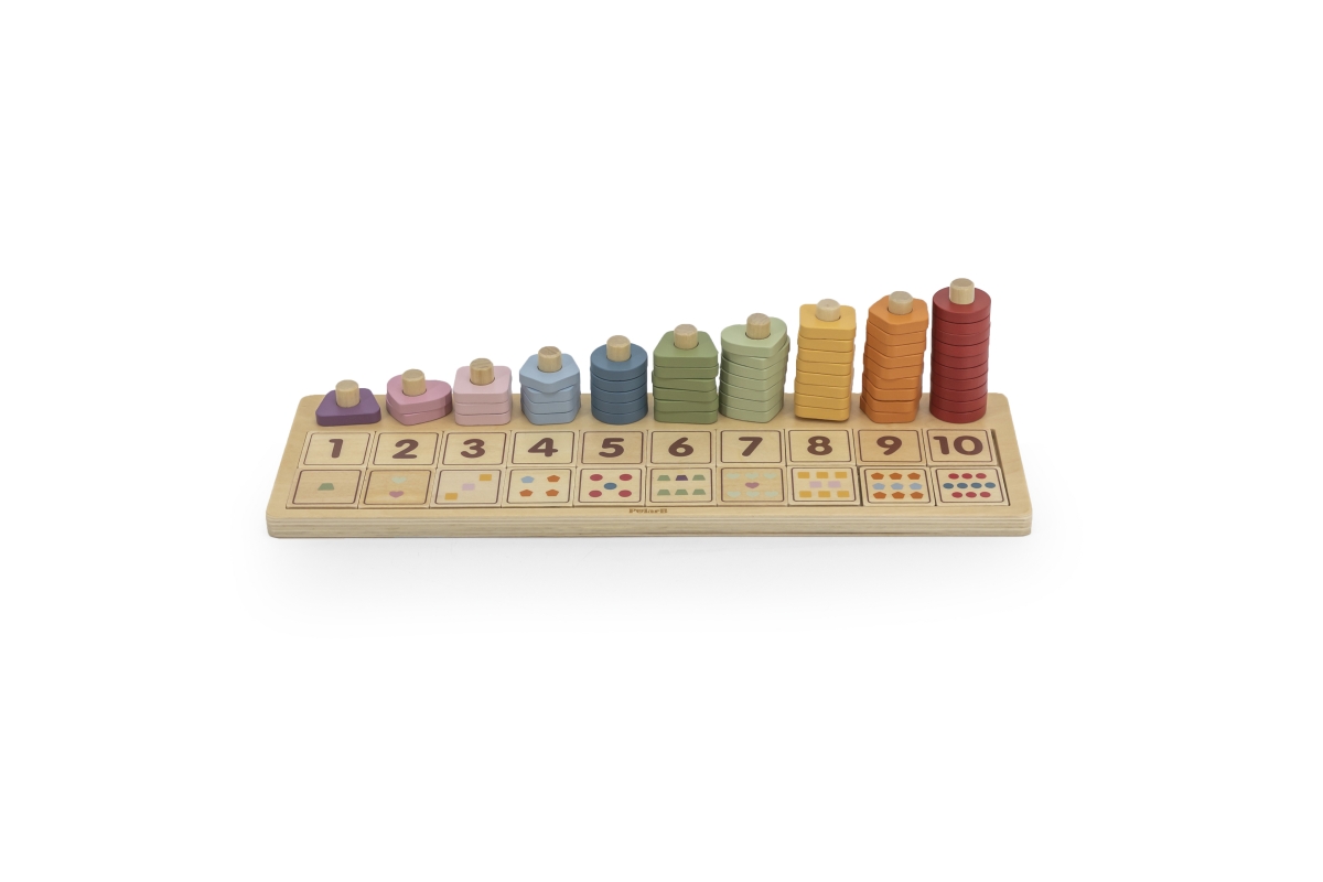 Dřevěná hra určená k trénování počítání do deseti. Hra obsahuje desku, stojánky určené k navlékání určitého počtu různých tvarů, kostičky s čislicemi ..