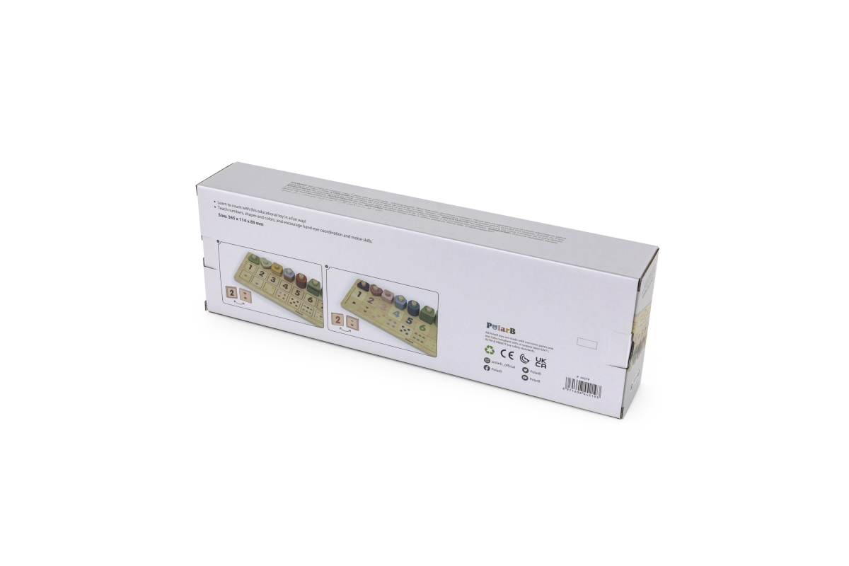 Dřevěná hra určená k trénování počítání do deseti. Hra obsahuje desku, stojánky určené k navlékání určitého počtu různých tvarů, kostičky s čislicemi a kostičky s obrázkama. Rozměry hry 36,5x11,4x8,5 cm. Rozměry balení cca 37x13x6 cm. Věk 3+