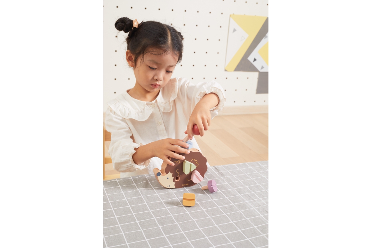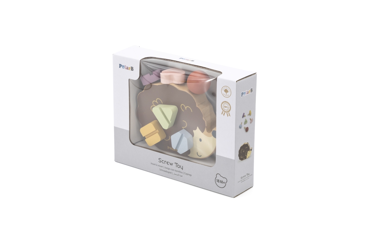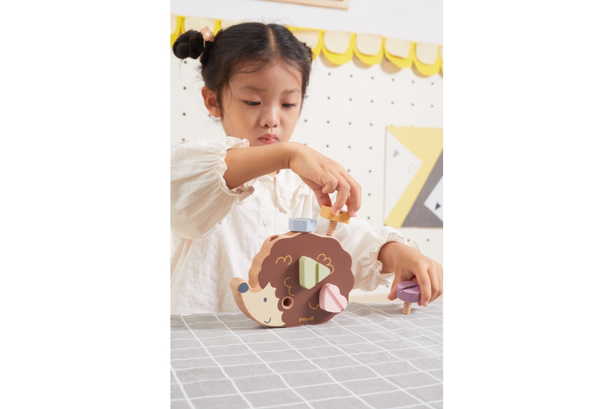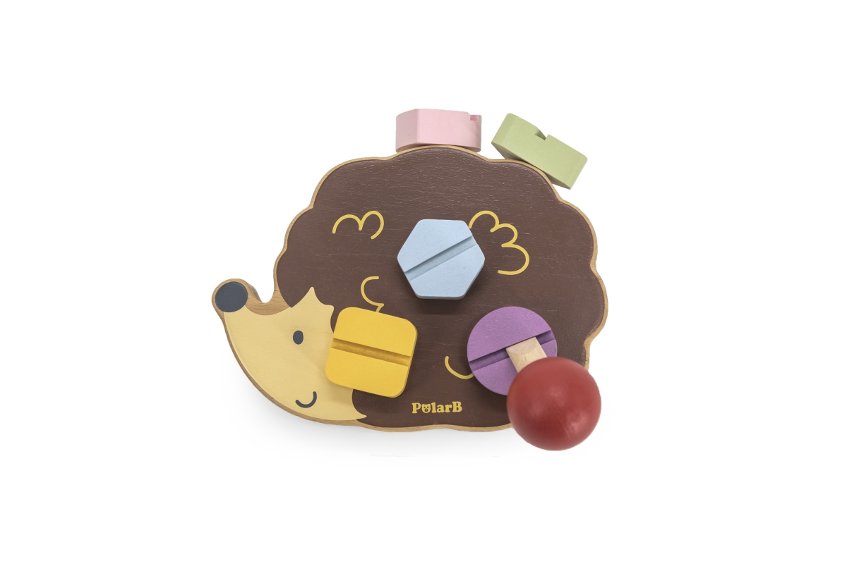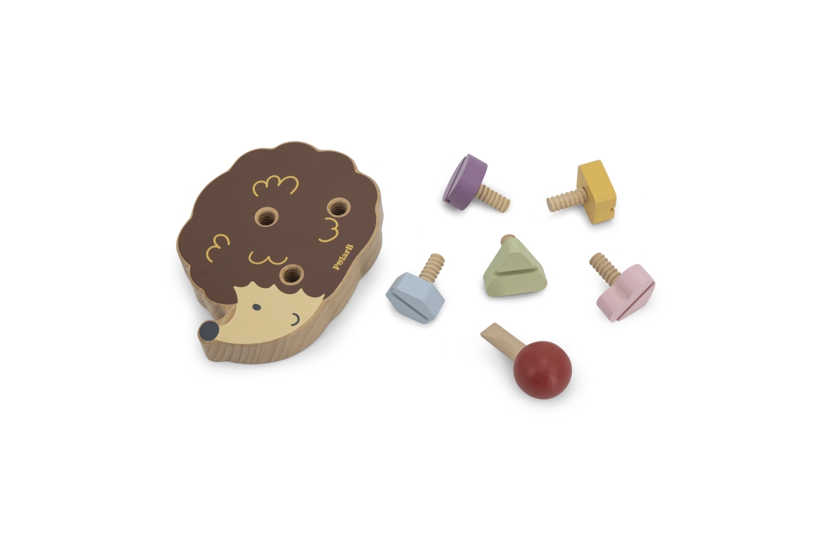 Dřevěný šroubovací ježek. Balní obsahuje ježka a 6 šroubků s tvary. Rozměry 15x39x13 cm. Rozměry balení cca 21,5x16,5x5 cm. Věk 18m+..