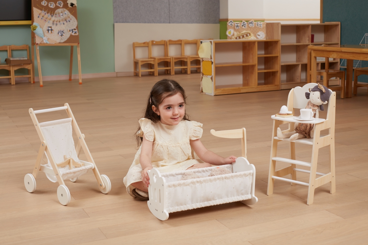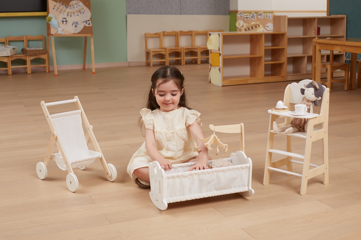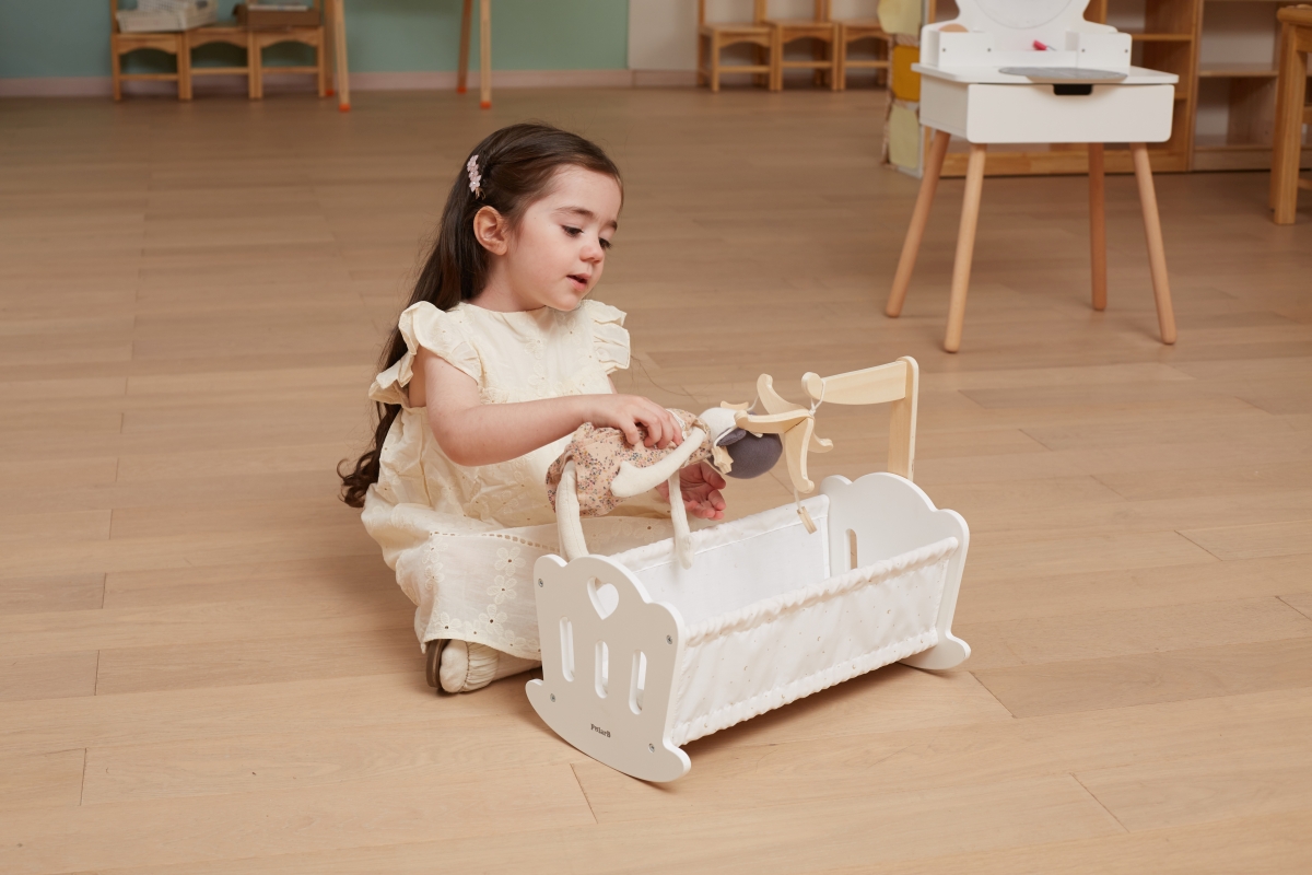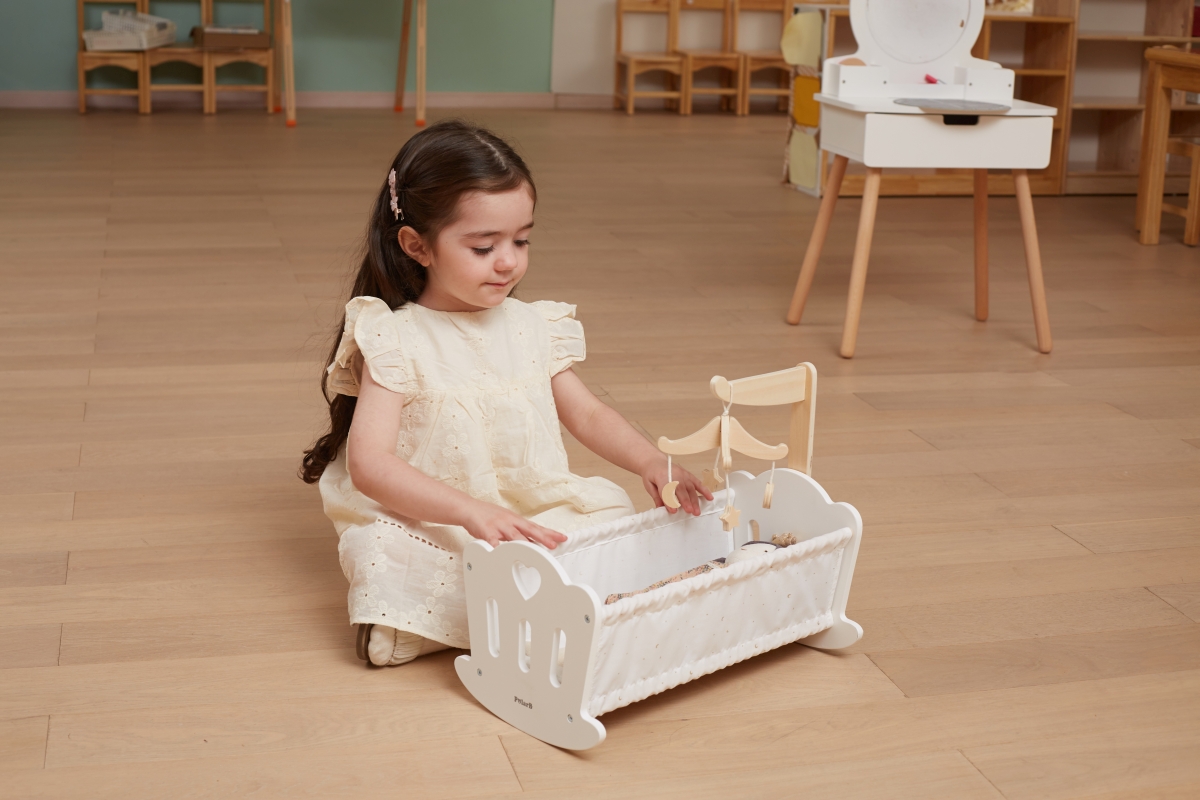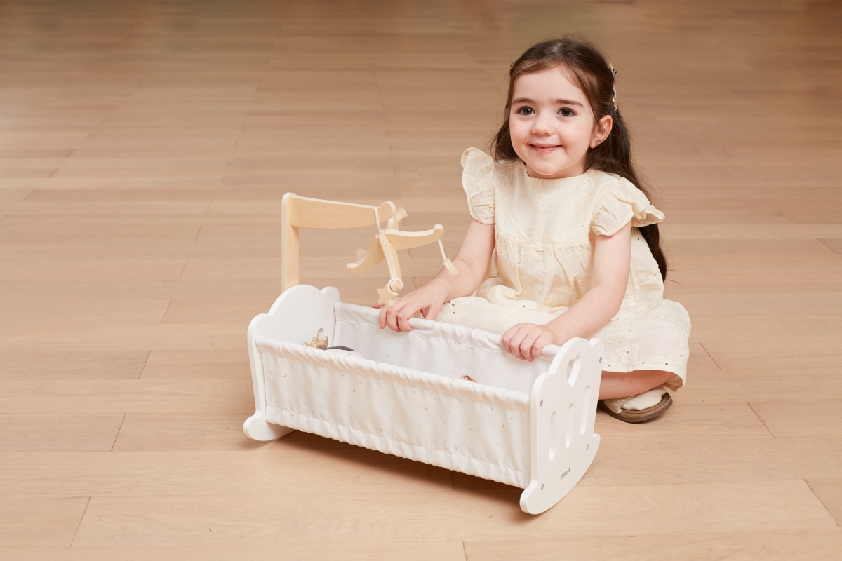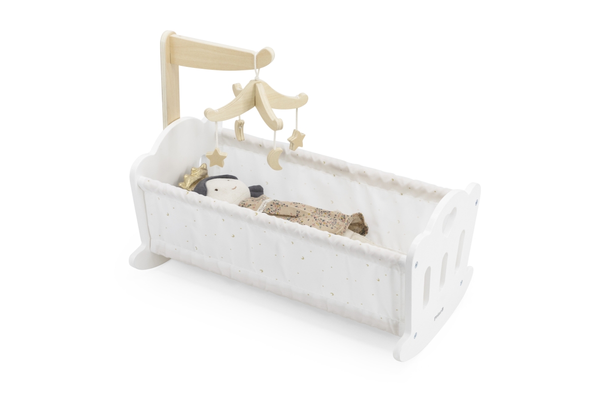 Dřevěná postýlka pojme panenku do velikosti 38 cm. Součástí balení je také bavlněný polštářek a kolotoč nad postýlku. Rozměry balení cca 46x22,5x6 cm..