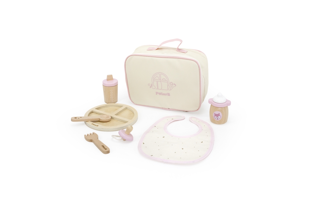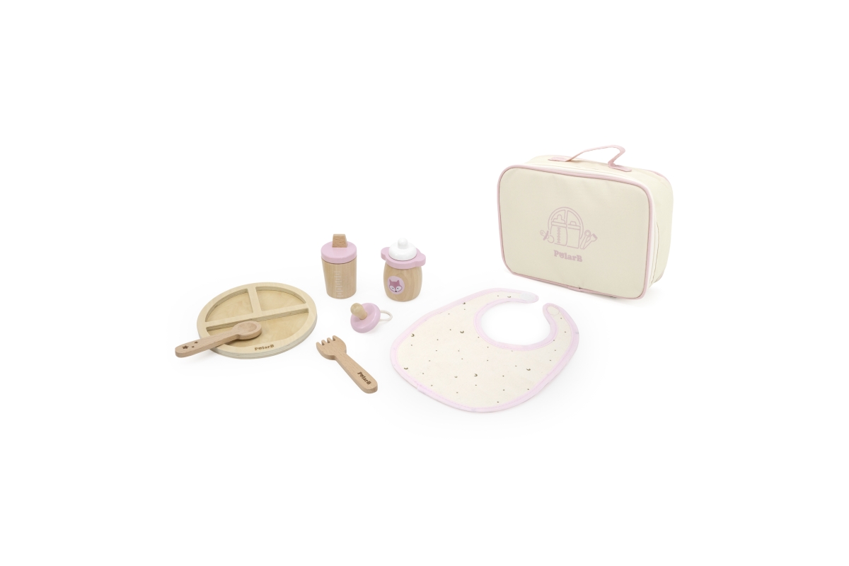 Dřevěná sada pro miminko v praktické látkové taštičce na zip. Balení obsahuje talířek, lžičku, vidličku, lahvičky, dudlík a bryndák. Rozměry balení cc..