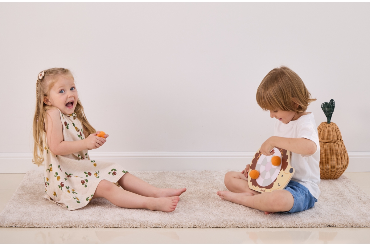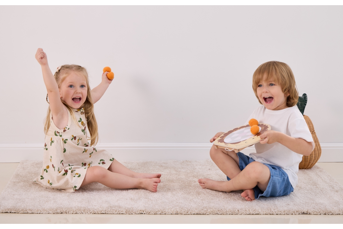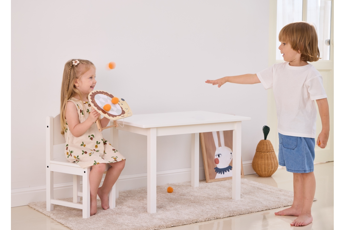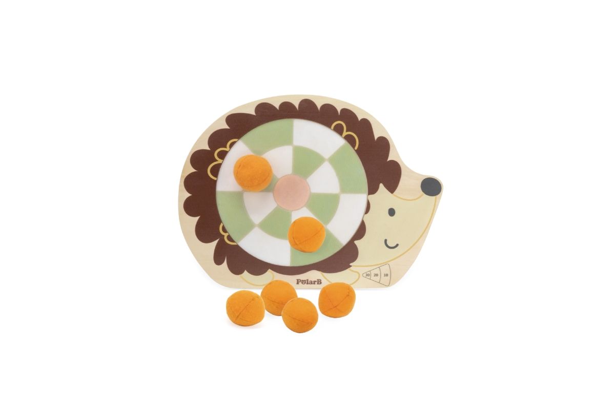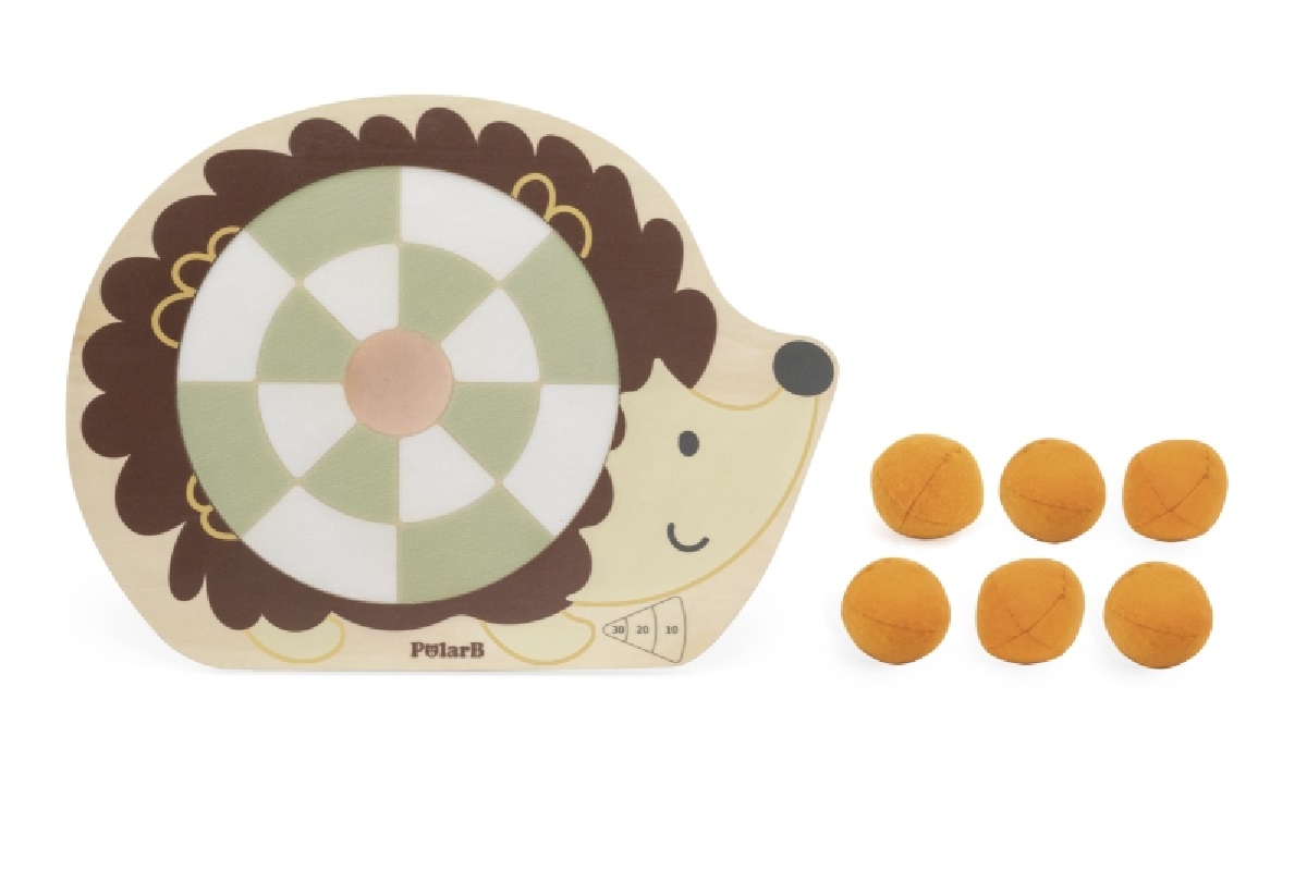 Dřevěný terč s motivem ježka. Terč lze postavit pomocí stojánku umístěného na zadná straně.. Balení obsahuje 6 látkových míčků. Rozměry terče 30x7,5x2..