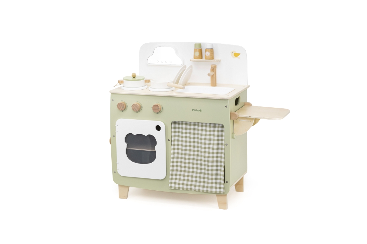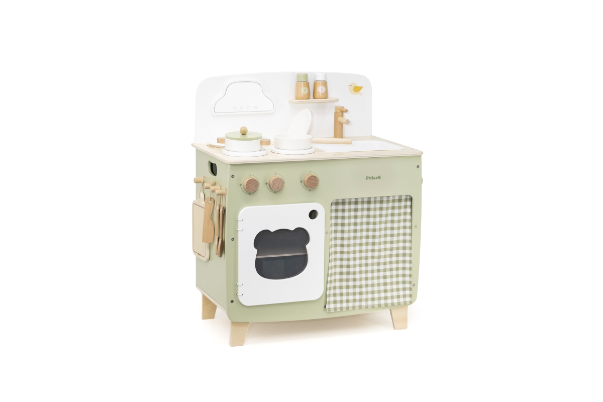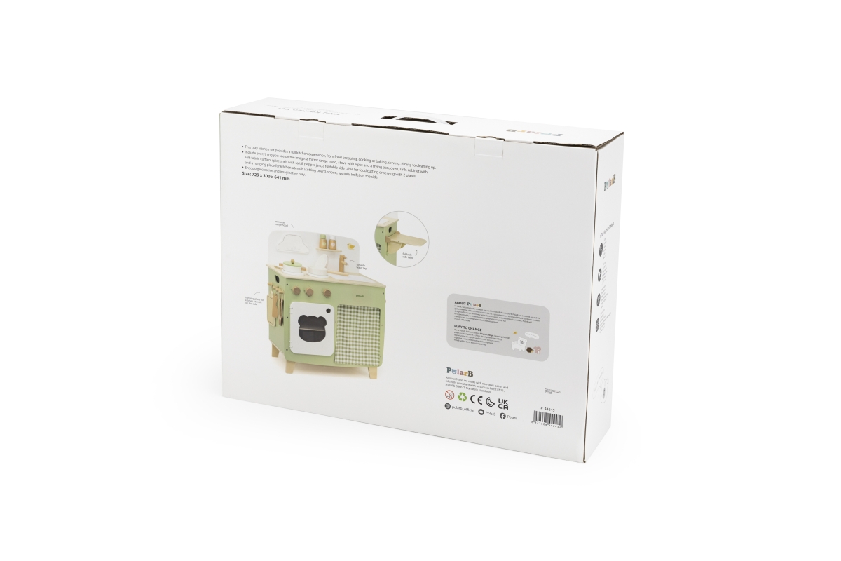 Dřevěná kuchyňka s doplňky. Balení obsahuje zrcadlový odsavač par, sporák s hrncem a pánvičkou, troubu, dřez, skříňku se závěsem, slánky s pepřenkou a jiné menší doplňky. Rozměry balení cca 59x47x15 cm. Rozměry výrobku 72,9x30x64,1 cm. Věk 3+