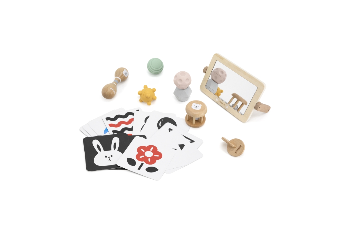 Box s aktivitami pro nejmenší děti. Balení obsahuje zrcadlo, kartičky s obrázky, senzorické míčky, rumbakouli a 2 dřevěné hlavolamy. Rozměry balení 35..
