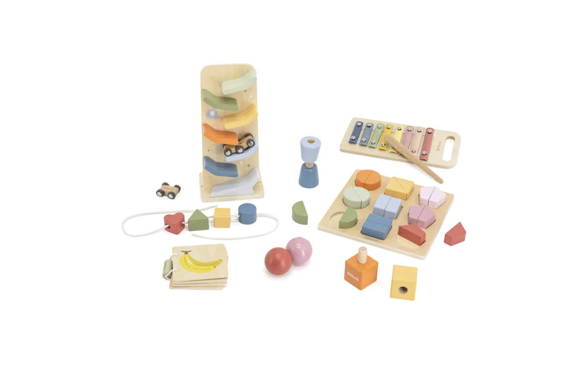 Dřevěné aktivity pro děti 18-24 měsíců. Vše pro rozvoj paměti a jemné motoriky. Sada obsahuje klouzačku s auty, xylofon, šroubky s tvary, knížku, prov..