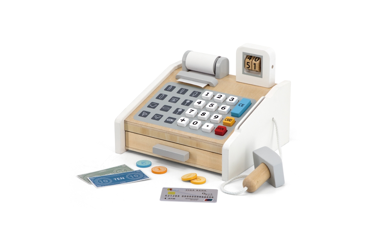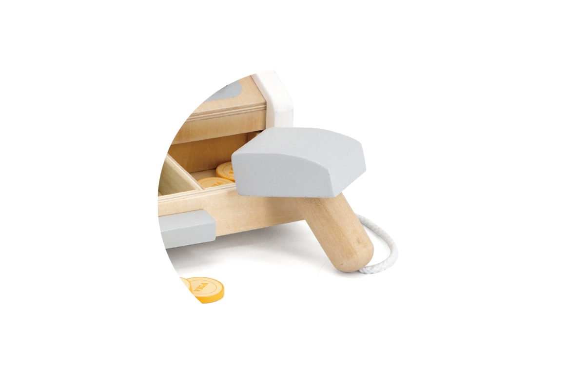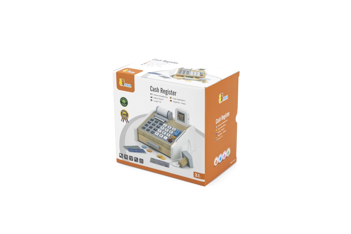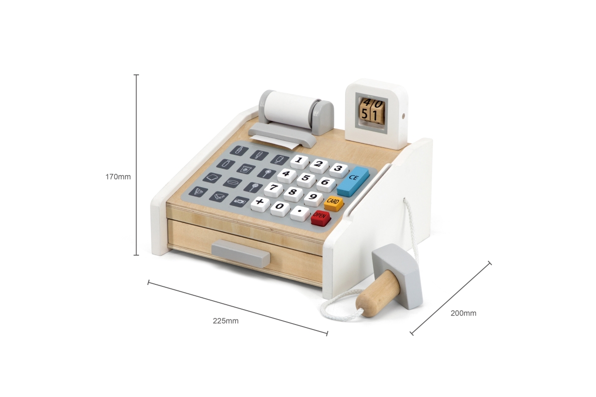 Dřevěná pokladna o velikosti cca 22 x 20,5 x 17 cm. Rozměry balení cca 23 x 21,5 x 14,5 cm. Věk 3+..