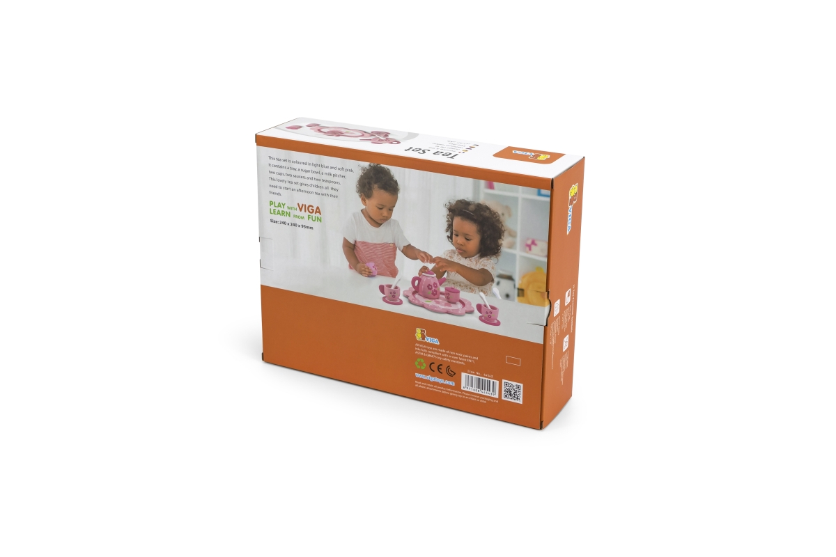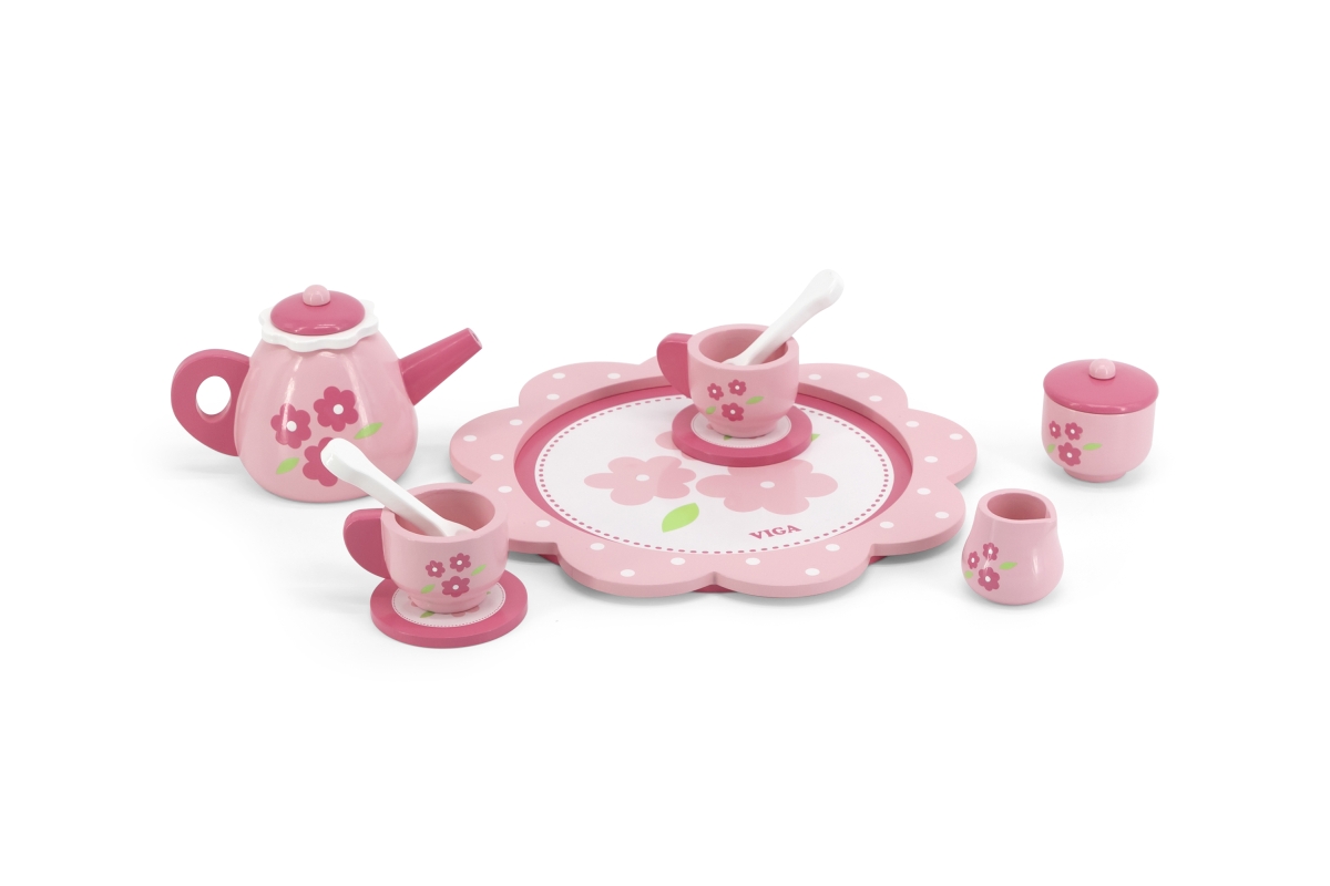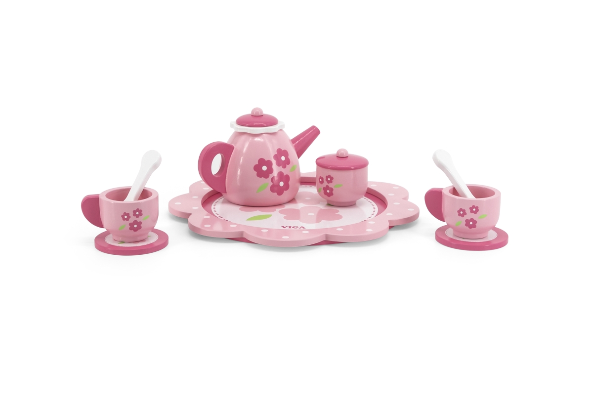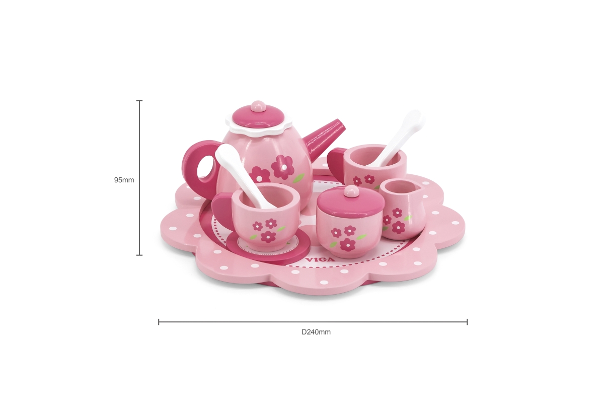 Dřevěný čajový set. Balení obsahuje podnos, konvičku, 2x hrneček, 2x podšálek, 2x lžičku, cukřenku a džbáněk na mléko. Rozměry cca 24 x 24 x 9,5 cm. R..