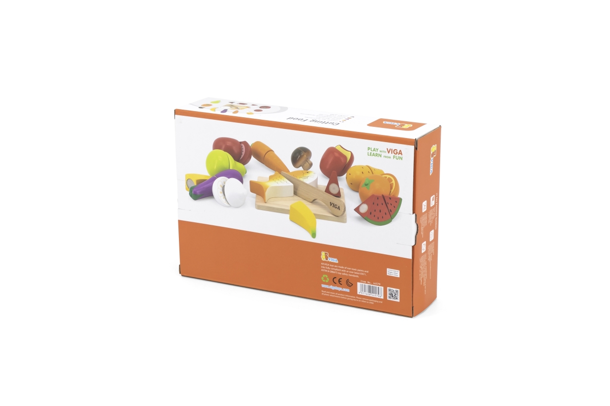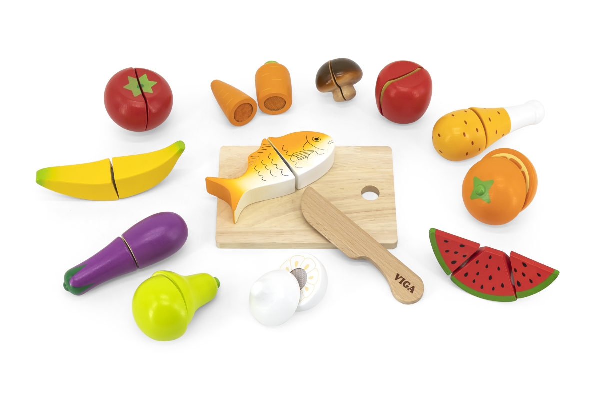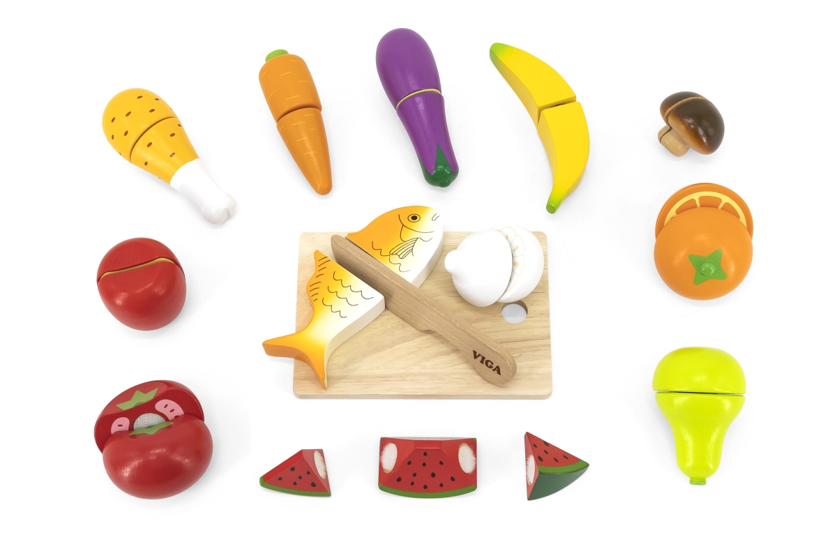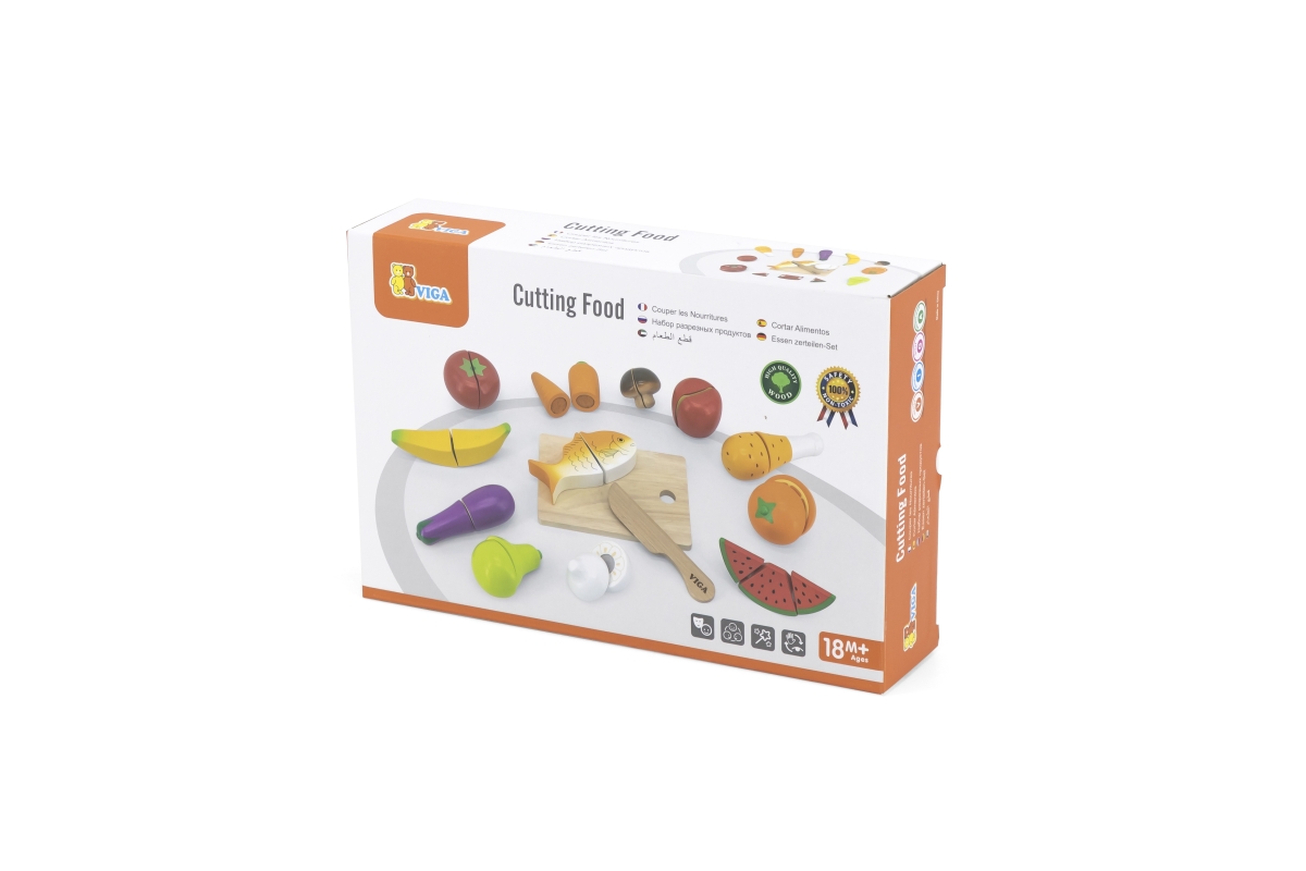 Sada dřevěných potravin na krájení obsahuje prkénko, nůž, rybu, rajče, mrkev, hříbek, banán, lilek, hrušku, česnek, meloun, pomeranč, kuřecí stehno, p..