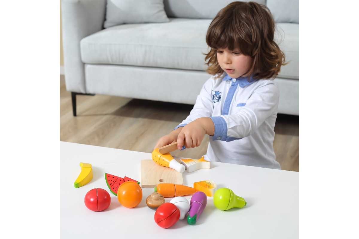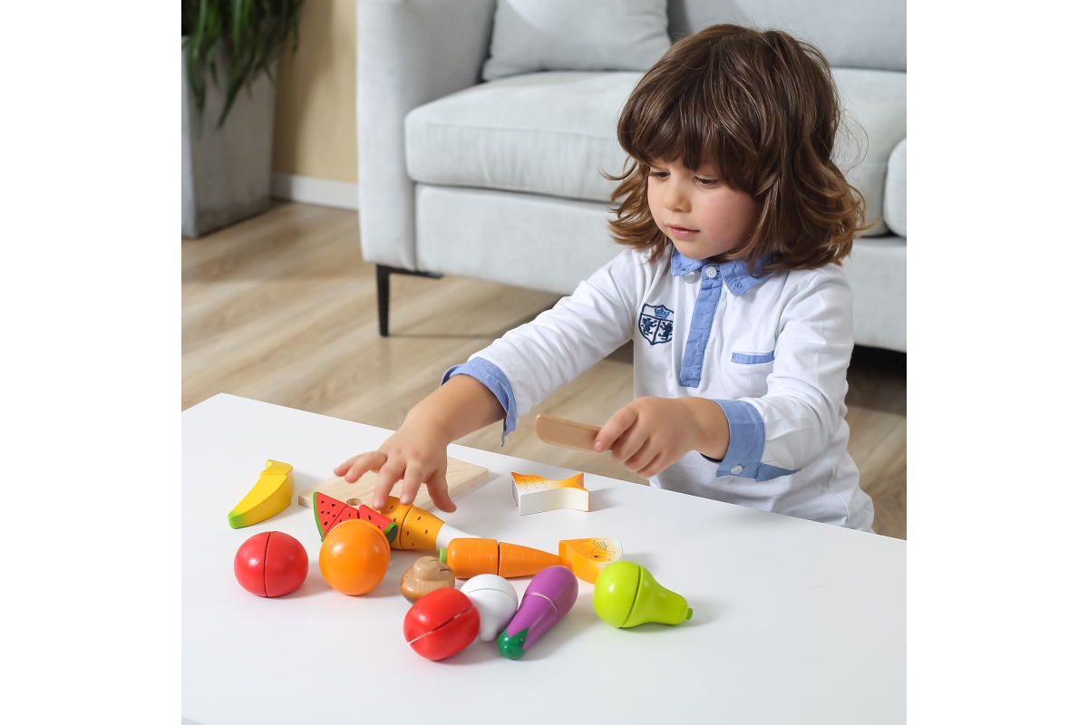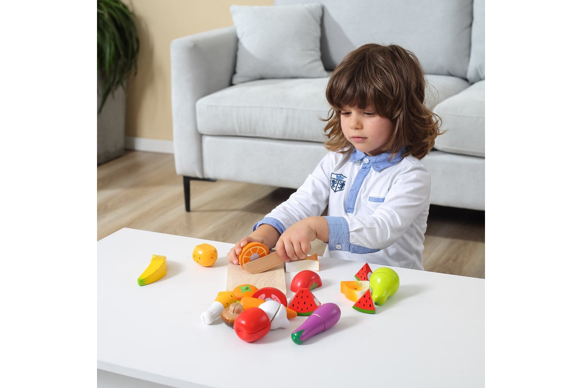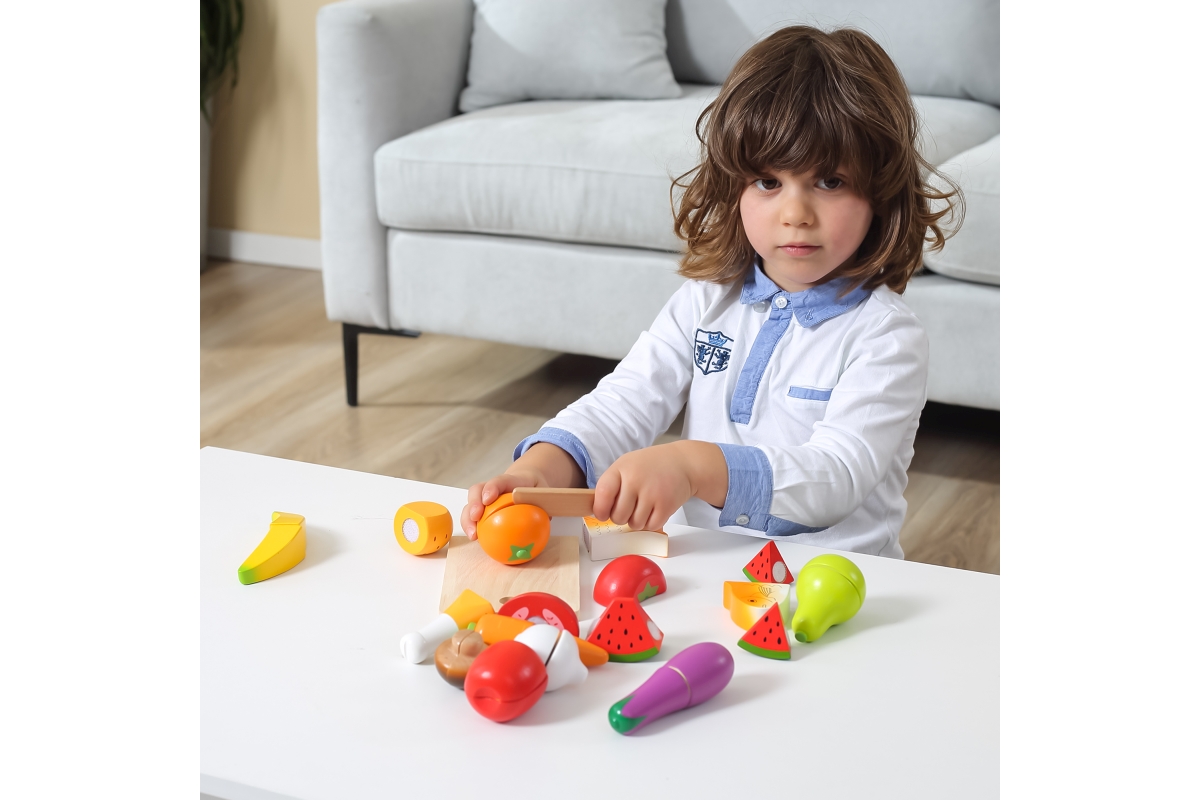 Sada dřevěných potravin na krájení obsahuje prkénko, nůž, rybu, rajče, mrkev, hříbek, banán, lilek, hrušku, česnek, meloun, pomeranč, kuřecí stehno, p..