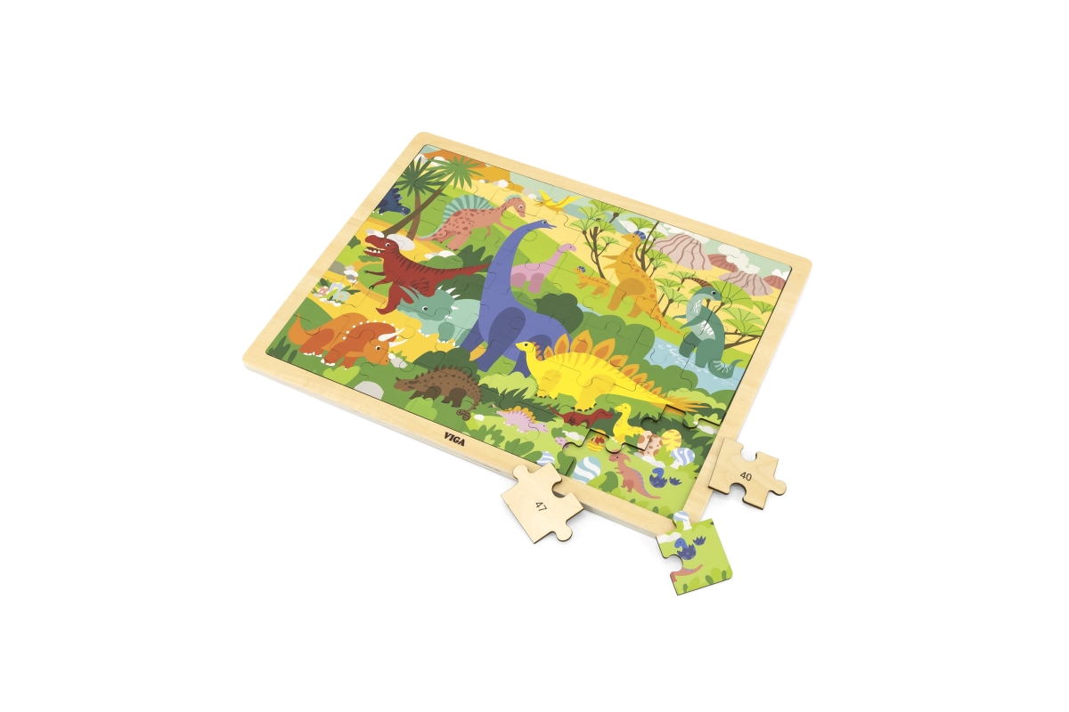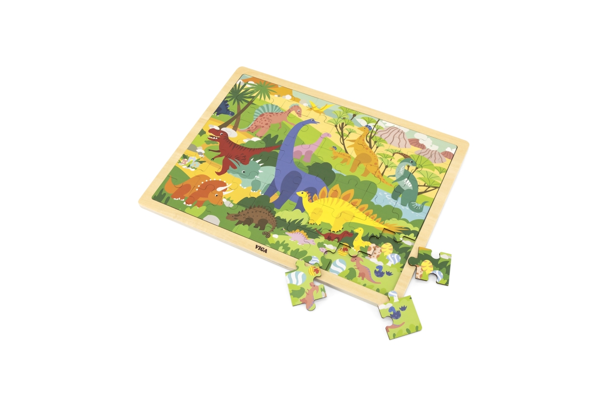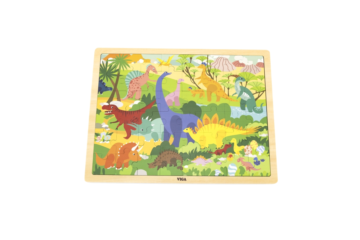Dřevěné puzzle s obrázkem dinosaurů. Celkem 48 dílků. Rozměry obrázku cca 40 x 30 cm. Rozměry balení cca 40 x 34,5 x 1 cm.