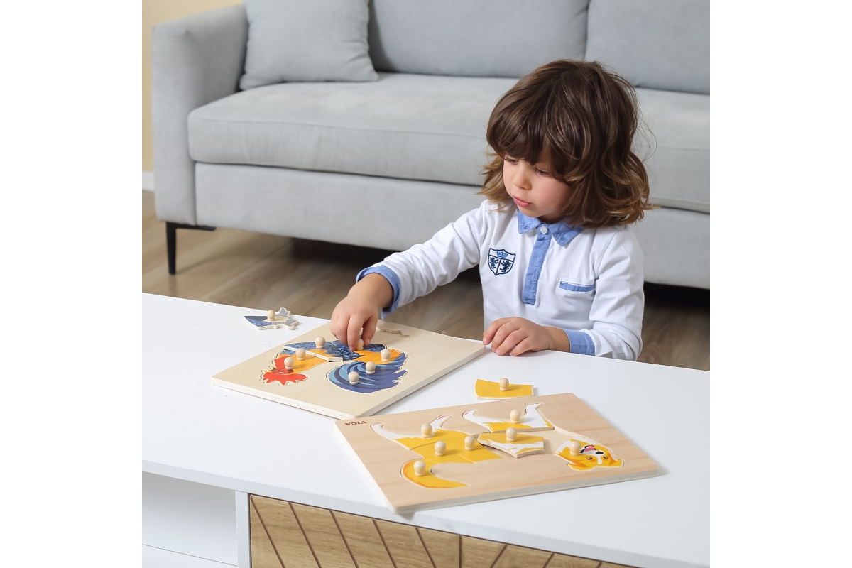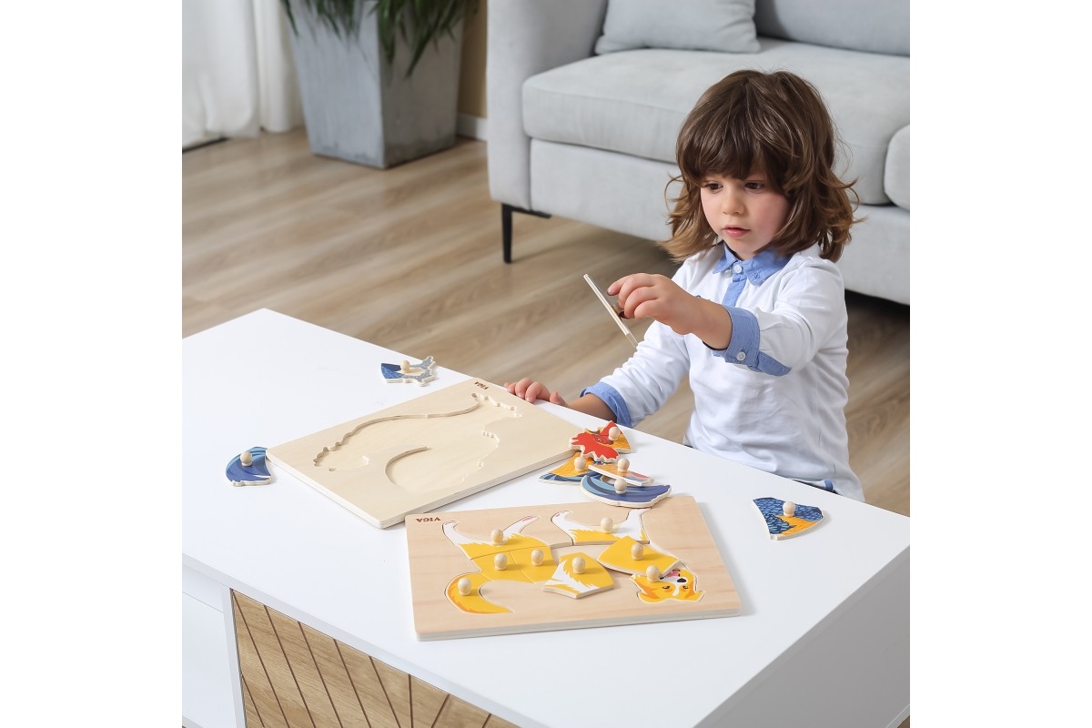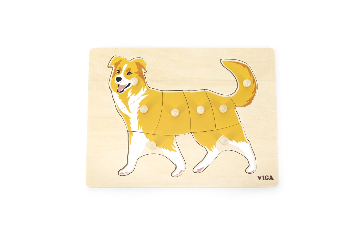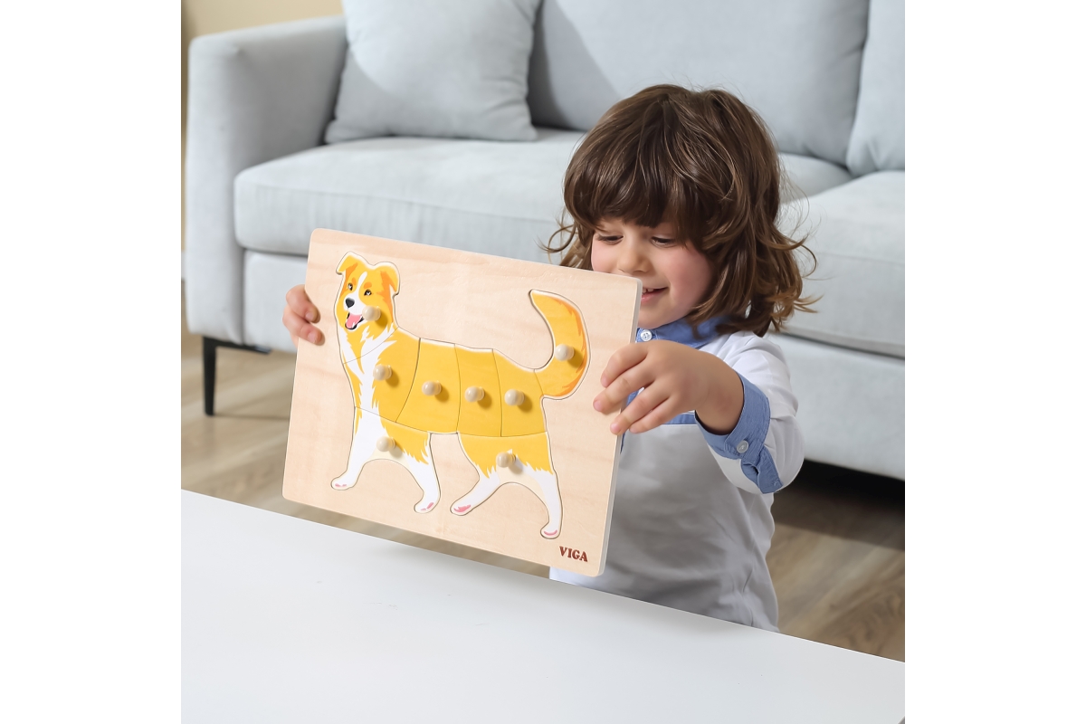 Dřevěná vkládačka s motivem psa. Rozměr dřevěné desky cca 30 x 22,5 cm. Rozměr balení cca 30 x 22,5 x 2,5 cm. Věk 18m+..